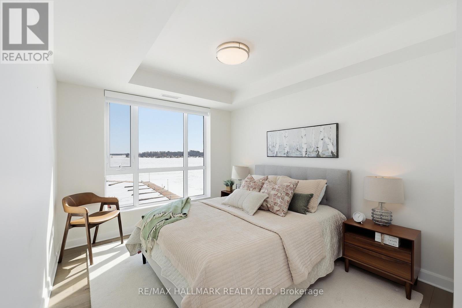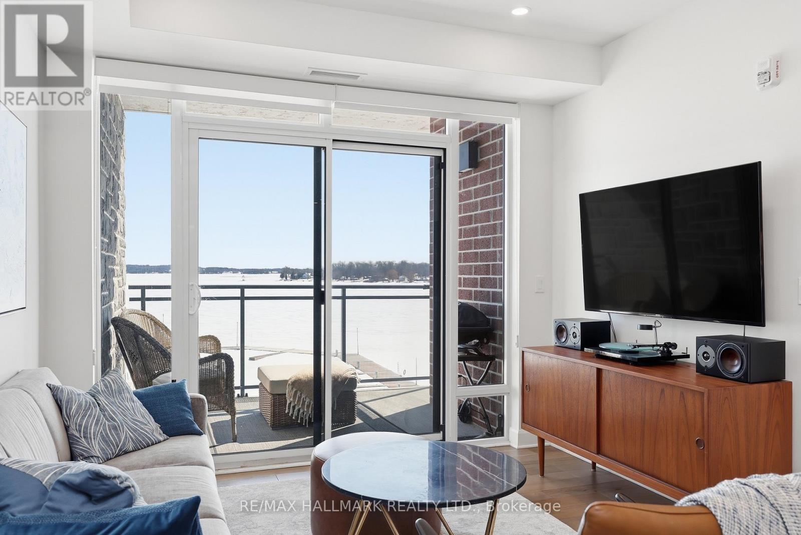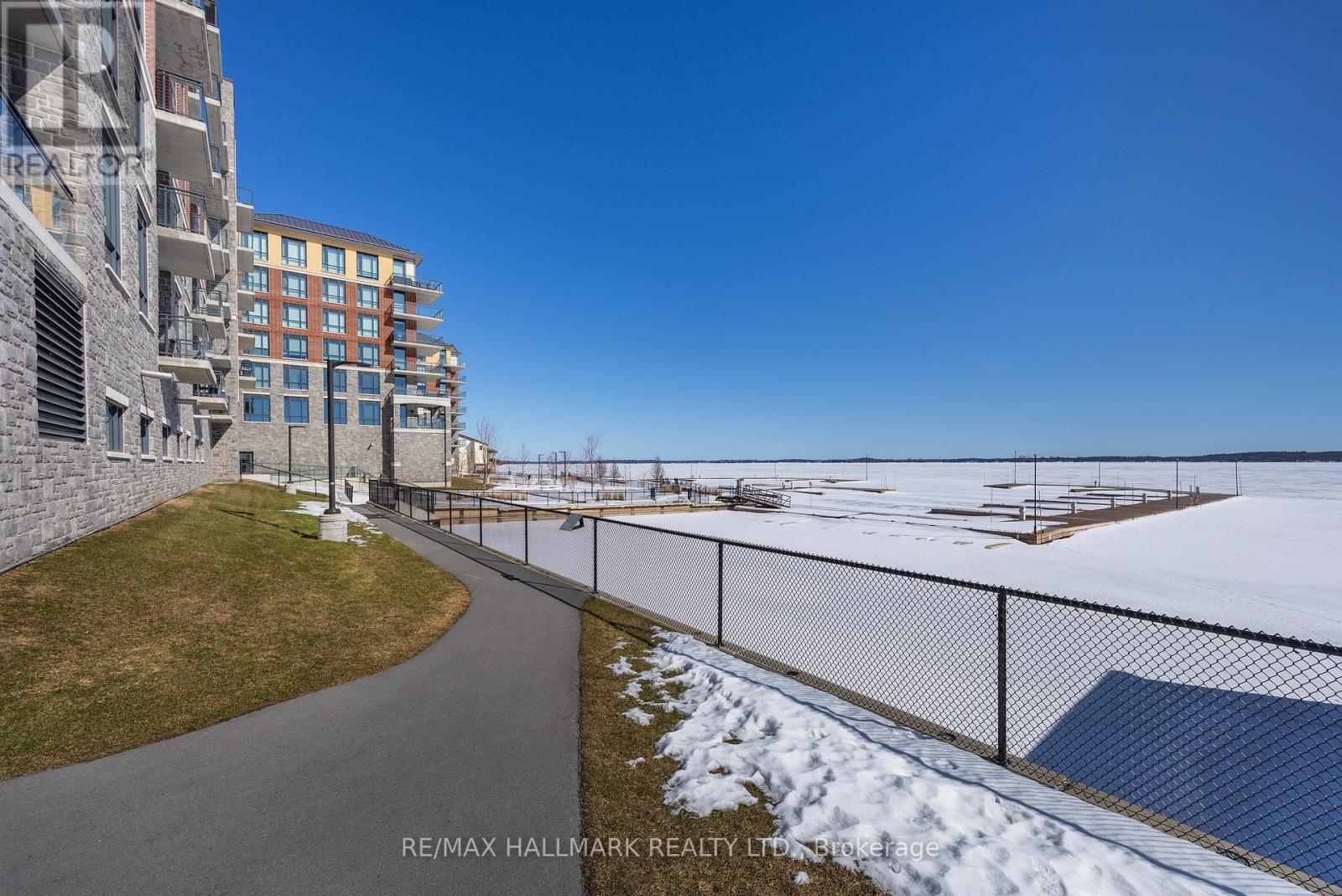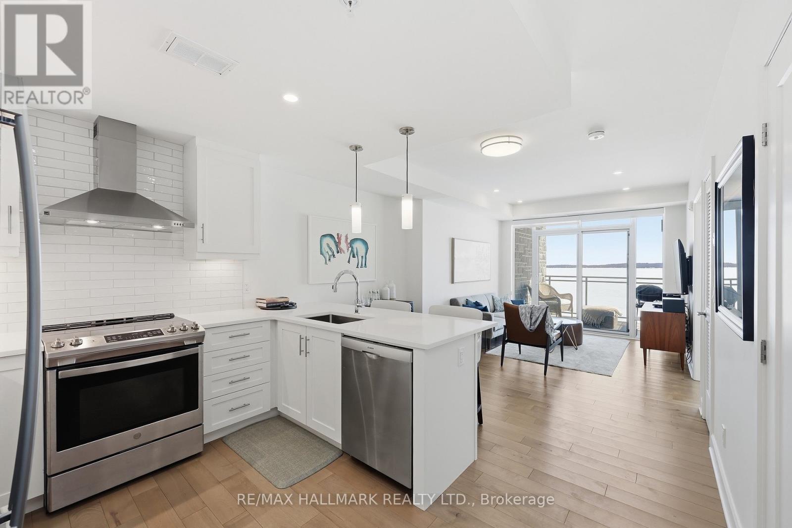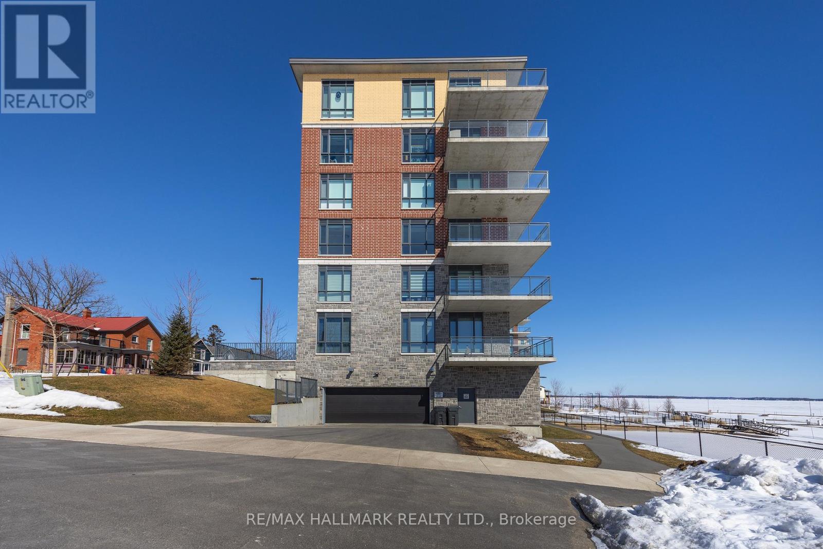 Modern 1000 Islands Lifestyle ~ water, trees & wildlife. Come & experience Stone & South on the St. Lawrence River. Designed for an active, easygoing lifestyle, this 1-bedroom + den offers a comfortable & convenient waterfront retreat. Features include; smooth ceilings, hardwood floors, quartz counters, and well-proportioned rooms filled with abundant natural light. The practical 802 sq ft layout includes a private balcony with unobstructed southwest water views, while the flexible den space adapts easily as a home office, a dedicated dining area, or a cozy guest room. Convenient underground parking with easy access to a large format storage locker. Built by CaraCo & designed by Chamberlain Architect in 2021, the building amenities include; fitness centre, party room, visitor parking, BBQ patio, and marina access. Efficient central heating & A/C energy incl. in maintenance fee. The 1000 Islands diverse & welcoming community that offers boating, golf, kayaking, swimming, fishing, hiking & so much more! Set in the historic town of Gananoque & steps from Thousand Islands Playhouse. Enjoy community events, walkable shops, pubs, dining, and outdoor sight-seeing. And for those that need a bigger city fix, historic Kingston is only 25 mins away, while Toronto, Ottawa & Montreal are a reasonable cottage drive. Life is better in the Islands! (id:4555)