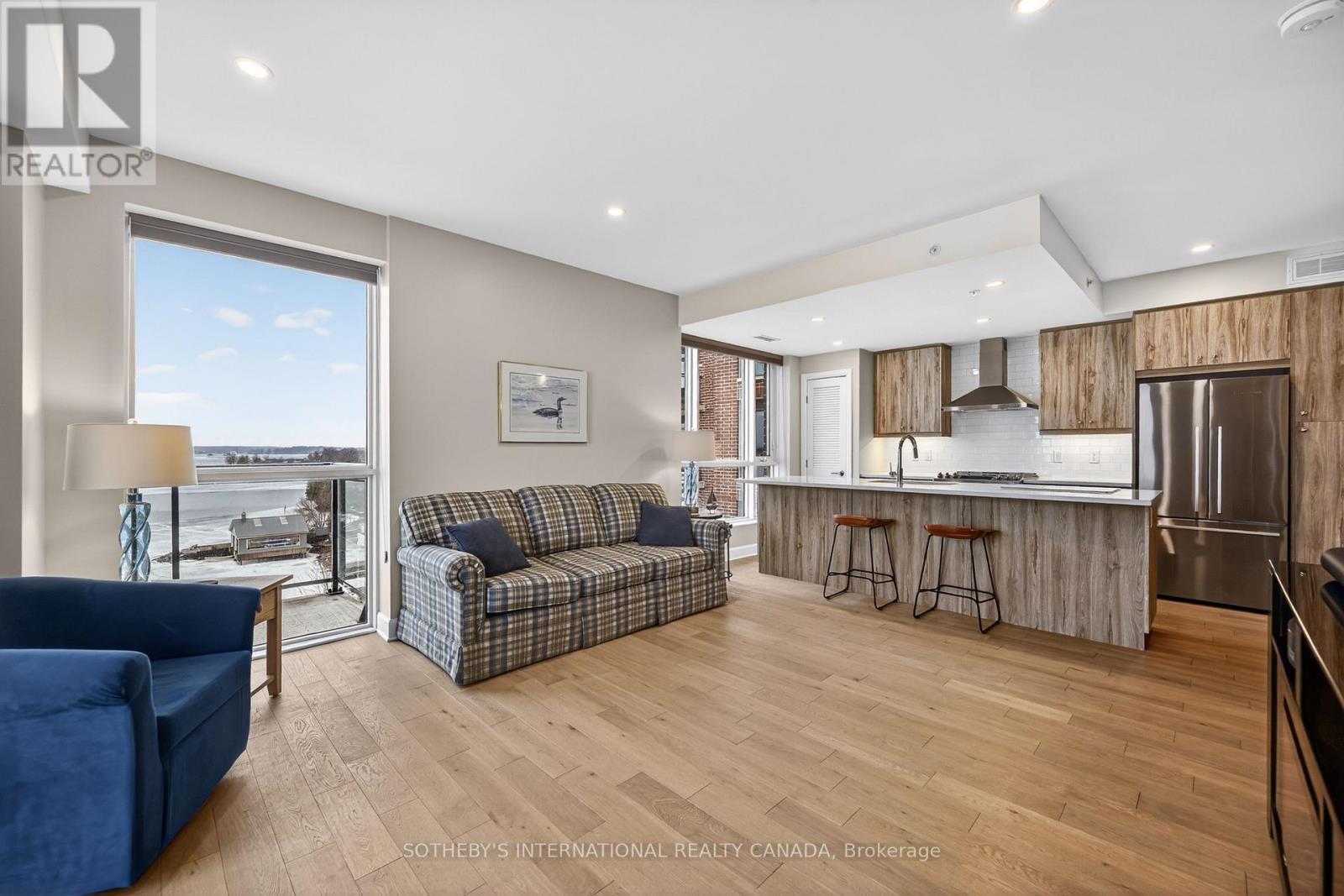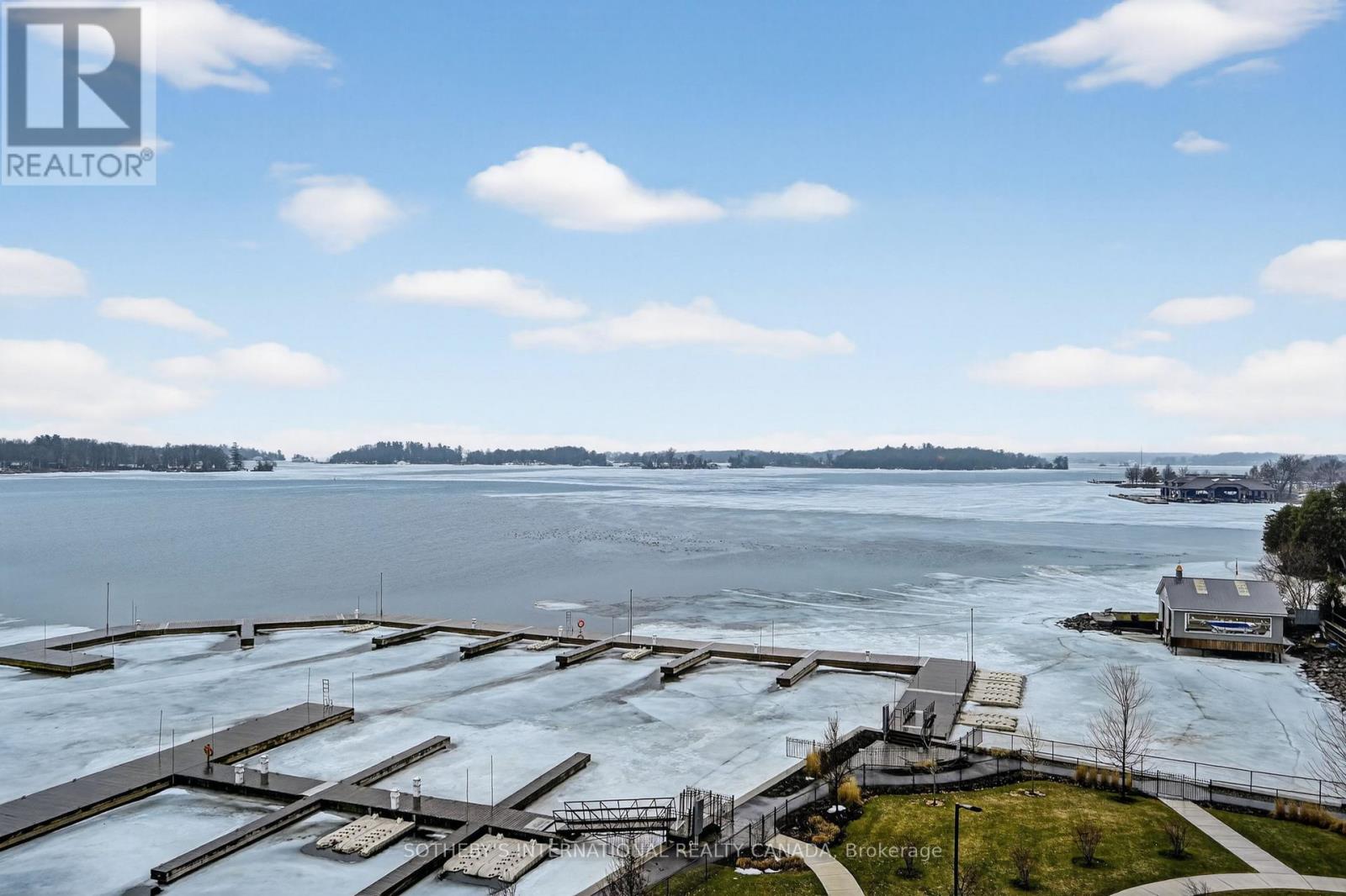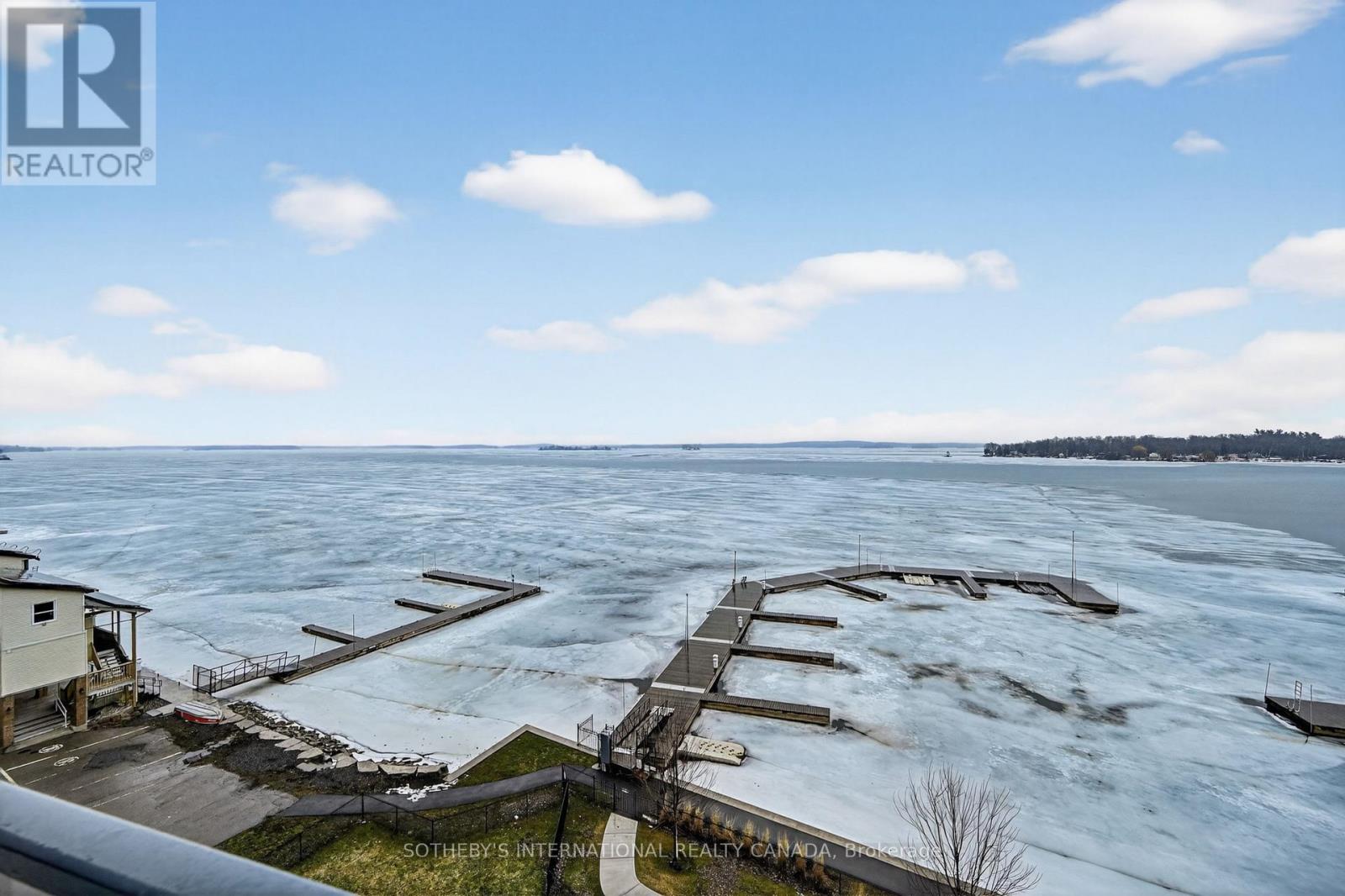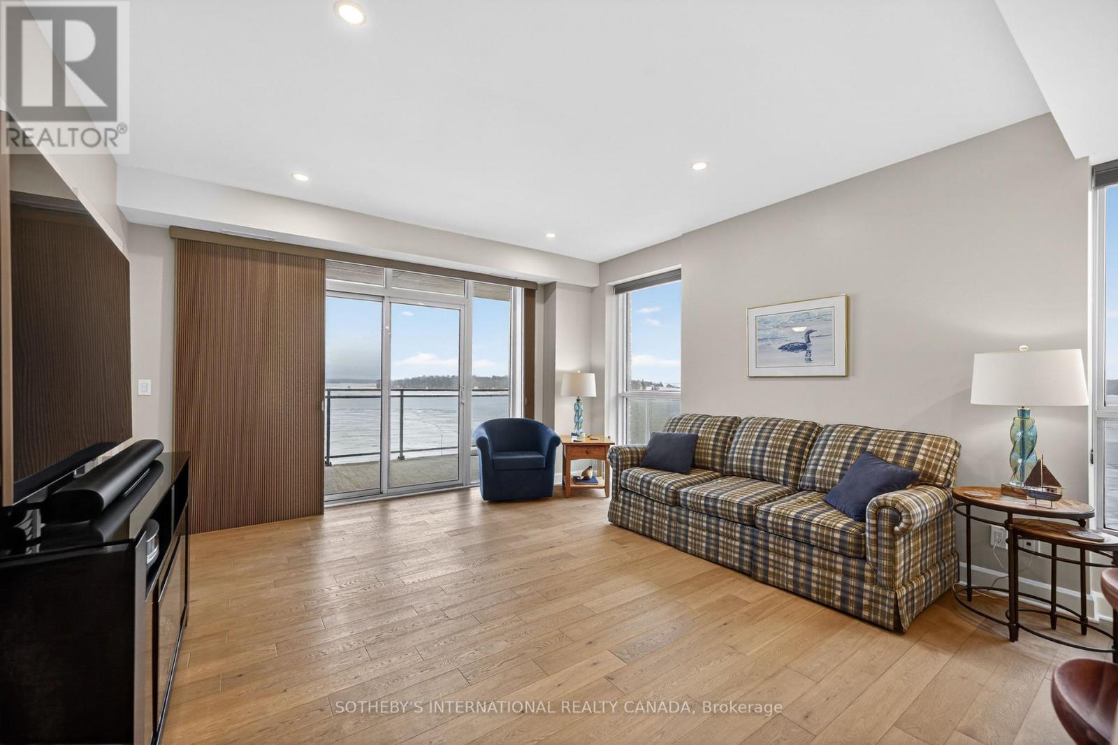 Take note of this luxury Thousand Islands Waterfront 2 bedroom 2 bathroom Condominium available with flexible possession. Imagine spending the summer by the river with marina access and within walking distance of everything you need to enjoy the beauty and charm of this unique area. Your condo features hardwood and ceramic floors, a chef's dream kitchen with an extended island and added cupboard space, in-suite laundry, an ensuite bathroom with heated floors and most importantly, a panoramic view of the St. Lawrence River with a wraparound balcony to fully enjoy it. Click through the photos or take the tour to see how the outdoors pours into all the bright, airy spaces. Temporary rain keeping you indoors? Slip downstairs to the common room for a game of pool or some social interaction, hit the high-end gym/workout space or simply watch the clouds roll by from your floor to ceiling windows. Walk to the Thousand Islands Playhouse, restaurants and all the cultural panache Gananoque has to offer. Your storage locker is just down the hall for easy access. The perfect setup for years of enjoyment is waiting for you. Book a showing today. (id:4555)