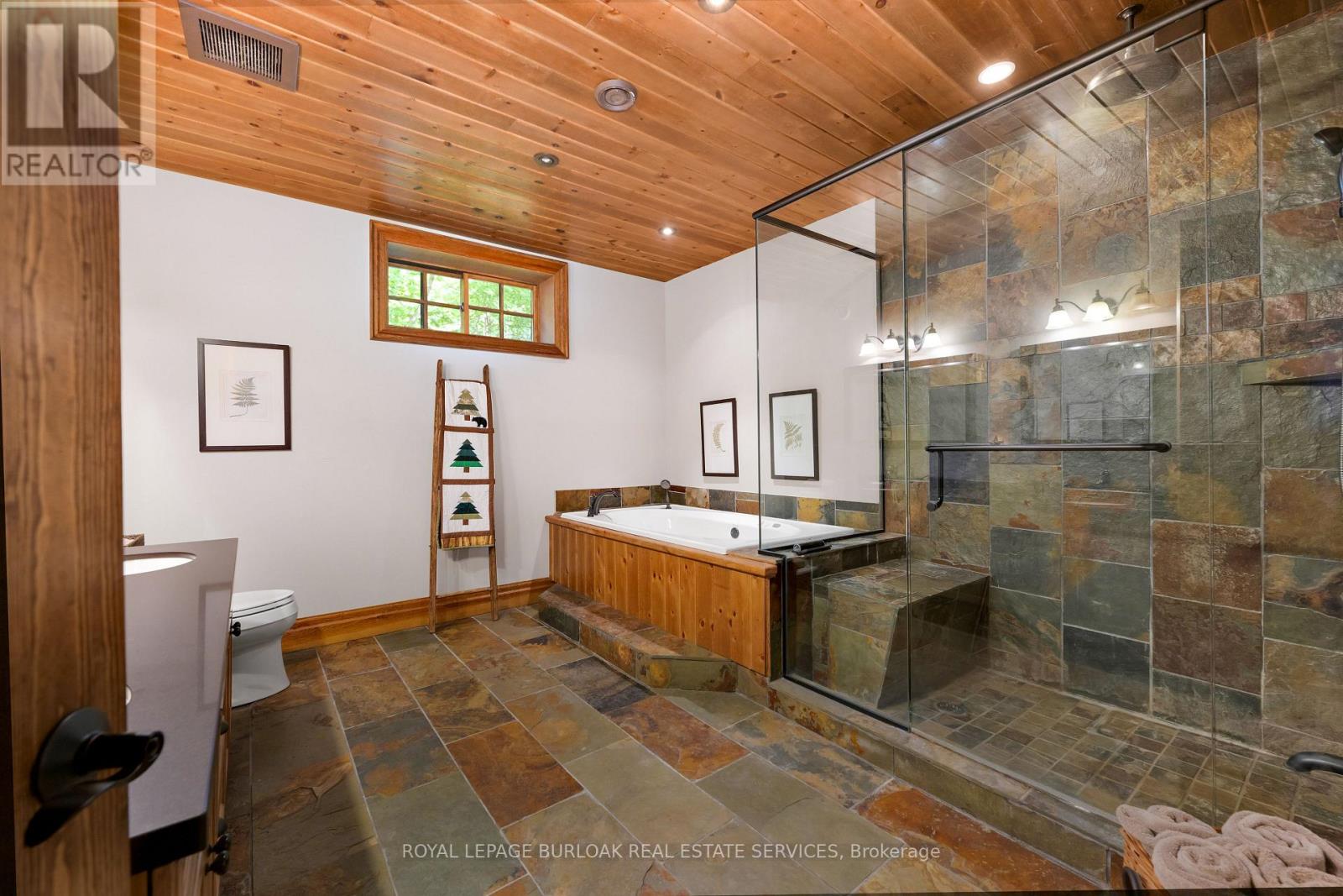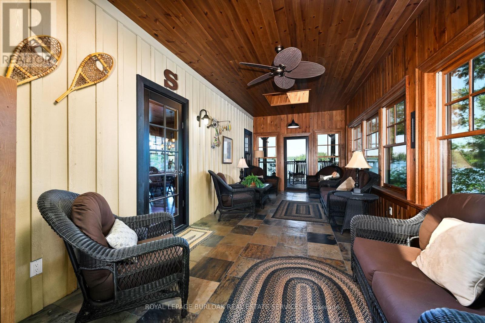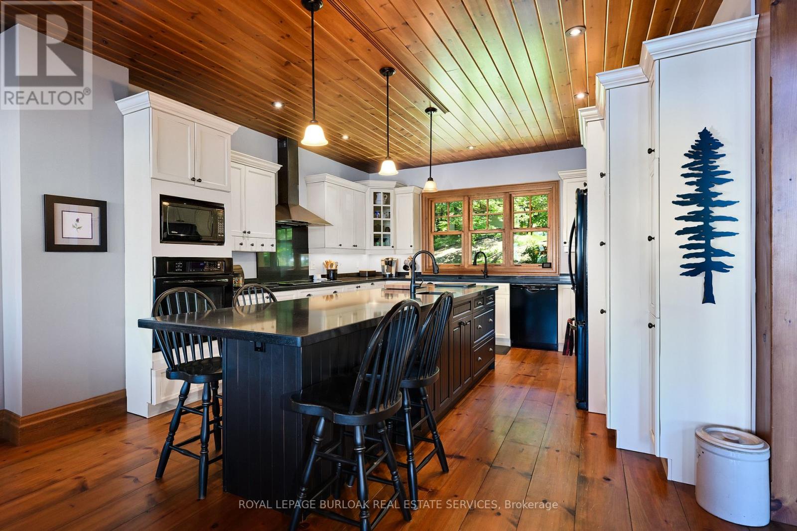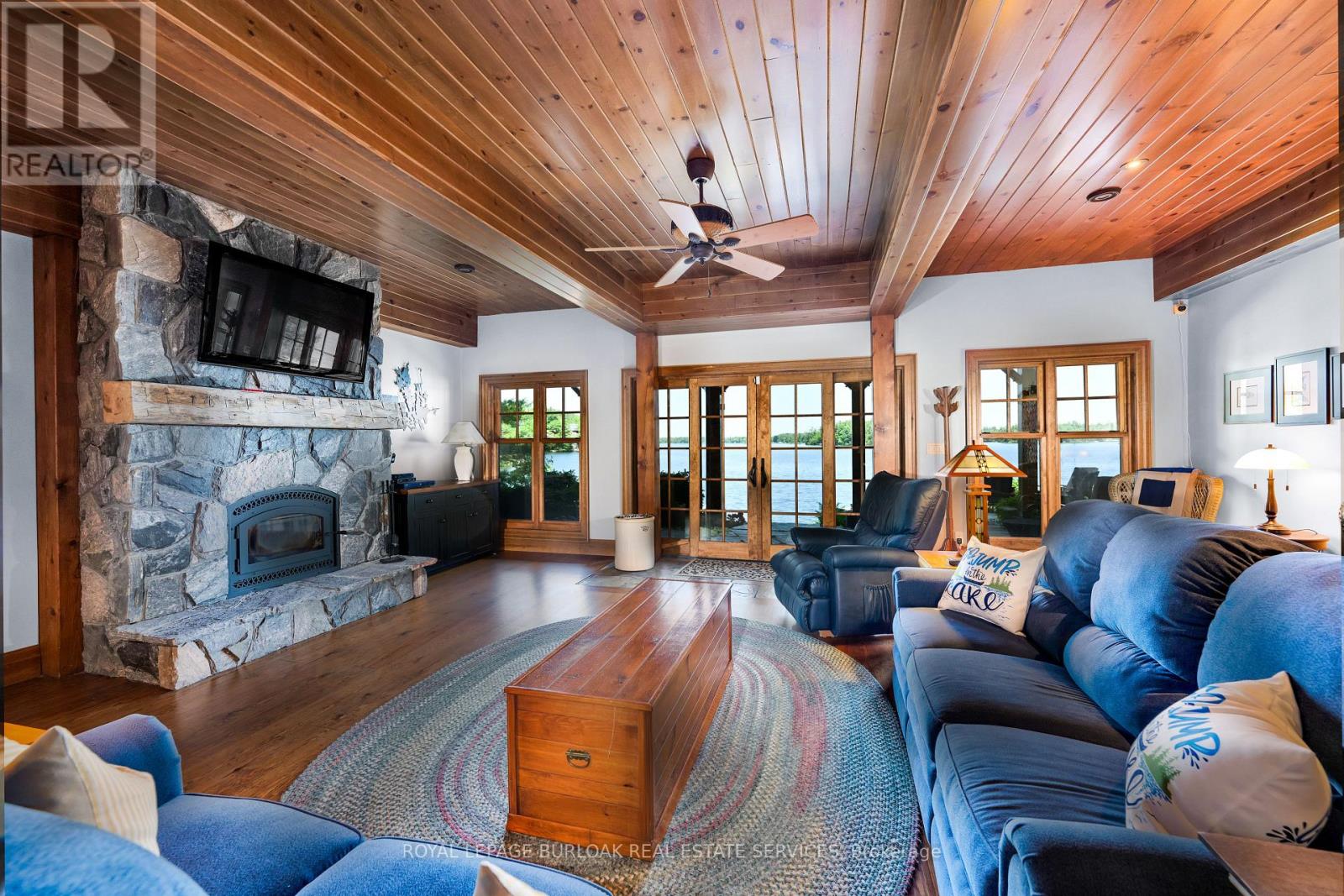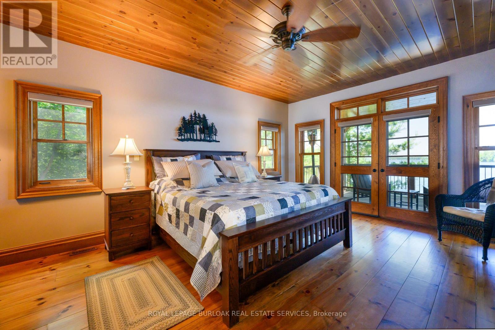 Remarkable Muskoka lakeside retreat on Six Mile Lake, on year-round municipal road, only 90 minutes from GTA. Impressive custom-build w/stunning lake views may be most prestigious property on "the mile." Expansive 333ft of prime, deep waterfront, 1.66 acres w/mature trees & privacy, & absolute show-stopper 6000 sqft, 6 bedrm lake house w/gorgeous pine detail T/O. Open-concept main lvl overlooks lake & accesses the 68x12 covered deck, & includes the kitchen w/quartz CTs & 11ft centre island w/breakfast bar, great rm w/granite stone F/P & 22ft vaulted ceiling, spacious dining rm, main floor primary bedrm w/6pce ensuite, Muskoka rm,2pce bath, & mud rm/laundry rm. 2nd lvl has a den/office, & 2 very large bedrms that could be converted to 4 if desired. Walk-out lower lvl offers a family rm w/granite stone F/P, bar area w/seating for 6, 3 more large bedrms, 8pce bath, & sliding doors to patio & lake. Red Pine &slate floors T/O, 10ft ceilings & in-floor heating on main & lower lvl, pine ceilings, & post &beam construction & ICF foundation, all display the care in this magnificent homes design. Exterior offers an oversized double garage w/600sqft man cave/loft w/heat & AC, triple garage w/2 insulated & heated, & another single garage at side of property, plus parking for 20 more on driveways. Clear & pristine waterfront 6-12ft deep off docks, + bonus shallow wading area at side. 1500sqft of decks & docks along water, including U-shaped boat slip engineered to support a boathouse, plus 1400 sqft of covered deck & patio overlooking the water, & 450 sqft of deck at back of home, totalling over 3350 sqft of decking & patio. NE exposure at waterfront provides beautiful sunrises &sunsets. 280 sqft bunkie at water's edge. Systems include geothermal heating/cooling, drilled well w/complete water system, bio-filter septic system, on-demand water heater, & generator. Floor plans, boathouse drawings, & full write-up & details of the property available. (id:4555)