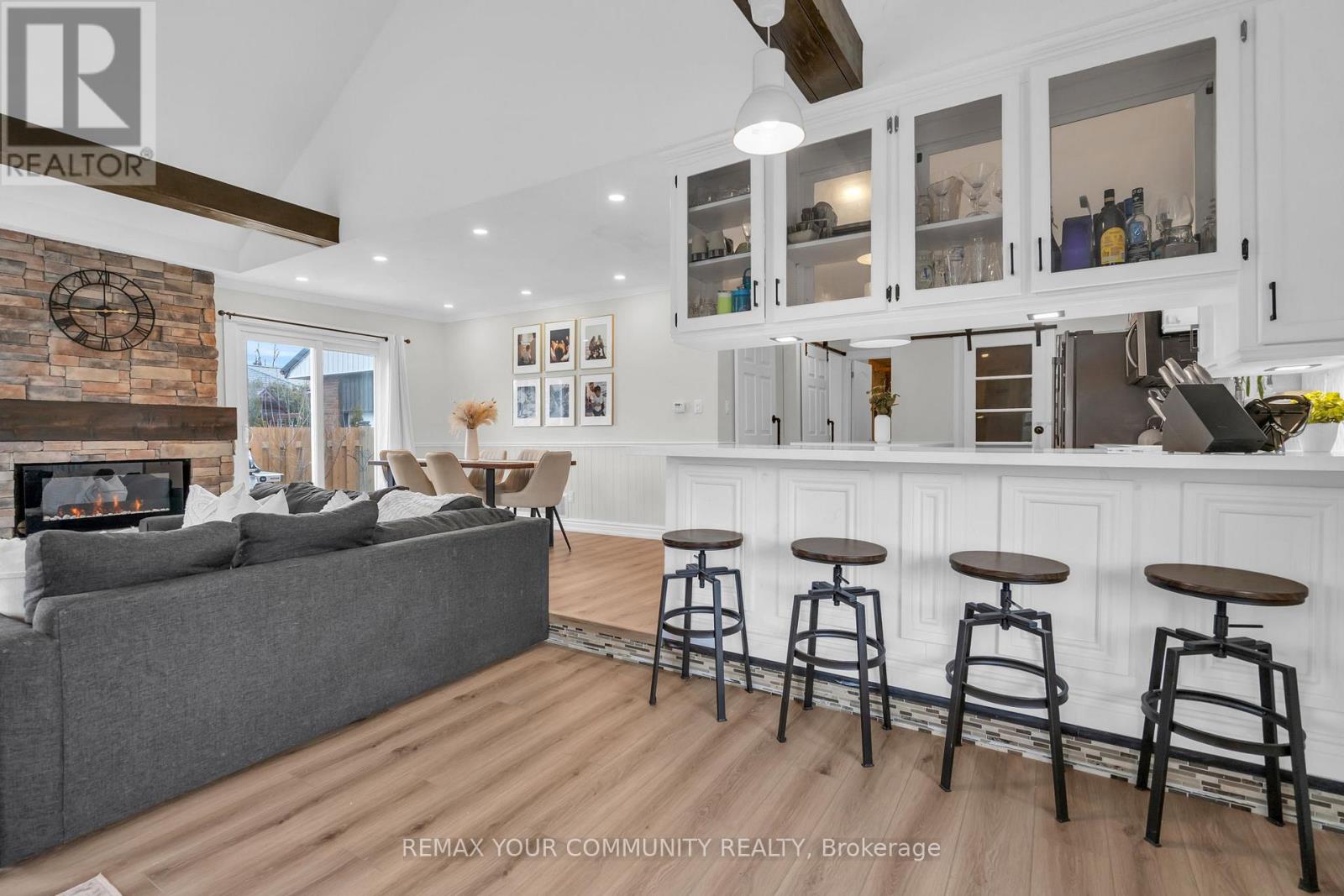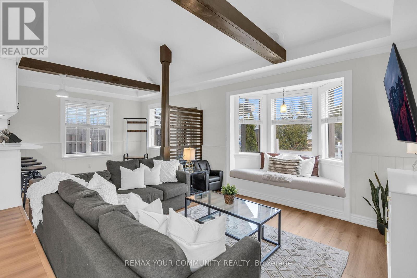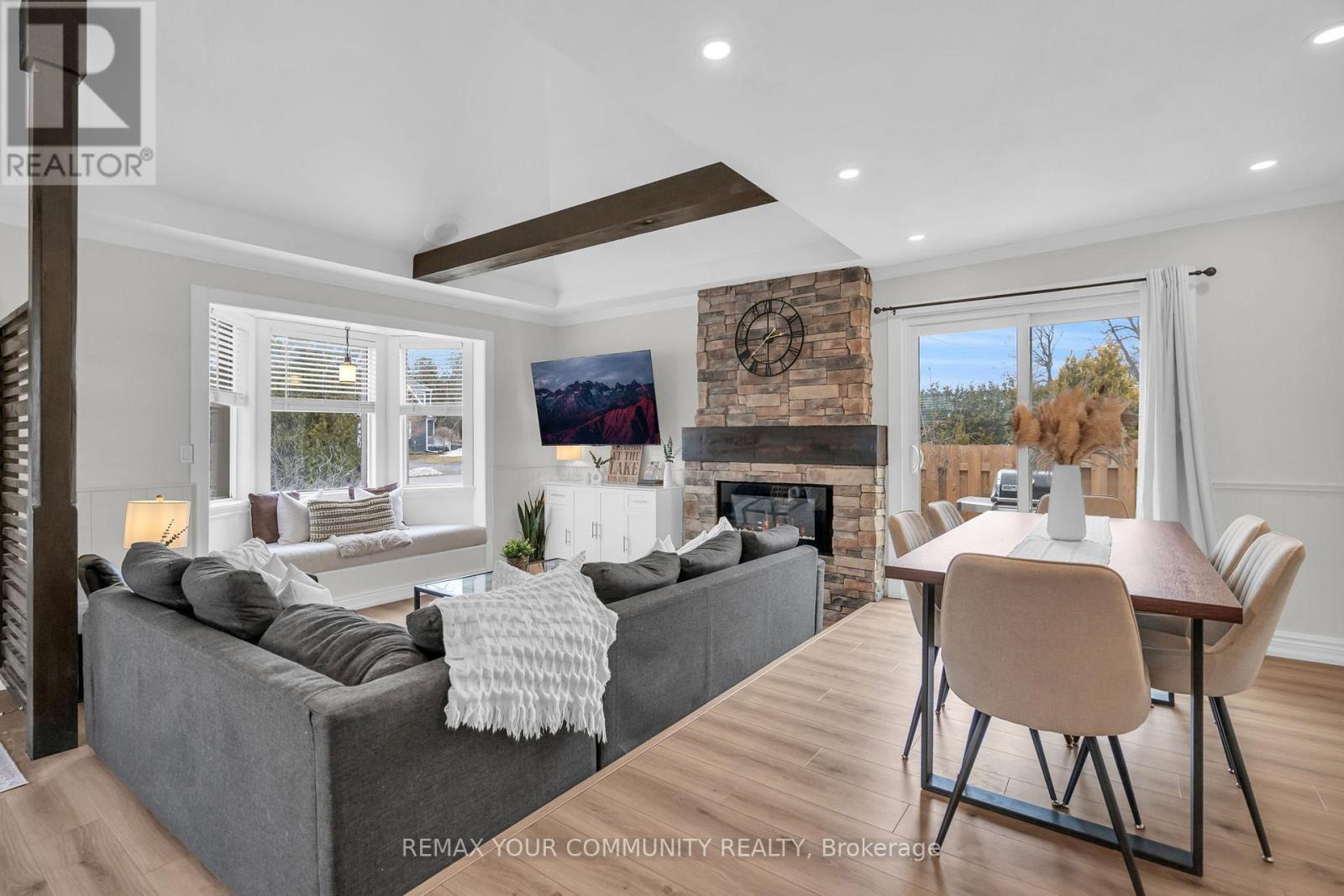 Just steps from Lake Simcoe with exclusive residents only lake access, this well maintained home features a bright updated kitchen with quartz countertops, new flooring throughout the main floor, fresh paint, and plenty of natural light. The sunken living room is full of character with cathedral ceilings, wooden beams, a cozy bow window nook, and a beautiful new fireplace feature. The spacious primary suite offers a private ensuite and walkout to a balcony perfect for peaceful mornings. Sliding doors off the dining room lead to a fully fenced, beautifully landscaped backyard with a spacious driveway that leads right to the back, a shed for extra storage and a large detached garage with heat & hydro. Located in a sought after lakeside community, this home is perfect for relaxed living near the water. (id:4555)