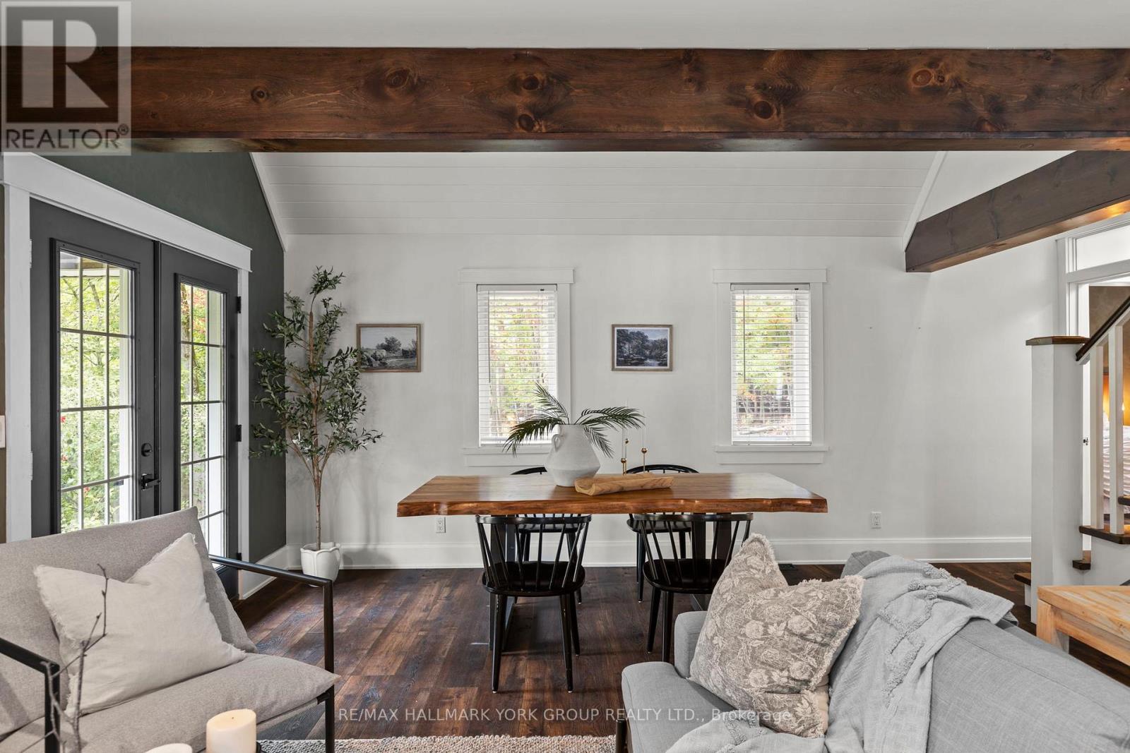 Nestled on a peaceful 0.76 acre, park-like property, this Muskoka retreat blends comfort, charm and quiet serenity. The 1,694 sq ft chalet-inspired home, offers 3 bedrooms and 3 bathrooms, designed for relaxed living and gatherings. Inside the home, a modern rustic atmosphere flows through with wide-plank hardwood floors, exposed beams and thoughtful touches like a classic clawfoot tub. The main floor primary suite feels like a private hideaway with vaulted ceilings a spa like 3 piece ensuite featuring a stone shower, a walk-in closet, all overlooking a large patio. Upstairs the vaulted loft offers a cozy space to relax or entertain accompanied by two additional bedrooms and a full 4 piece bathroom. A rare triple-car detached garage with heated radiant slab flooring and a bright 500 sq. ft. loft above provides endless possibilities - from a studio, gym or office to a future coach house, as services and plumbing rough-ins are already in place. Below, a clean and functional 5' crawlspace provides storage and houses the home's services, insulated with spray foam and finished with a concrete floor for durability. Recent updates give peace of mind, including a newer roof (2016), on demand water heater (2018), fresh kitchen counters (2023), a new furnace (2023) along with tasteful cosmetic upgrades that add to the home's welcoming feel. Located just minutes from town on a paved year-round road, this property offers the best of Muskoka living - tranquil country privacy with all the conveniences of municipal services and high-speed internet. A perfect blend of cozy retreat and everyday comfort, this is a place to slow down, breathe and truly feel at home. (id:4555)