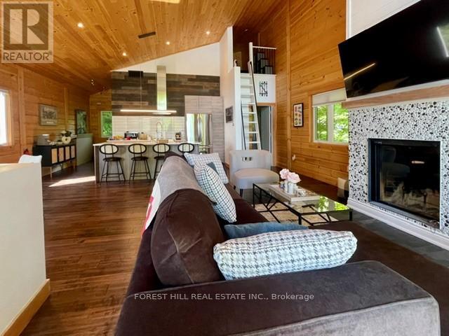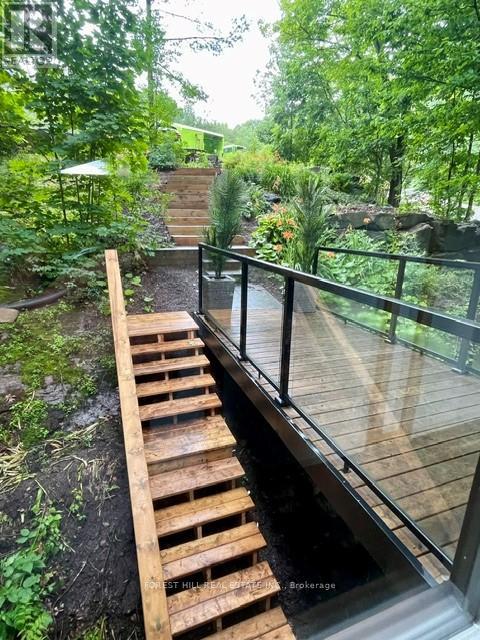 Offering 3+1 bedrooms & 2 bathrooms, the interior is highlighted by a bright, open-concept layout with impressive 22-foot ceilings & expansive windows that frame stunning lake views & fill the space with natural light. The kitchen is thoughtfully designed for both everyday living & entertaining, featuring granite surfaces, stainless steel appliances, & a large island with plenty of seating. A wood-burning fireplace anchors the main living space, creating a warm & inviting atmosphere throughout the seasons. Upstairs, a private composite balcony with glass railings provides a quiet place to unwind & take in the surrounding landscape. The primary bedroom includes a walkout to the rear deck & a rough-in for a future ensuite. Recent updates completed in 2024 add even more value, including a newly finished bathroom on the ground level & a newly installed steel staircase, offering both function & a modern aesthetic. The outdoor setting has been extensively enhanced with professionally designed landscaping by a top-tier firm, creating a polished yet natural environment. Multiple stone patio areas & a fire pit provide ideal spaces for entertaining or relaxing outdoors, all surrounded by mature trees for added privacy. The waterfront is exceptionally user-friendly, with a shallow sandy entry ideal for families, along with a Dock-in-a-Box system for convenient access to Lake Muskoka & its vast boating network. A matching bunkie at the water's edge offers additional space for guests or a quiet escape. Located just minutes from Muskoka Bay Resort, as well as the shops, dining, & waterfront attractions of Gravenhurst, this property offers both seclusion & convenience-an ideal setting to enjoy everything Muskoka has to offer. (id:4555)