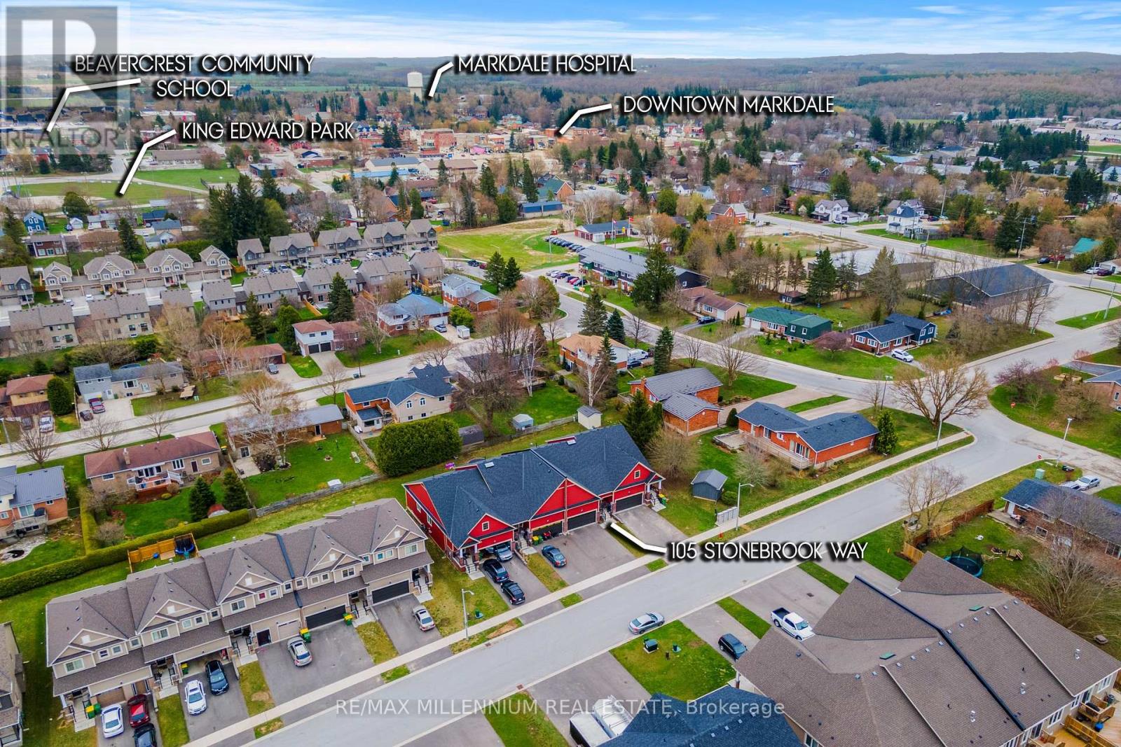 Welcome to your dream home in the heart of Markdale! This beautifully designed bungalow townhome offers a spacious, thoughtfully planned layout with premium upgrades, perfect for modern living. Step inside to an open-concept living area filled with natural light, soaring9-foot ceilings, featuring engineered hardwood floors, quartz countertops, and stainless steel appliances. The chefs kitchen showcases a stylish island, ideal for meal prep or casual dining, while the spacious family room provides a warm and inviting space for relaxation and entertainment, complete with an upgraded fireplace for cozy evenings. Two generously sized bedrooms include a primary retreat with a walk-in closet and a private ensuite for ultimate comfort, while the additional bedroom features skylight windows and a 4-piecebath, ensuring ample space for family or guests. A fresh air system runs throughout the home, enhancing comfort year-round, and main-level laundry adds everyday convenience. The unfinished lower level, complete with a 3-piece rough-in, offers endless potential for a future home office, recreation area, gym, in-law suite, or even an income-generating unit. Parking is no issue with a 6-car driveway and an oversized 2-cargarage featuring a garage door opener, backyard access, and direct interior entry. This freehold end-unit property comes with no monthly fees or POTL fees, giving you the freedom to truly make it your own. Ideally located in the heart of Grey County, you'll enjoy easy access to hiking, skiing, golf courses, the Curling Club, Beaver Valley Ski Club, and the stunning Georgian Bay, all while being just minutes from shopping, schools, grocery stores, banks, the new Markdale Hospital, and Chapman's Ice Cream headquarters. Offering the perfect blend of style, comfort, and convenience, this easy-living freehold townhome is an exceptional opportunity miss your chance to call this beautiful property your home! (id:4555)