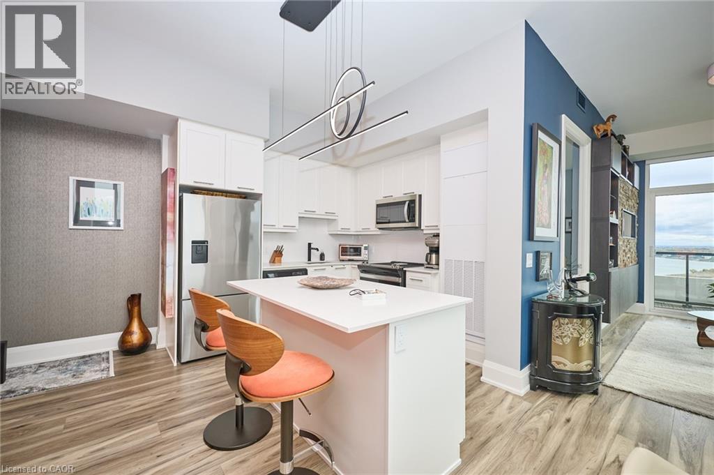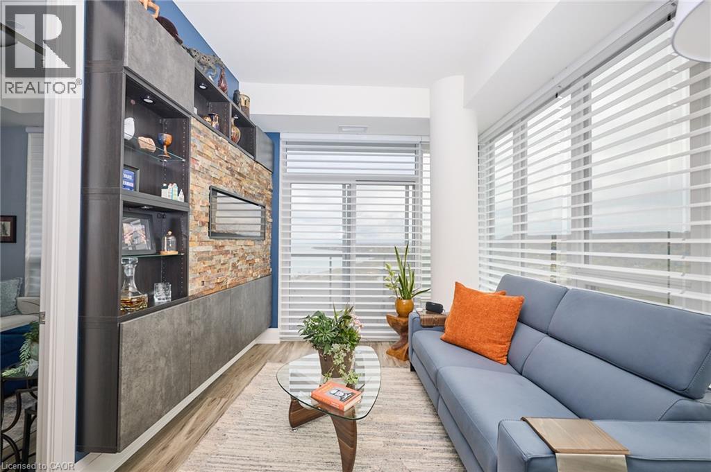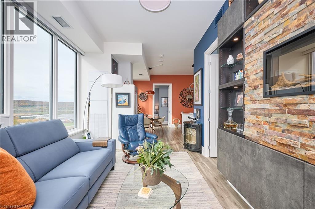 Perched high above the shoreline, this exceptional corner waterfront penthouse offers the refined comfort of a luxury residence paired with sweeping, unobstructed views of Lake Ontario and the Niagara Escarpment. Soaring 10-foot ceilings and expansive floor-to-ceiling windows flood the home with natural light, creating an inviting and sophisticated atmosphere throughout. Designed with entertaining in mind, the open-concept layout is complemented by premium flooring, designer-inspired bathrooms, and motorized Hunter Douglas remote blinds. The family room is anchored by custom built-in cabinetry and a striking fireplace, blending style and warmth. The living area flows effortlessly to a generous balcony—an ideal backdrop for morning coffee or sunset entertaining. Additional conveniences include two premium underground parking spaces located close to the elevator, along with access to an impressive collection of resort-style amenities. Residents enjoy a 24-hour concierge, rooftop terrace with BBQs and lounge areas, party room, fully equipped fitness centre, EV charging stations, and a dedicated dog spa for four-legged companions. Ideally situated steps from boutique shops, charming cafés, and fine dining, and just moments from conservation areas, marinas, local wineries, and major highway access, this location delivers an exceptional balance of lifestyle and convenience. This fully appointed penthouse suite represents a rare opportunity to experience the very best of waterfront living. (id:4555)