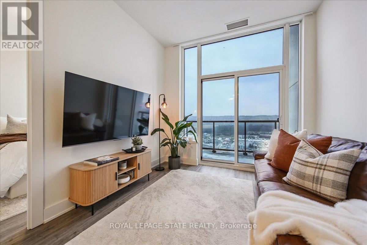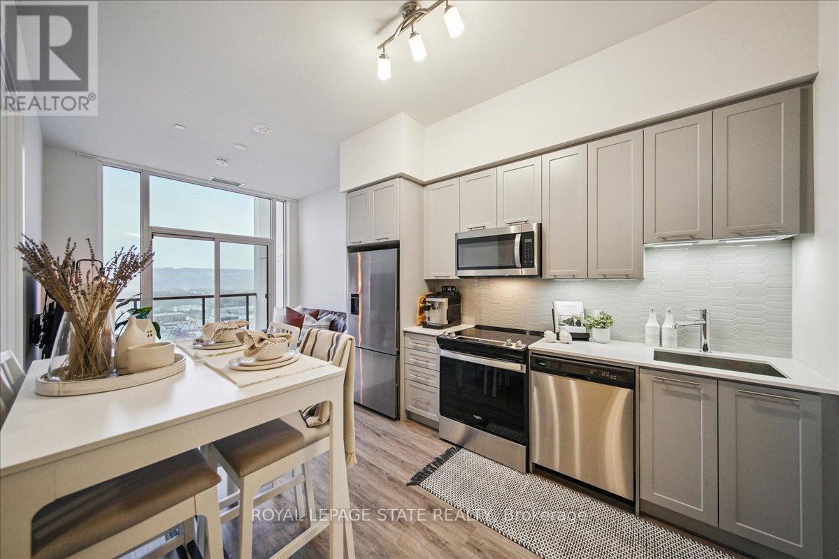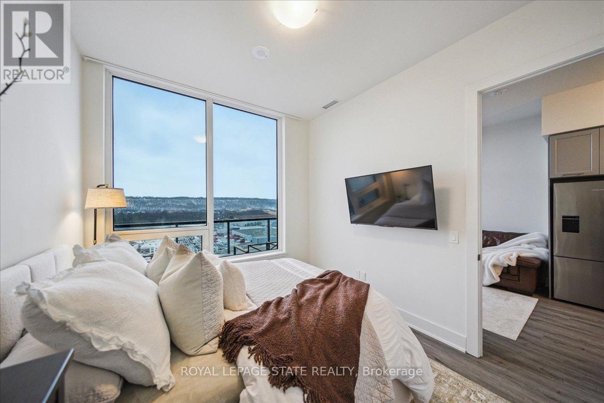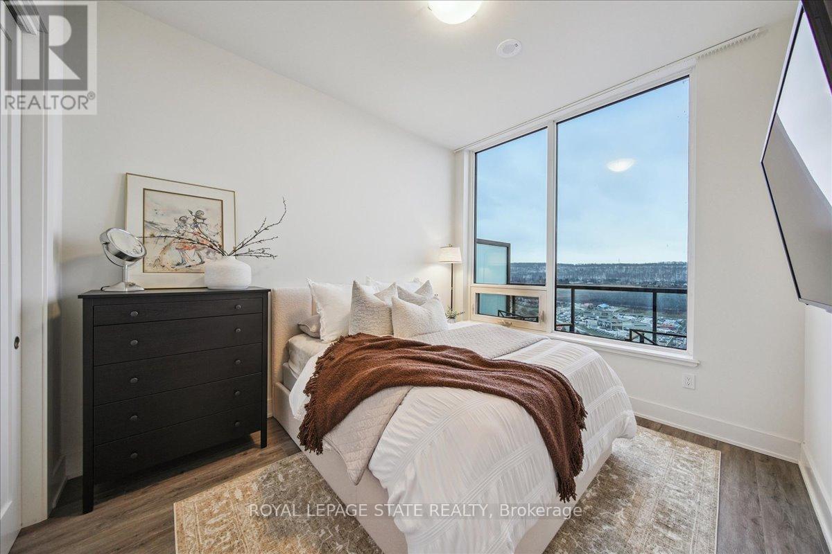 Bright, modern, effortless living with views that will take your breath away. Experience elevated lakefront living at #1901-385 Winston Road, a bright and beautifully finished 1(+ den) condo set high above Grimsby's waterfront community. This impressive top floor suite with 10 ft. ceilings is surrounded by natural beauty with Lake Ontario glistening to the north of the building and the Niagara Escarpment rising to the south, providing breathtaking views . Step inside and immediately feel the openness created by expansive windows featuring southern exposure giving an abundance of natural light. The modern kitchen flows seamlessly into the living space, creating the ideal layout for relaxing, hosting, or working from home. The versatile den is perfect as a home office, guest space, fitness nook, or storage zone, giving you flexibility that adapts to your lifestyle. Convenience comes built-in with in-suite laundry, private locker and TWO underground parking spots, a rare and valuable perk in condo living. Professionally maintained and showing A++, this home is move-in ready and truly stands out. Situated in the heart of Grimsby-on-the-Lake, you'll step outside to scenic waterfront trails, boutique shops, cafés, dining, and quick access to the QEW for effortless commuting. (id:4555)