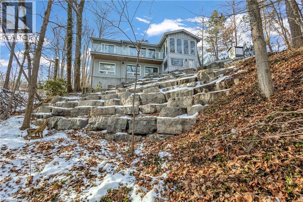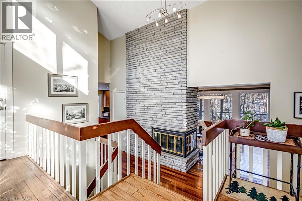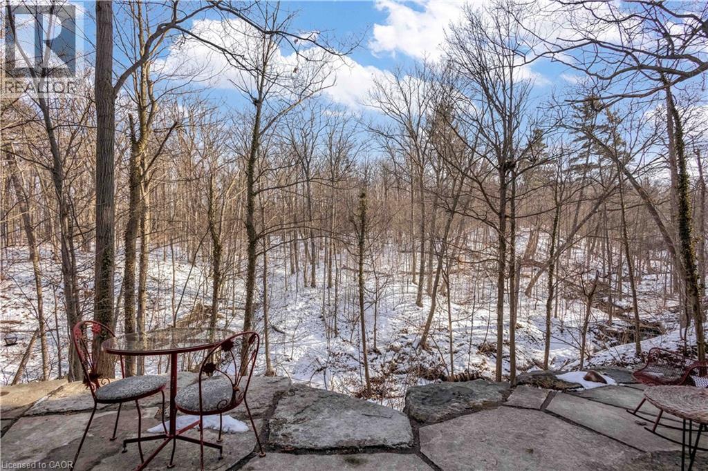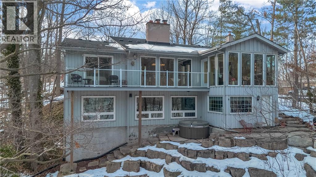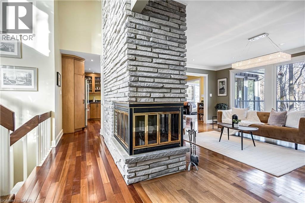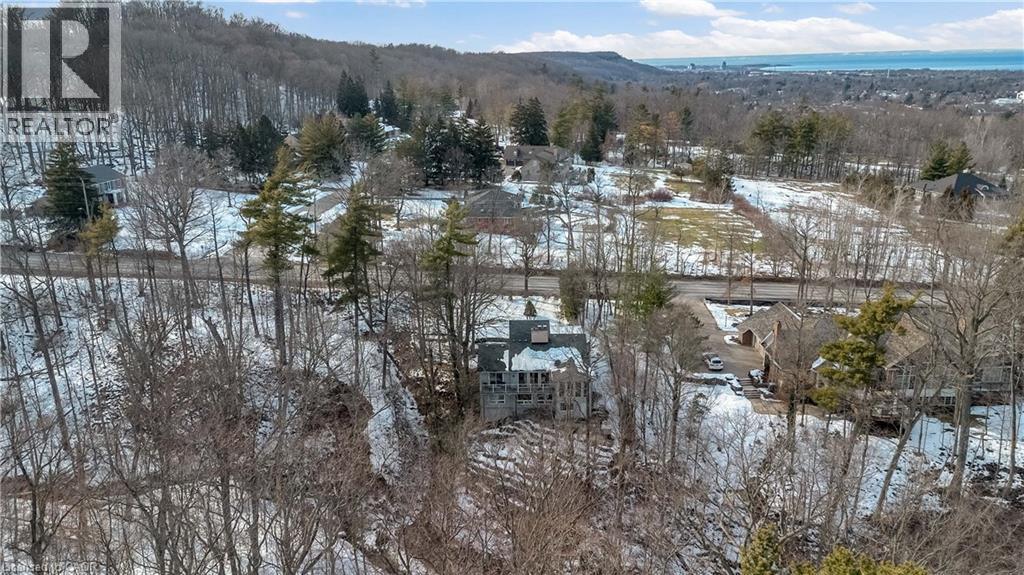 Tucked into the forest and backing directly onto the Bruce Trail and Grimsby Bench Nature Preserve, this ARCHITECTURALLY DISTINCTIVE retreat offers a RARE OPPORTUNITY to live completely immersed in nature — without sacrificing proximity to town, restaurants, and highway access. Designed for those who value COMPLETE PRIVACY, tranquility, and character over cookie-cutter living, every window frames a different woodland view, creating a true storybook setting throughout. A vaulted foyer welcomes you into a dramatic main living space featuring a striking three-way stone wood-burning fireplace, Brazilian hardwood floors, and walls of windows that blur the line between indoors and out. The thoughtfully designed kitchen balances everyday function with elevated entertaining, offering soapstone countertops, a 10-foot island with prep sink, custom detailing, and premium appliances including a Thermador gas range and steam oven, flowing seamlessly into a glass-enclosed sunroom and expansive balcony that stretches along the back of the home among the treetops. The upper level serves as a private primary retreat with balcony access, an oversized windowed dressing closet, and a spa-inspired bath featuring a jetted tub and infrared heat lamp for year-round comfort. The lower level provides exceptional flexibility with a spacious recreation room anchored by a second wood-burning fireplace, two additional bedrooms, a full bath, and a dedicated office with walk-out access ideal for remote work or guest accommodation. Outdoors, terraced stone landscaping, a pizza oven, hot tub, and direct forest access create a secluded escape, while an eight-car driveway and garage with inside entry add everyday convenience. This ONE-OF-A-KIND property is perfectly suited for buyers seeking a refined woodland lifestyle in one of Grimsby’s most desirable locations. RSA. (id:4555)