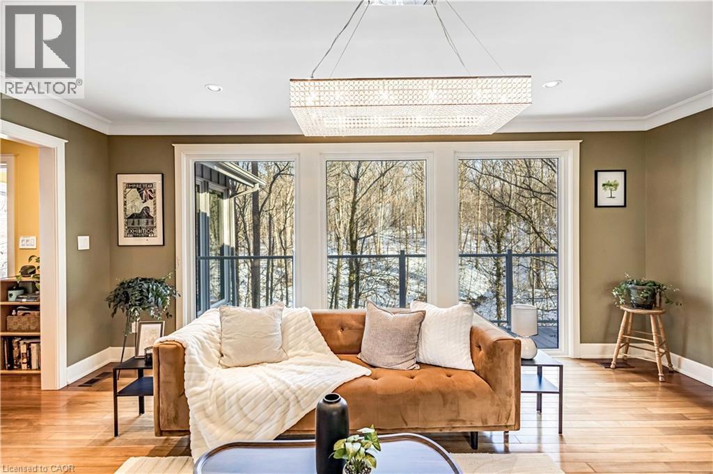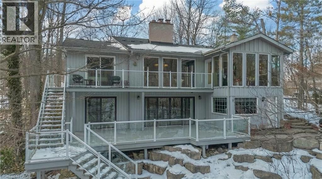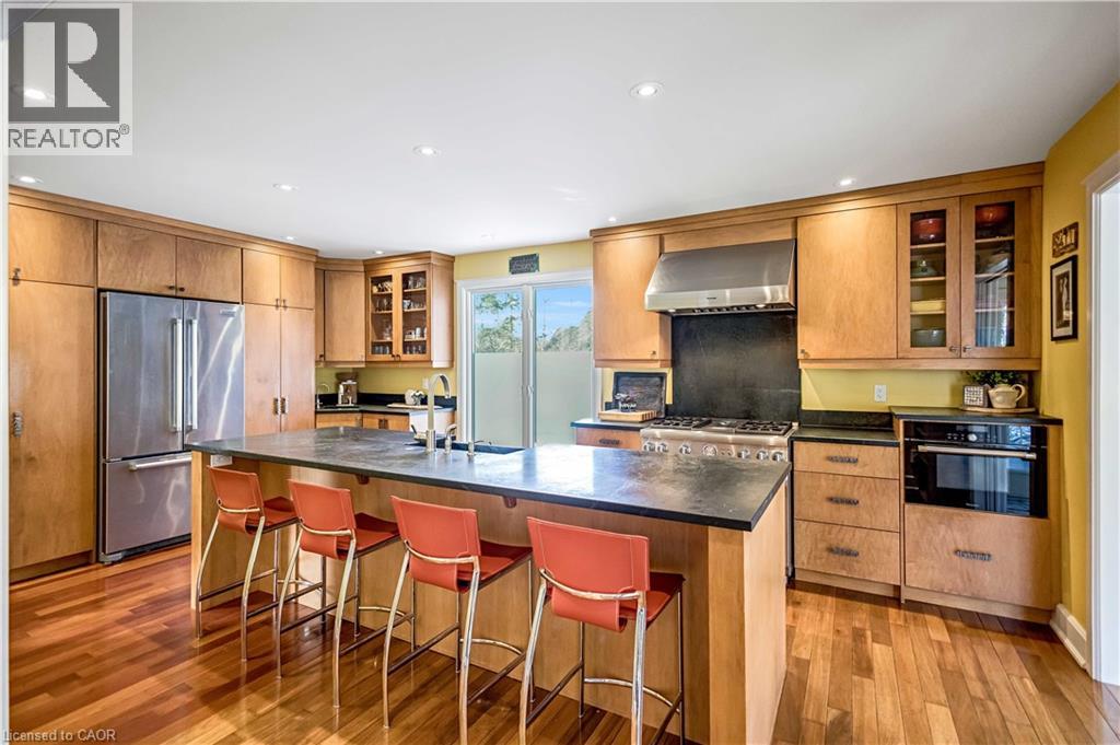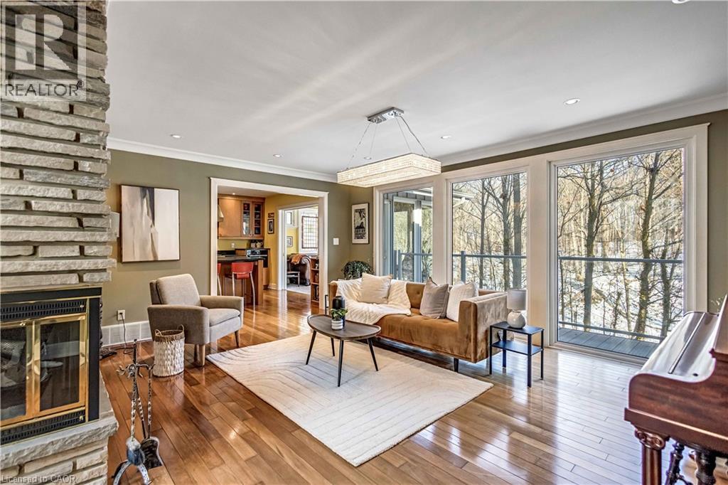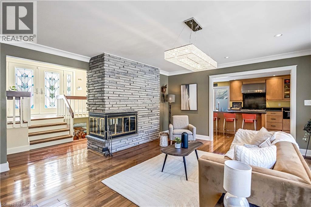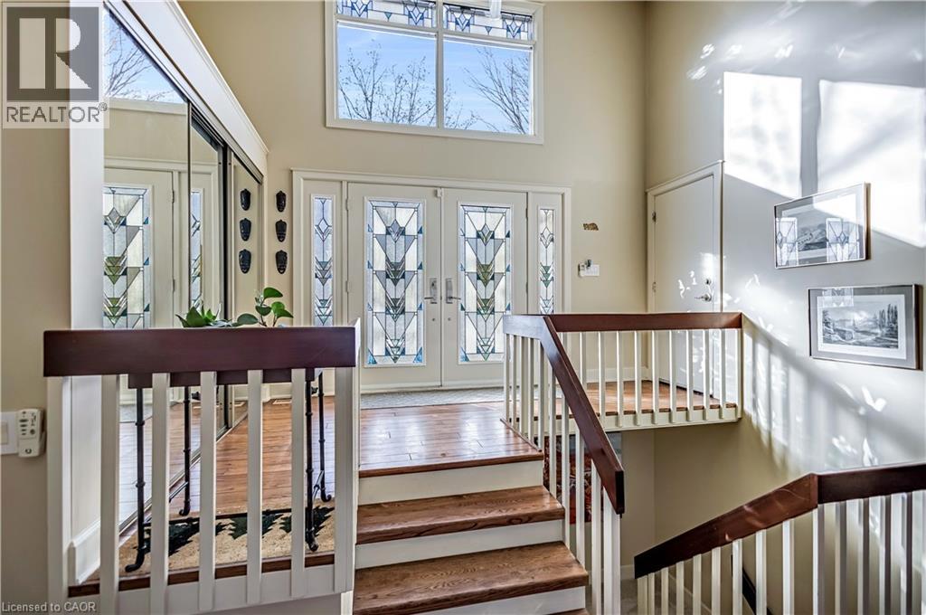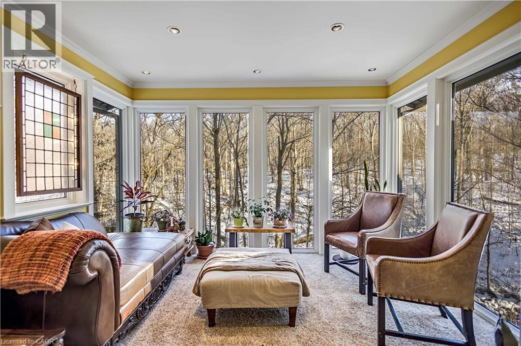 Tucked into the forest and backing directly onto the Bruce Trail and Grimsby Bench Nature Preserve, this ARCHITECTURALLY DISTINCTIVE retreat offers a RARE OPPORTUNITY to live completely immersed in nature — without sacrificing proximity to town, restaurants, and highway access. Designed for those who value COMPLETE PRIVACY, tranquility, and character over cookie-cutter living, every window frames a different woodland view, creating a true storybook setting throughout. A vaulted foyer welcomes you into a dramatic main living space featuring a striking three-way stone wood-burning fireplace, Brazilian hardwood floors, and walls of windows that blur the line between indoors and out. The thoughtfully designed kitchen balances everyday function with elevated entertaining, offering soapstone countertops, a 10-foot island with prep sink, custom detailing, and premium appliances including a Thermador gas range and steam oven, flowing seamlessly into a glass-enclosed sunroom and expansive balcony that stretches along the back of the home among the treetops. The upper level serves as a private primary retreat with balcony access, an oversized windowed dressing closet, and a spa-inspired bath featuring a jetted tub and infrared heat lamp for year-round comfort. The lower level provides exceptional flexibility with a spacious recreation room anchored by a second wood-burning fireplace, two additional bedrooms, a full bath, and a dedicated office with walk-out access ideal for remote work or guest accommodation. Outdoors, terraced stone landscaping, a pizza oven, hot tub, and direct forest access create a secluded escape, while an eight-car driveway and garage with inside entry add everyday convenience. This ONE-OF-A-KIND property is perfectly suited for buyers seeking a refined woodland lifestyle in one of Grimsby’s most desirable locations. RSA. (id:4555)