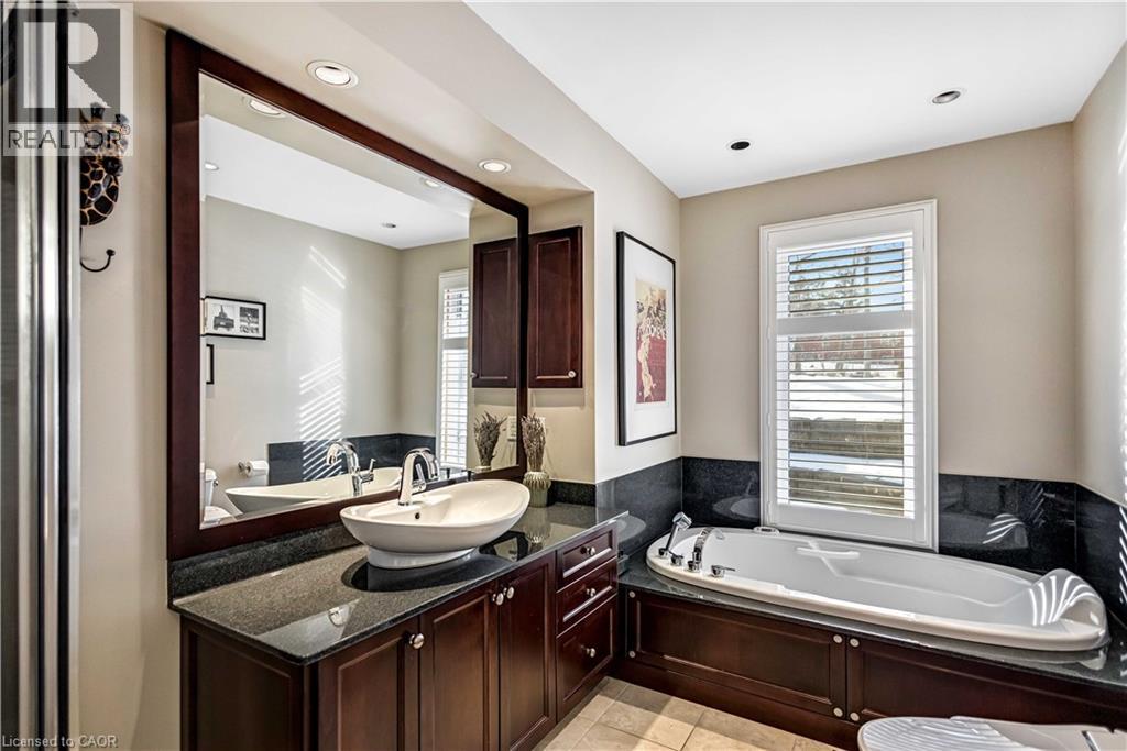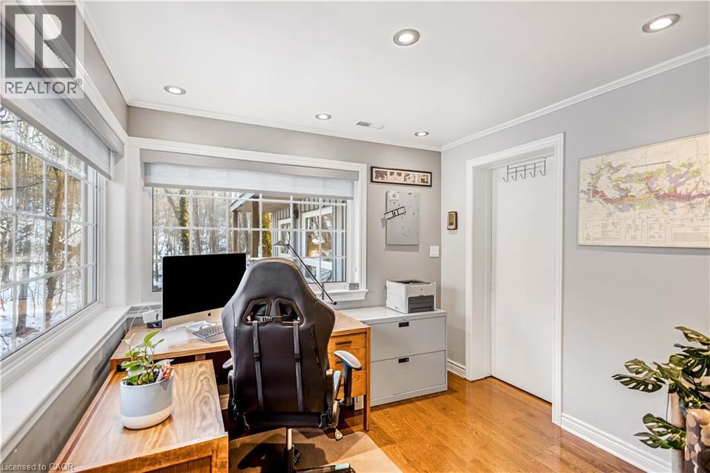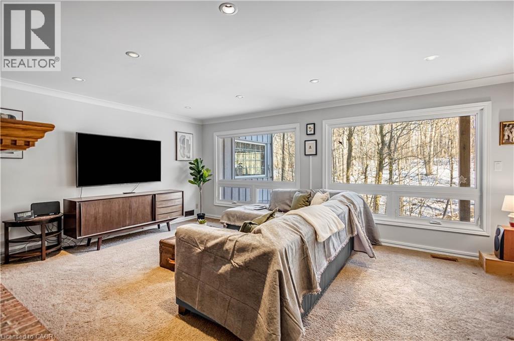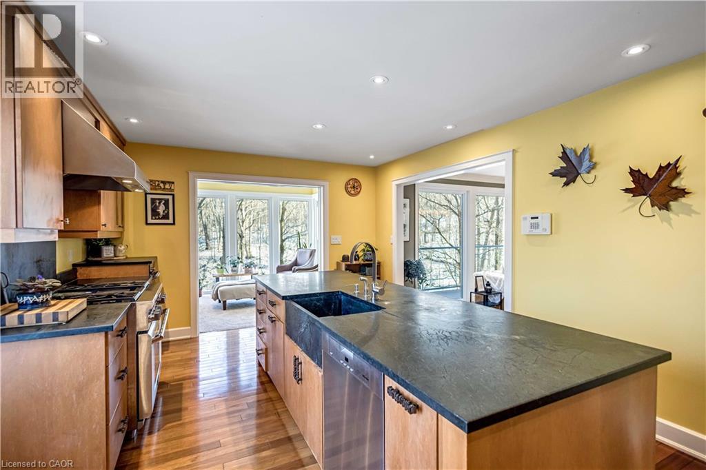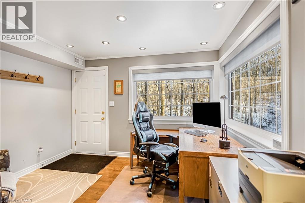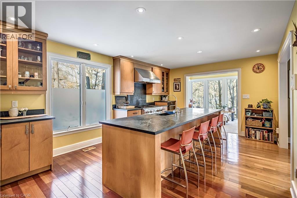 Tucked into the forest and backing directly onto the Bruce Trail and Grimsby Bench Nature Preserve, this ARCHITECTURALLY DISTINCTIVE retreat offers a RARE OPPORTUNITY to live completely immersed in nature — without sacrificing proximity to town, restaurants, and highway access. Designed for those who value COMPLETE PRIVACY, tranquility, and character over cookie-cutter living, every window frames a different woodland view, creating a true storybook setting throughout. A vaulted foyer welcomes you into a dramatic main living space featuring a striking three-way stone wood-burning fireplace, Brazilian hardwood floors, and walls of windows that blur the line between indoors and out. The thoughtfully designed kitchen balances everyday function with elevated entertaining, offering soapstone countertops, a 10-foot island with prep sink, custom detailing, and premium appliances including a Thermador gas range and steam oven, flowing seamlessly into a glass-enclosed sunroom and expansive balcony that stretches along the back of the home among the treetops. The upper level serves as a private primary retreat with balcony access, an oversized windowed dressing closet, and a spa-inspired bath featuring a jetted tub and infrared heat lamp for year-round comfort. The lower level provides exceptional flexibility with a spacious recreation room anchored by a second wood-burning fireplace, two additional bedrooms, a full bath, and a dedicated office with walk-out access ideal for remote work or guest accommodation. Outdoors, terraced stone landscaping, a pizza oven, hot tub, and direct forest access create a secluded escape, while an eight-car driveway and garage with inside entry add everyday convenience. This ONE-OF-A-KIND property is perfectly suited for buyers seeking a refined woodland lifestyle in one of Grimsby’s most desirable locations. RSA. (id:4555)