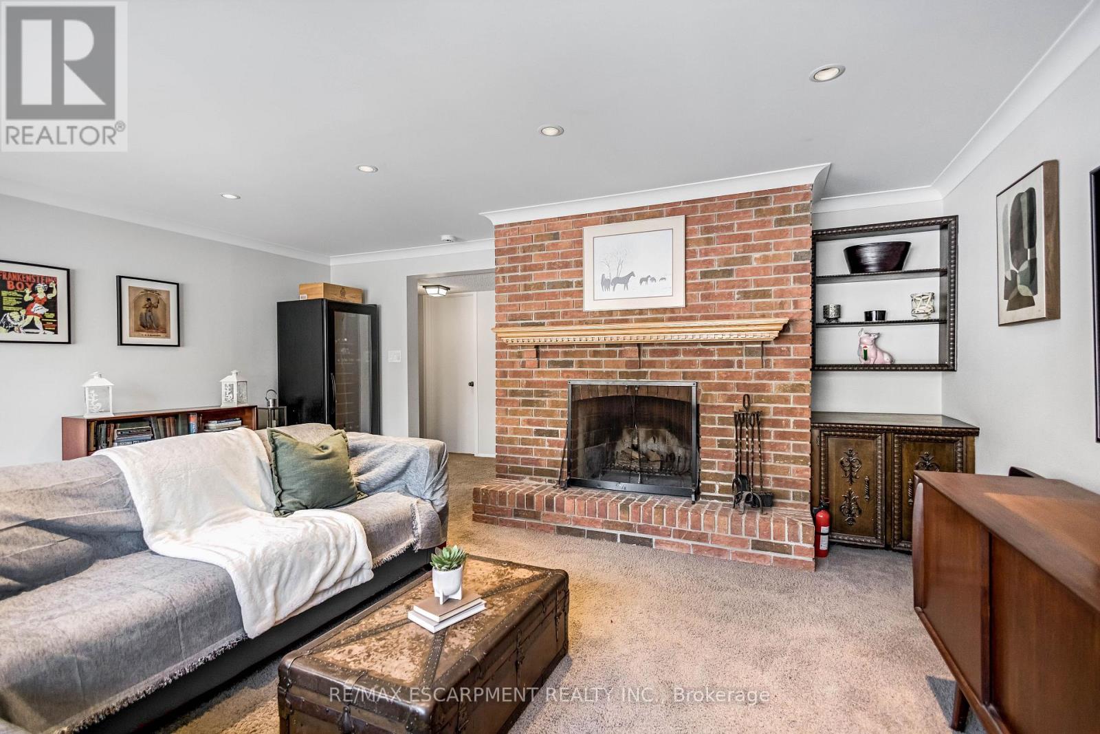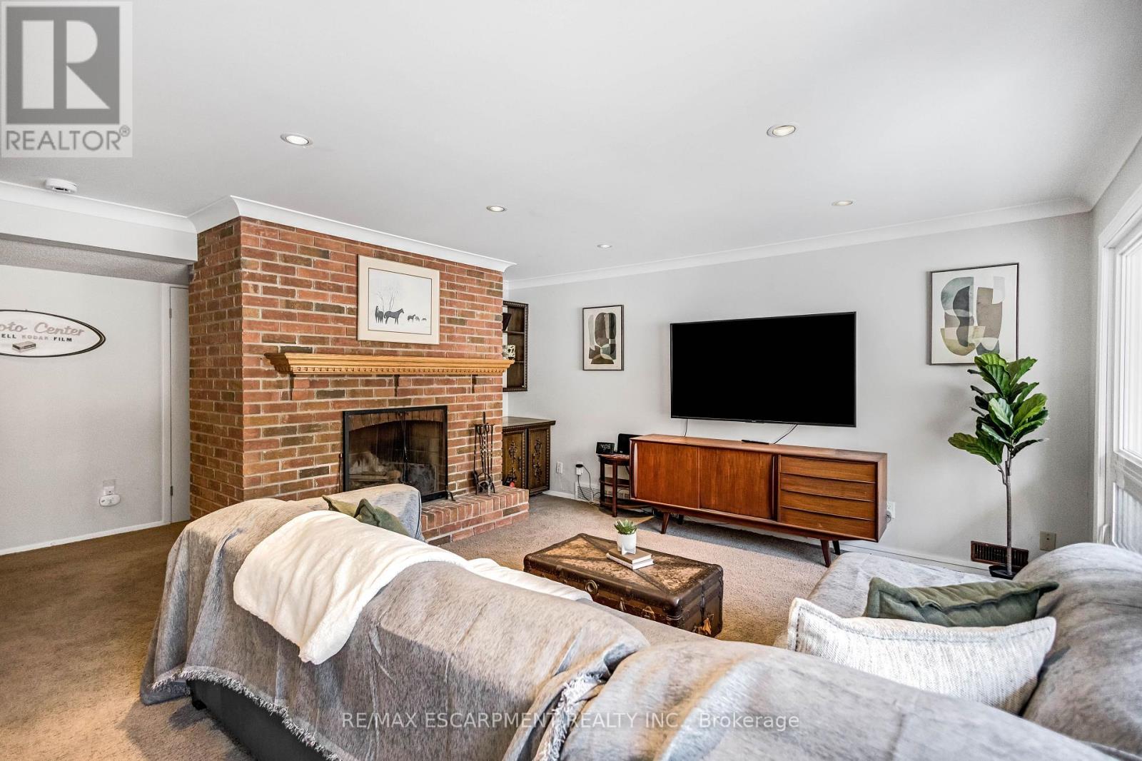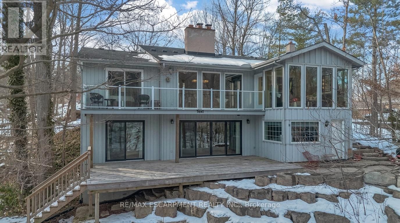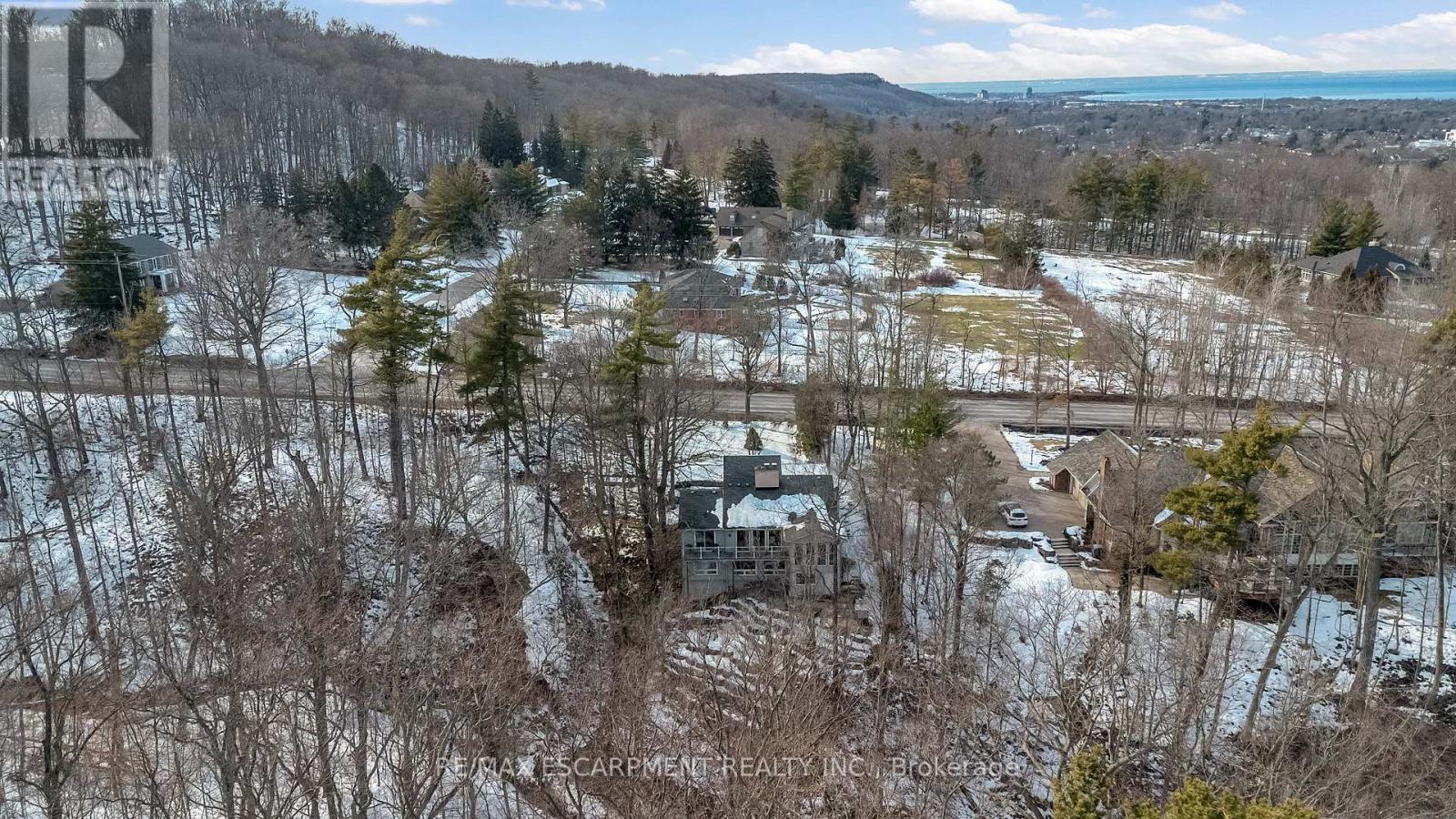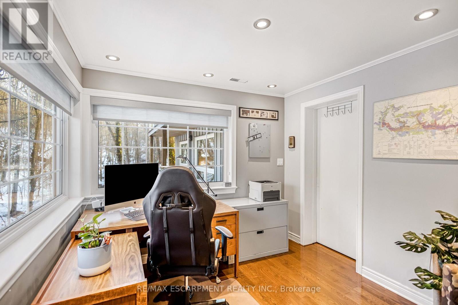 Tucked into the forest and backing directly onto the Bruce Trail and Grimsby Bench Nature Preserve, this ARCHITECTURALLY DISTINCTIVE retreat offers a RARE OPPORTUNITY to live completely immersed in nature - without sacrificing proximity to town, restaurants, and highway access. Designed for those who value COMPLETE PRIVACY, tranquility, and character over cookie-cutter living, every window frames a different woodland view, creating a true storybook setting throughout. A vaulted foyer welcomes you into a dramatic main living space featuring a striking three-way stone wood-burning fireplace, Brazilian hardwood floors, and walls of windows that blur the line between indoors and out. The thoughtfully designed kitchen balances everyday function with elevated entertaining, offering soapstone countertops, a 10-foot island with prep sink, custom detailing, and premium appliances including a Thermador gas range and steam oven, flowing seamlessly into a glass-enclosed sunroom and expansive balcony that stretches along the back of the home among the treetops. The upper level serves as a private primary retreat with balcony access, an oversized windowed dressing closet, and a spa-inspired bath featuring a jetted tub and infrared heat lamp for year-round comfort. The lower level provides exceptional flexibility with a spacious recreation room anchored by a second wood-burning fireplace, two additional bedrooms, a full bath, and a dedicated office with walk-out access ideal for remote work or guest accommodation. Outdoors, terraced stone landscaping, a pizza oven, hot tub, and direct forest access create a secluded escape, while an eight-car driveway and garage with inside entry add everyday convenience. This ONE-OF-A-KIND property is perfectly suited for buyers seeking a refined woodland lifestyle in one of Grimsby's most desirable locations. RSA (id:4555)