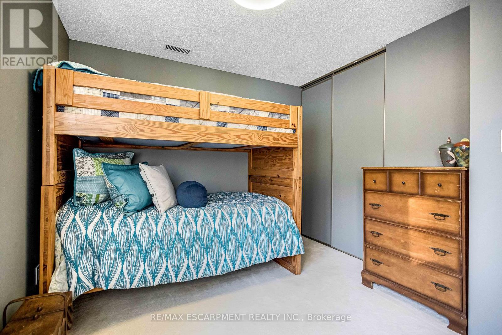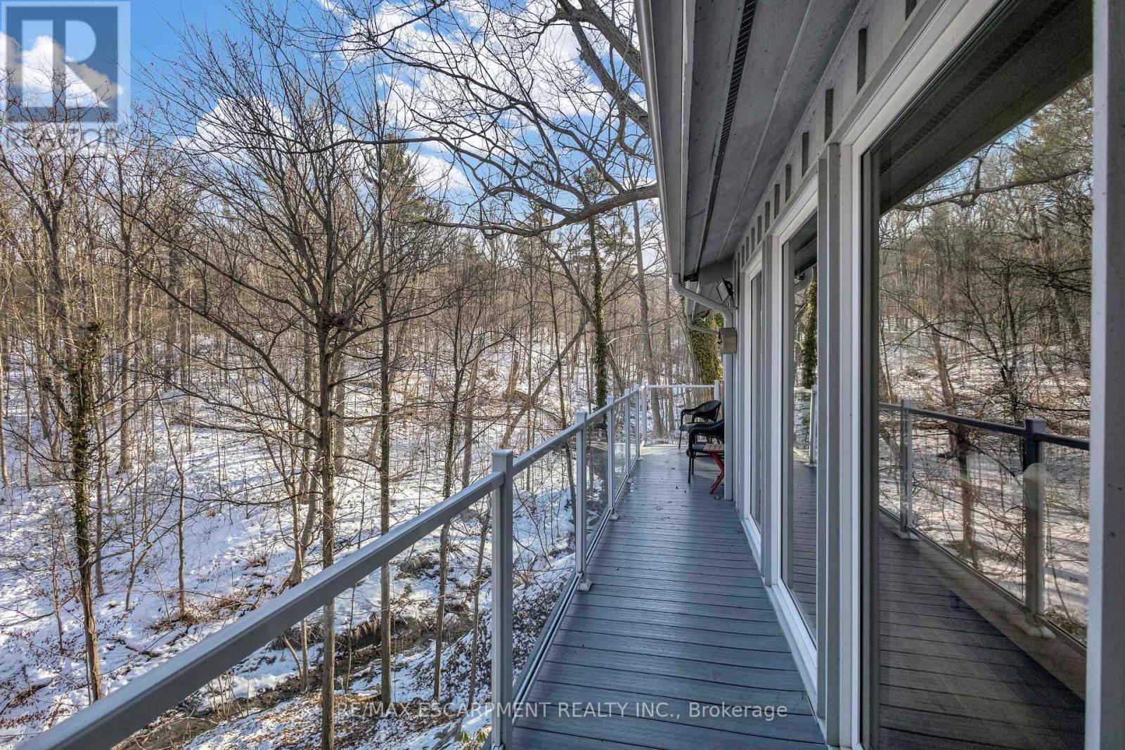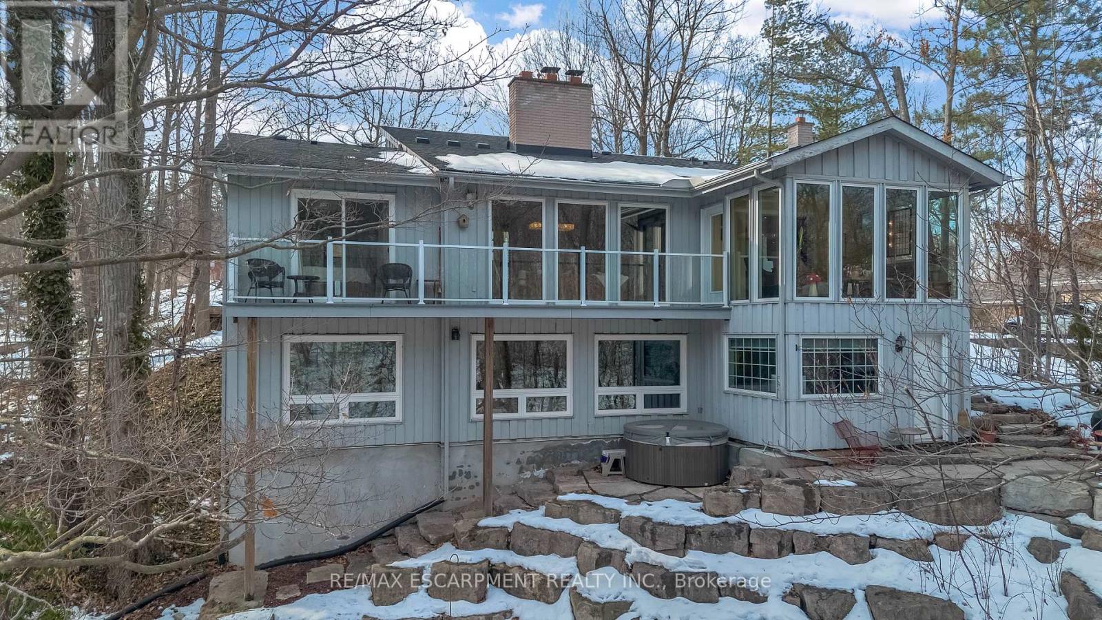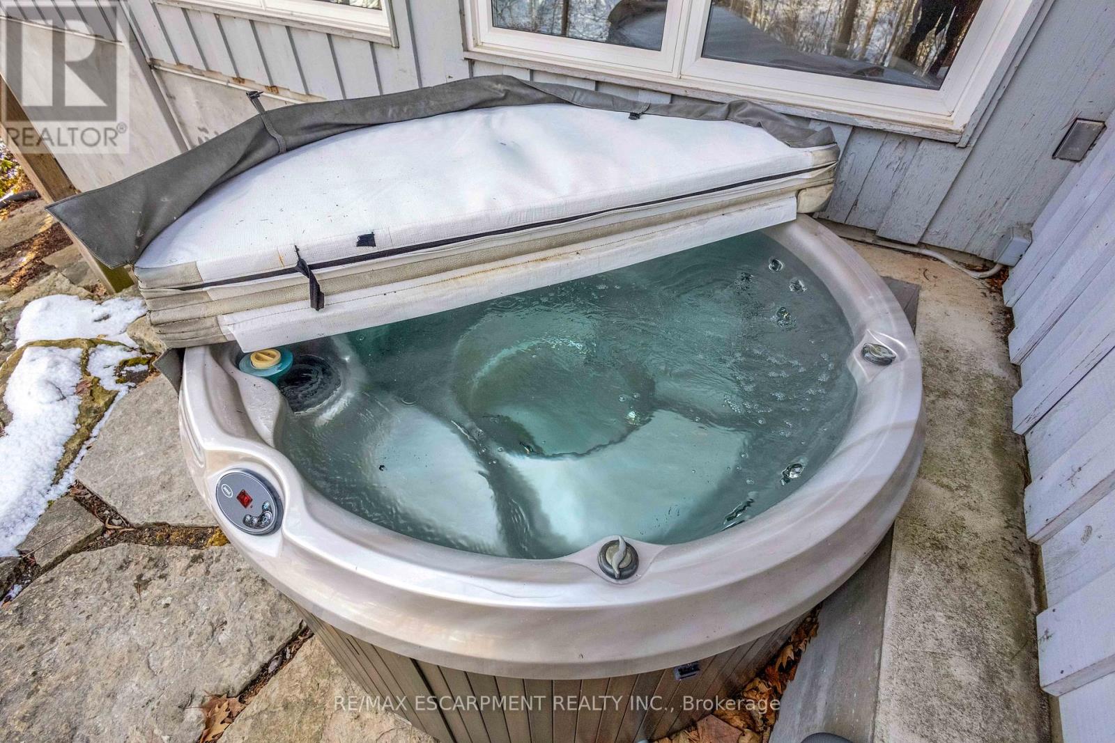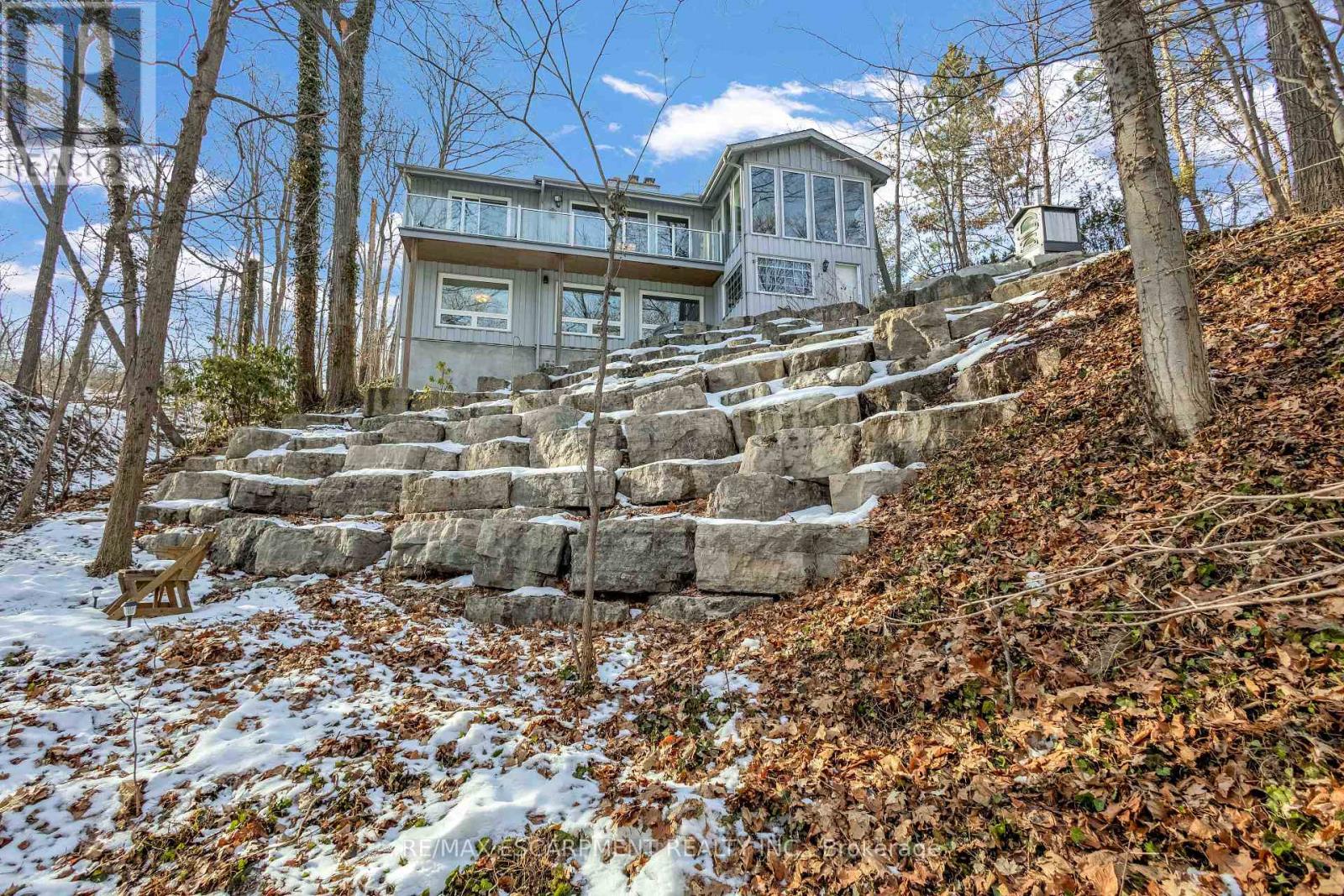 Tucked into the forest and backing directly onto the Bruce Trail and Grimsby Bench Nature Preserve, this ARCHITECTURALLY DISTINCTIVE retreat offers a RARE OPPORTUNITY to live completely immersed in nature - without sacrificing proximity to town, restaurants, and highway access. Designed for those who value COMPLETE PRIVACY, tranquility, and character over cookie-cutter living, every window frames a different woodland view, creating a true storybook setting throughout. A vaulted foyer welcomes you into a dramatic main living space featuring a striking three-way stone wood-burning fireplace, Brazilian hardwood floors, and walls of windows that blur the line between indoors and out. The thoughtfully designed kitchen balances everyday function with elevated entertaining, offering soapstone countertops, a 10-foot island with prep sink, custom detailing, and premium appliances including a Thermador gas range and steam oven, flowing seamlessly into a glass-enclosed sunroom and expansive balcony that stretches along the back of the home among the treetops. The upper level serves as a private primary retreat with balcony access, an oversized windowed dressing closet, and a spa-inspired bath featuring a jetted tub and infrared heat lamp for year-round comfort. The lower level provides exceptional flexibility with a spacious recreation room anchored by a second wood-burning fireplace, two additional bedrooms, a full bath, and a dedicated office with walk-out access ideal for remote work or guest accommodation. Outdoors, terraced stone landscaping, a pizza oven, hot tub, and direct forest access create a secluded escape, while an eight-car driveway and garage with inside entry add everyday convenience. This ONE-OF-A-KIND property is perfectly suited for buyers seeking a refined woodland lifestyle in one of Grimsby's most desirable locations. RSA (id:4555)