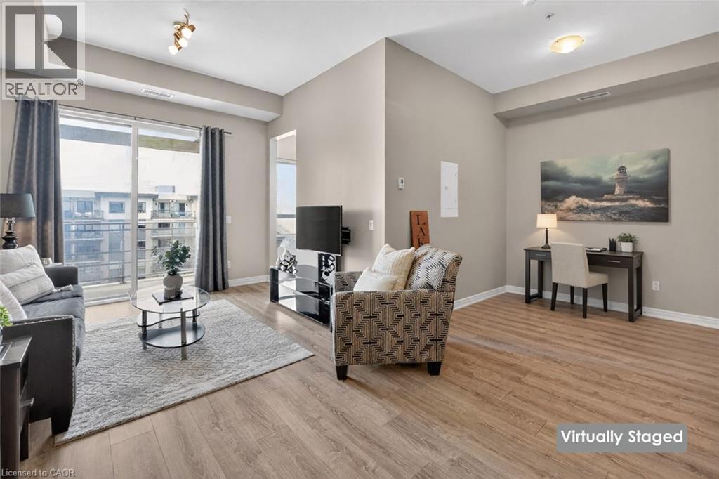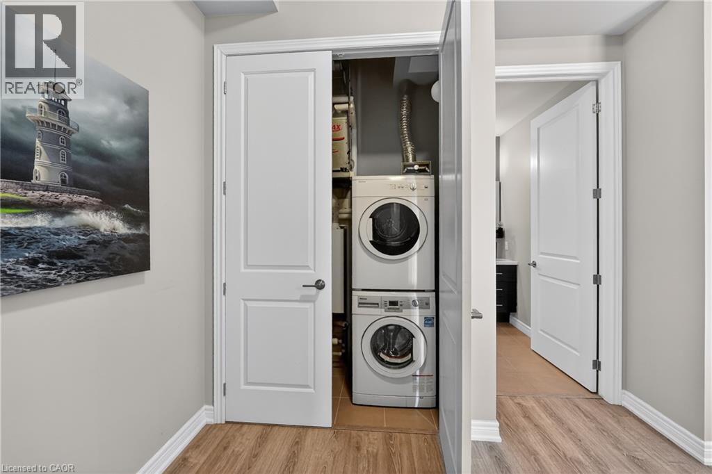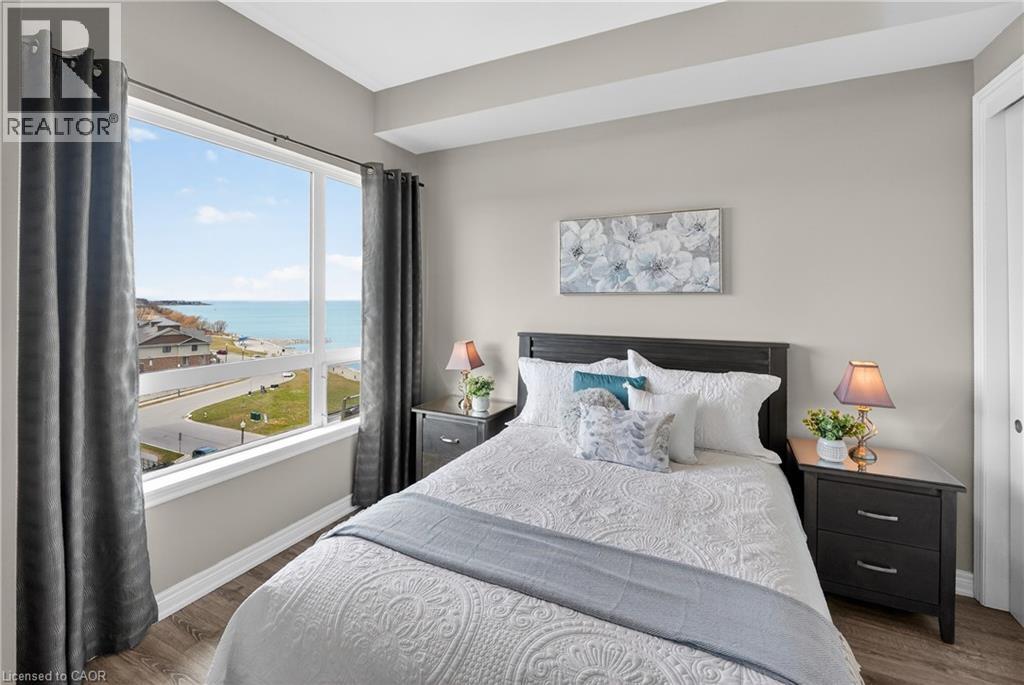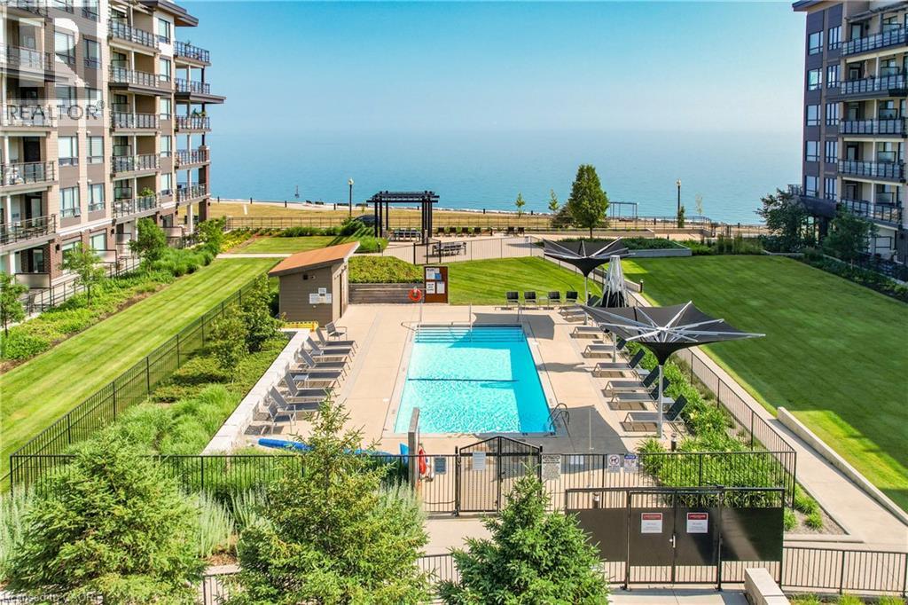 ELEGANT PENTHOUSE LIVING … Perched on the top floor, this stunning LAKESIDE CONDO at 602-10 Esplanade Place captures the essence of effortless, CAREFREE, WATERFRONT living in the heart of Grimsby. With 10’ ceilings and an abundance of natural light, this thoughtfully designed 1-bedroom PLUS DEN layout offers both comfort & style complemented by a 65 sq ft PRIVATE BALCONY showcasing breathtaking POOL & LAKE VIEWS. The open-concept living space is finished with sleek vinyl flooring and anchored by a modern kitchen featuring built-in appliances, QUARTZ countertops, tile backsplash, under-cabinet lighting, and potlights - creating a clean, contemporary feel ideal for everyday living or entertaining. The spacious primary bedroom is complete with double closets and LAKE VIEWS, while the versatile den offers flexibility for a home office or guest space. Convenience is key with IN-SUITE STACKABLE LAUNDRY, a well-appointed 4-pc bath, and ample storage solutions including locker (#198) and dedicated underground bike storage. Parking is a breeze with an UNDERGROUND SPACE (#128). Beyond the unit, residents enjoy access to a FULL SUITE OF AMENITIES, including a fitness centre, dog wash, party room, pool, PLUS VISITOR PARKING - enhancing the lifestyle experience this building has to offer. Set just steps from the waterfront, scenic trails, Grimsby Public Beach, and a vibrant mix of boutique shops & restaurants, this location balances relaxation with everyday convenience. With highway access just one minute away, commuting is seamless while still enjoying the charm of LAKESIDE LIVING. A rare opportunity to own a penthouse-level suite in one of Grimsby’s most desirable waterfront communities. CLICK ON MULTIMEDIA for virtual tour, floor plans, drone photos & more. (id:4555)