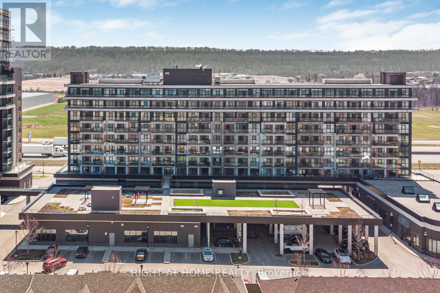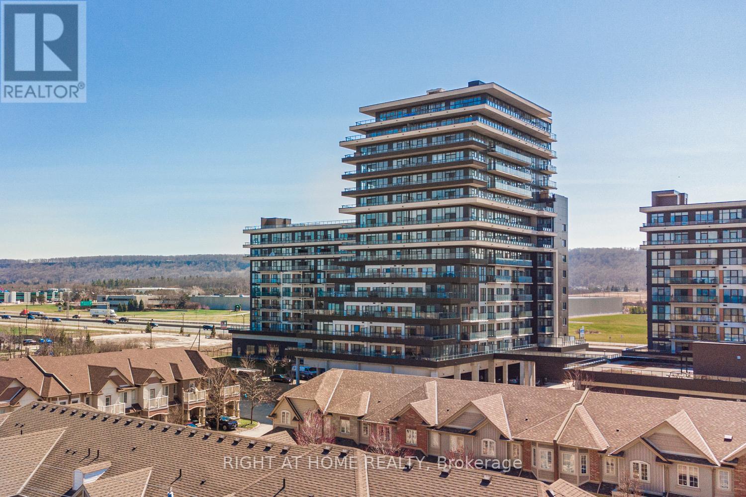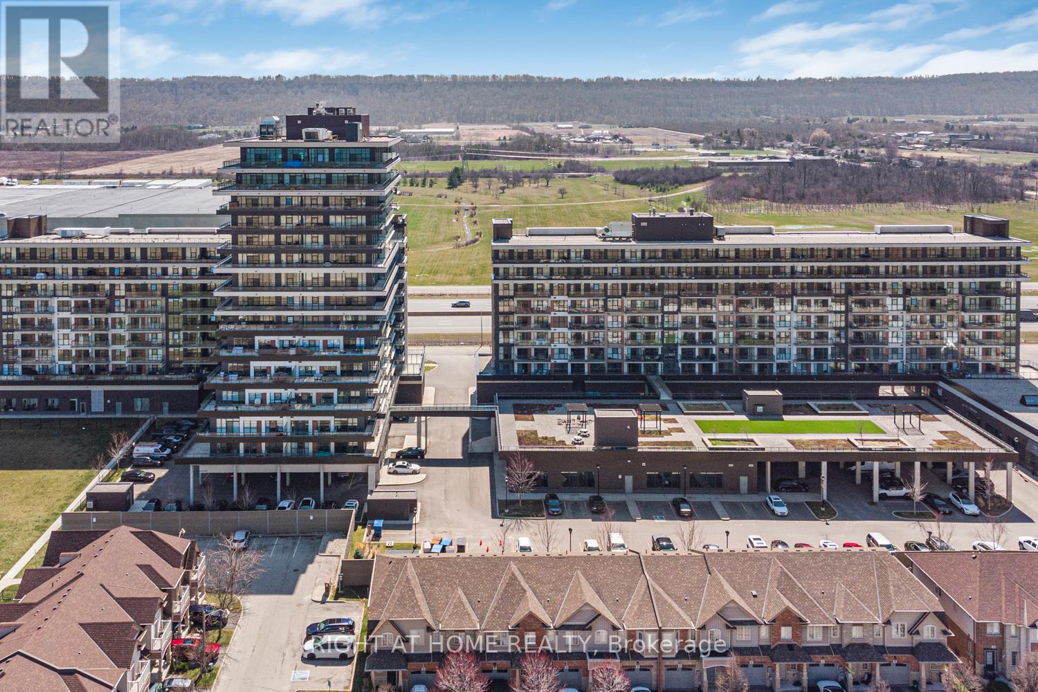 NORTH FACING LAKE VIEWS AND 9 FT CEILINGS IN GRIMSBY WATERFRONT COMMUNITY! It feels different from the moment you step inside. The space breathes. With 9 ft ceilings overhead and floor to ceiling windows pulling Lake Ontario into the room, the light is generous without the afternoon sun baking through, and there is a stillness here that the city simply cannot offer. Over 700 sq ft of open concept living, carpet free throughout, private balcony with nothing but water and sky ahead. The kitchen earns its place with granite countertops, stainless steel appliances, a grey subway tile backsplash, white shaker cabinetry and a centre island. Primary bedroom with walk in closet and a clean 3 piece bath with glass shower. The den handles the office, the guests, or whatever life asks of it. In suite laundry, one underground parking space and a storage locker. The building brings 24 hour concierge, a rooftop terrace and BBQ, fitness centre, party room and guest suites so the amenities match the lifestyle. Step outside and Casablanca Waterfront Park is right next door, a km of shoreline with beaches, trails, pavilions and open green space that most city dwellers drive an hour to find. Fifty Point Conservation Area with its marina and beach is a 5 minute drive west. The Bruce Trail and Beamer Memorial Conservation Area are minutes up the escarpment. Wine country begins right here in Grimsby with over 88 wineries within easy reach along the Niagara Bench. The QEW and GO Station are minutes away for when the city calls. This is the life people keep saying they will get around to one day. (id:4555)