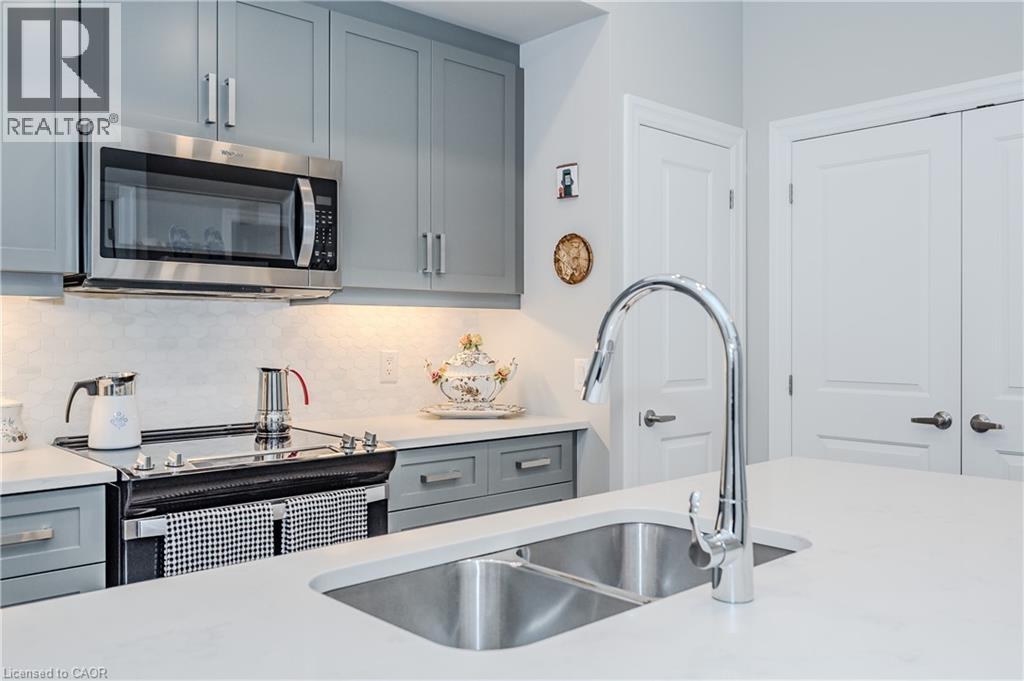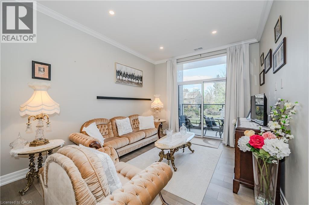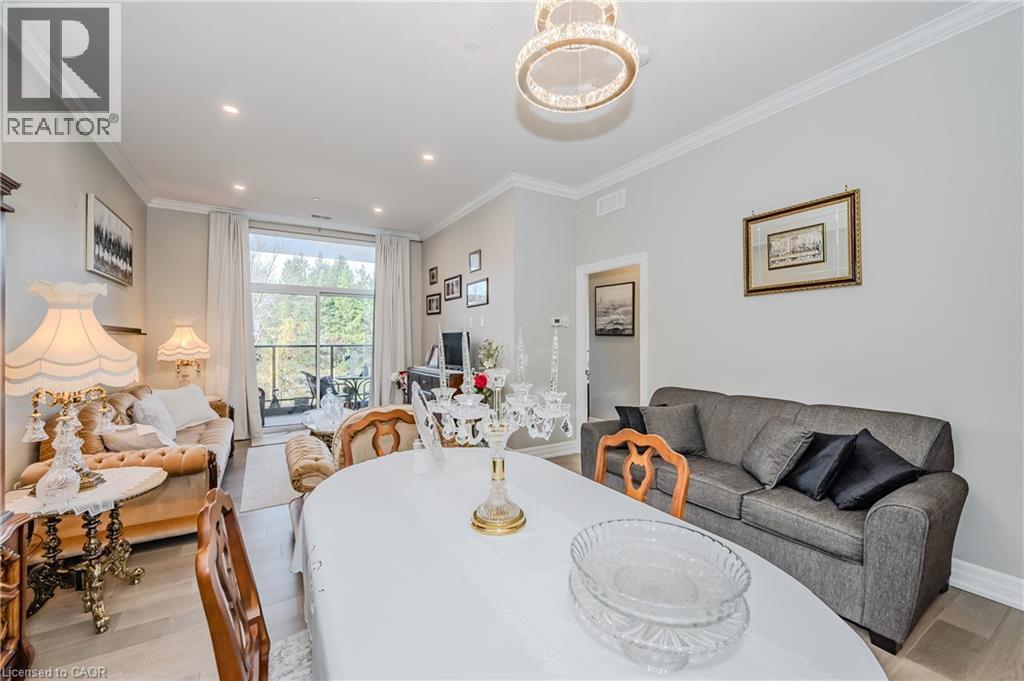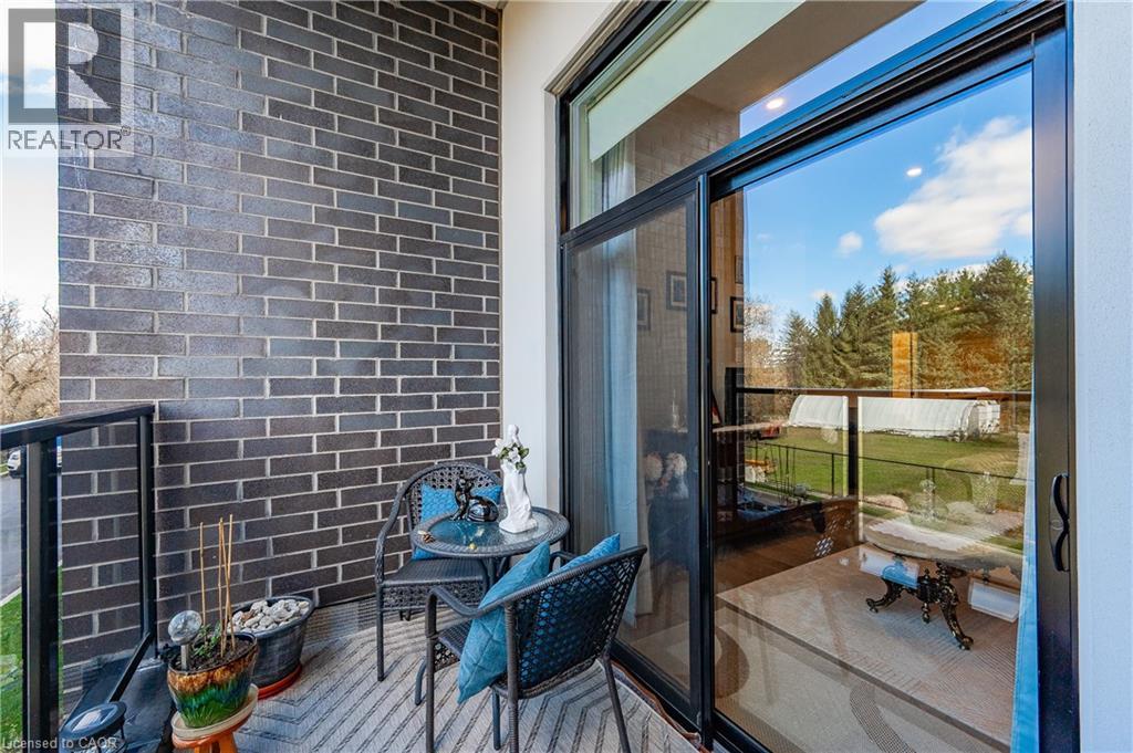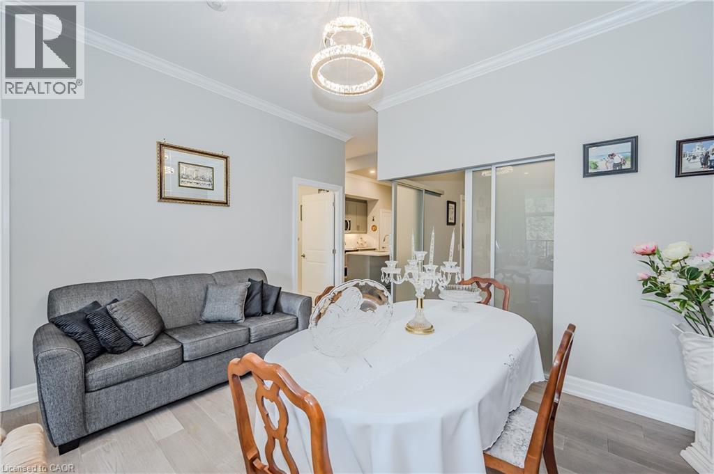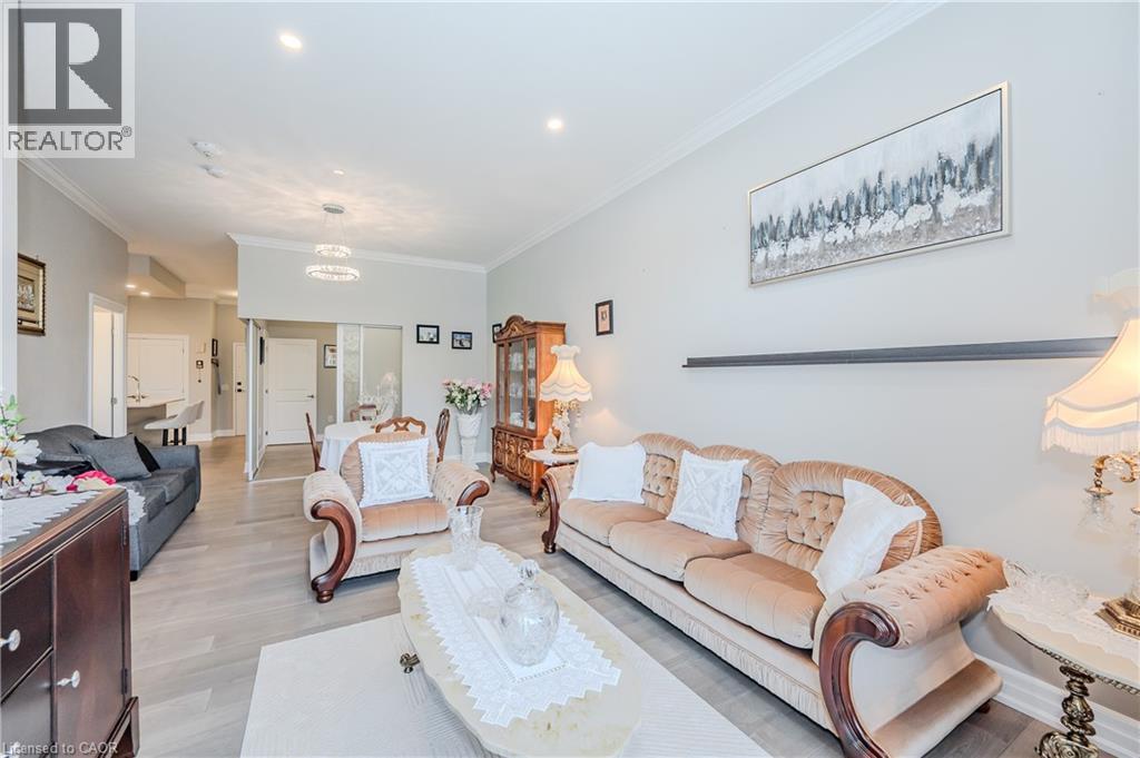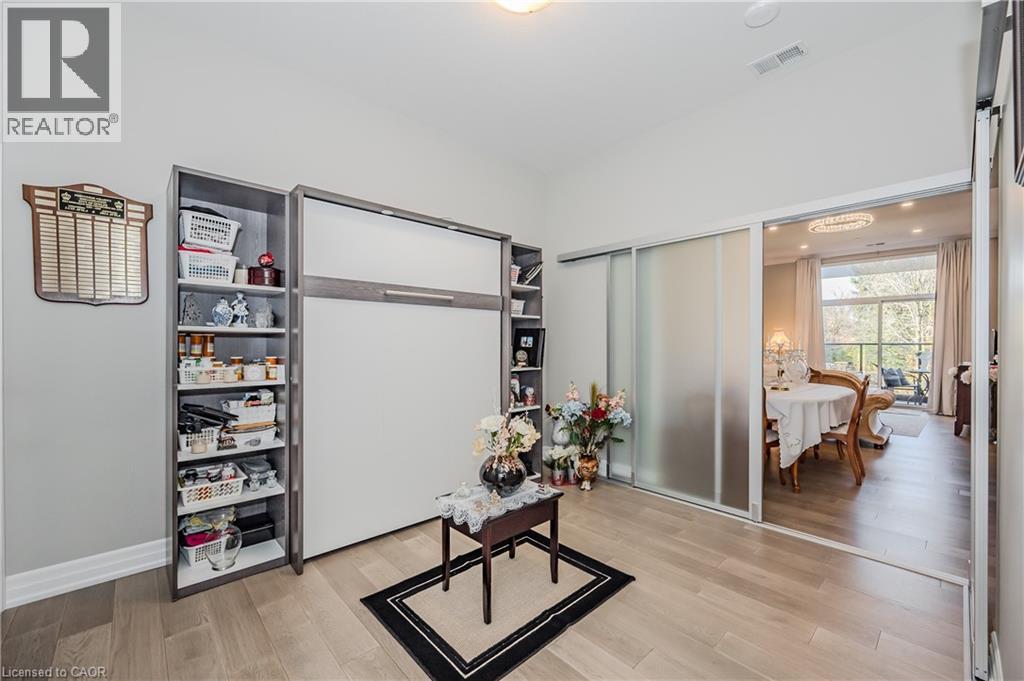 Make this gorgeous ground-floor condo located in the prestigious south end of Guelph yours. Professionally designed 2-bedroom, 2-bathroom suite with luxurious upgrades and TWO underground parking spaces. The 10' ceilings bring in more natural light and make the open-concept floor plan feel very spacious. With stunning finishes and a great layout, spending time at home will feel relaxing and joyful. The modern kitchen has plenty of cabinets, numerous drawers and a walk-in pantry for additional storage. Undermount lighting, built-in stainless steel appliances, a stylish backsplash, and a large island complete the kitchen. The broad dining area overlooks the living room. The charming living room with large sliding doors leads to a private balcony. Enjoy a morning coffee or afternoon tea in your secluded outdoor space. The large primary bedroom has a walk-in closet and a luxurious ensuite bathroom with a floor-to-ceiling glass shower and heated flooring. With glass sliding doors that open up to the living/dining room, you will be pleased with the functionality of a second bedroom. With a Murphy bed already installed, it can be used as an office and/or a bedroom. The main 4-piece bath with heated floors and in-suite laundry completes this suite. Quartz counters and hardwood flooring throughout, crown molding, and pot lights are a bonus. This building has so many amazing amenities to offer. With an HD golf simulator, a very well-equipped gym, a guest suite, bicycle storage, and a gorgeous 14th-floor resident lounge with a separate bar area, games room, and a balcony with panoramic views and a great scenery. If you are expecting more guests, you can also book the building's guest suite. Located in Guelph's desirable south end, this beautiful condo is just steps away from prime shopping, restaurants, banks, and cinema. Easy access to HWY 401 and on a bus route to UoG. (id:4555)