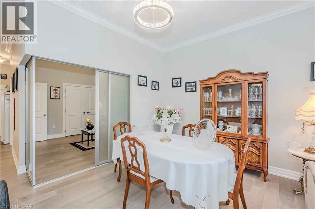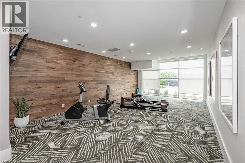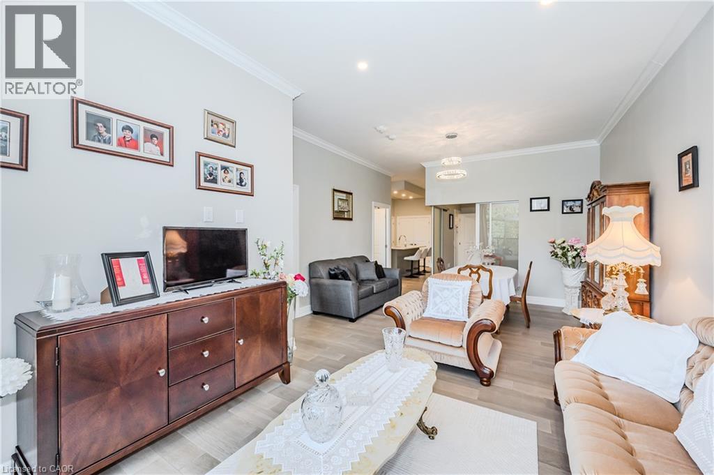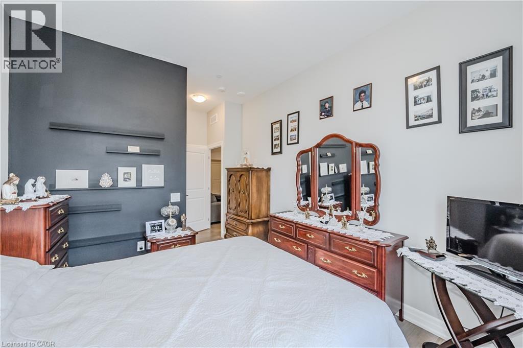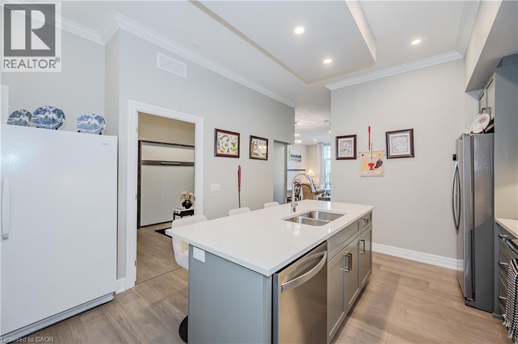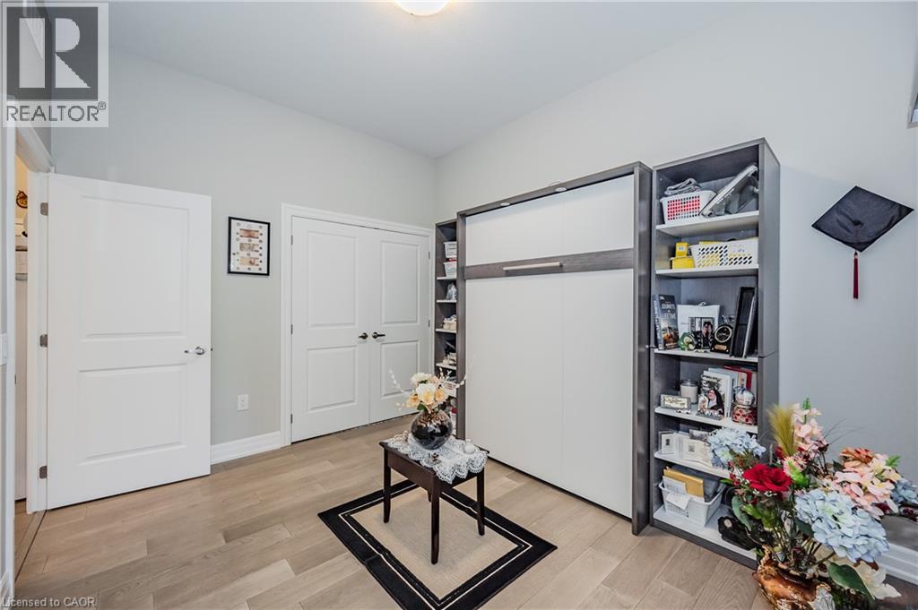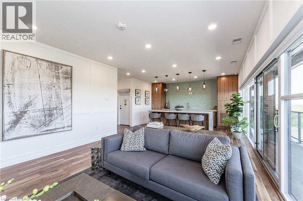 Make this gorgeous ground-floor condo located in the prestigious south end of Guelph yours. Professionally designed 2-bedroom, 2-bathroom suite with luxurious upgrades and TWO underground parking spaces. The 10' ceilings bring in more natural light and make the open-concept floor plan feel very spacious. With stunning finishes and a great layout, spending time at home will feel relaxing and joyful. The modern kitchen has plenty of cabinets, numerous drawers and a walk-in pantry for additional storage. Undermount lighting, built-in stainless steel appliances, a stylish backsplash, and a large island complete the kitchen. The broad dining area overlooks the living room. The charming living room with large sliding doors leads to a private balcony. Enjoy a morning coffee or afternoon tea in your secluded outdoor space. The large primary bedroom has a walk-in closet and a luxurious ensuite bathroom with a floor-to-ceiling glass shower and heated flooring. With glass sliding doors that open up to the living/dining room, you will be pleased with the functionality of a second bedroom. With a Murphy bed already installed, it can be used as an office and/or a bedroom. The main 4-piece bath with heated floors and in-suite laundry completes this suite. Quartz counters and hardwood flooring throughout, crown molding, and pot lights are a bonus. This building has so many amazing amenities to offer. With an HD golf simulator, a very well-equipped gym, a guest suite, bicycle storage, and a gorgeous 14th-floor resident lounge with a separate bar area, games room, and a balcony with panoramic views and a great scenery. If you are expecting more guests, you can also book the building's guest suite. Located in Guelph's desirable south end, this beautiful condo is just steps away from prime shopping, restaurants, banks, and cinema. Easy access to HWY 401 and on a bus route to UoG. (id:4555)