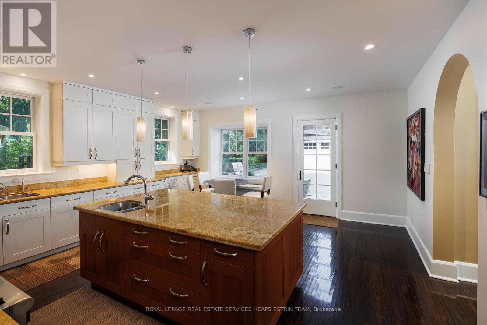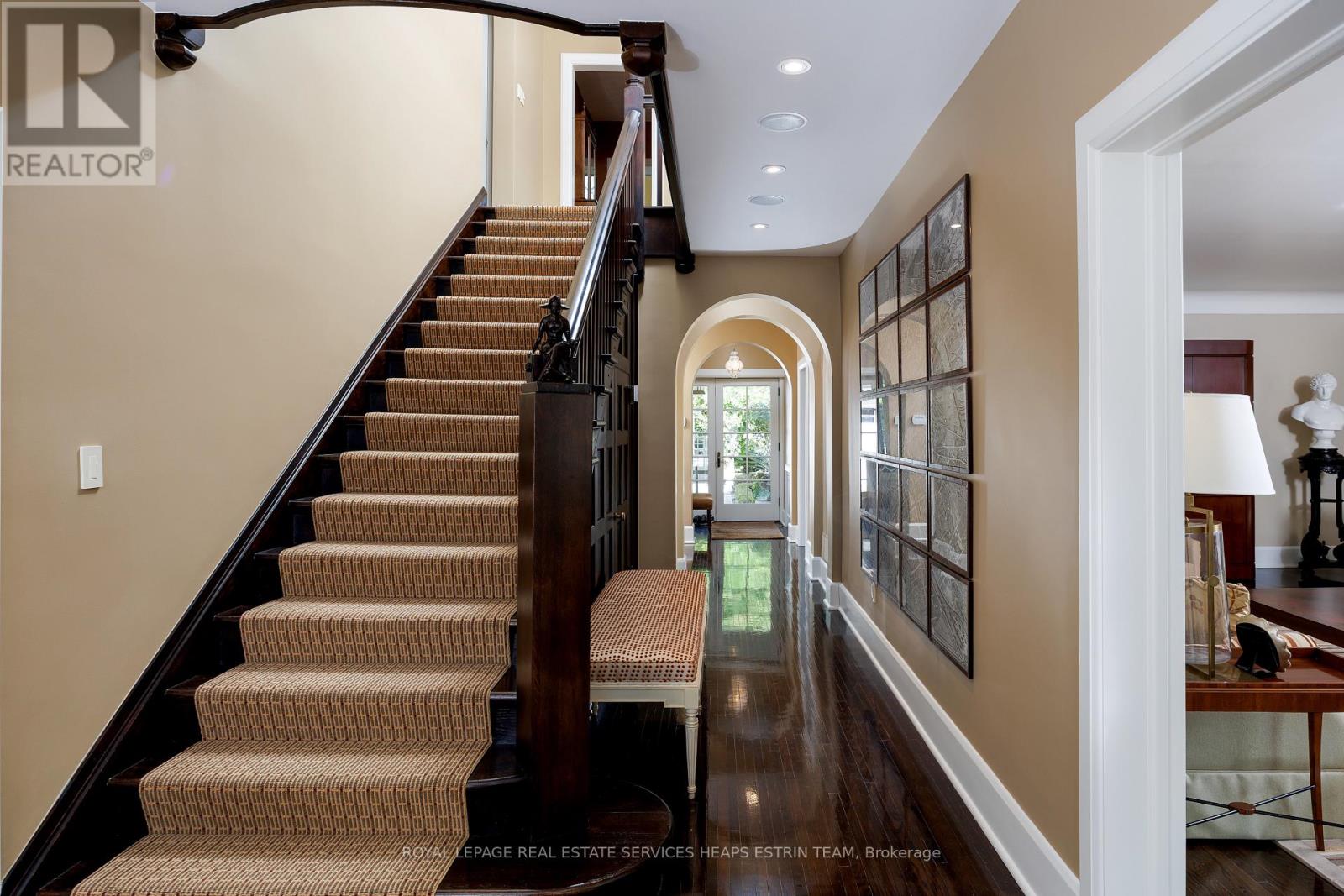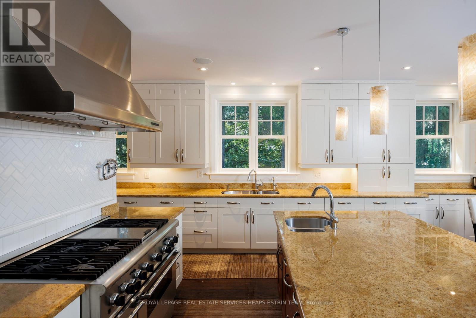 A landmark estate in St. George's Park. Privately set on one of Guelph's most prestigious streets, 75 Queen Street is a legacy residence of rare scale and architectural significance. This fully reimagined Dutch Colonial estate sits elevated on an 89 x 264-foot lot, surrounded by professionally designed grounds that have been meticulously cultivated and maintained for over 25 years. The exterior offers resort-quality living, with a saltwater pool, wood-burning fireplace, outdoor shower, and dedicated pool bathroom, framed by mature trees and layered stonework. The sense of privacy and serenity is immediate. Inside, the home spans over 5,700 square feet of finished space and follows a classic centre-hall plan with gracious flow and custom detail throughout. The main level includes a grand great room, formal dining room, glass-enclosed sunroom, chef's kitchen with granite surfaces and premium appliances, and a private office. Upstairs, the primary suite features two fireplaces, a walk-in closet, a five-piece ensuite, and a private balcony with hot tub. The third floor offers additional bedrooms, a large family room with wet bar, and elevated views of the gardens and city skyline. The fully finished lower level includes radiant heated floors, a home theatre, cigar lounge with ventilation, wine cellar, kitchenette, and full laundry. A detached garage and separate outbuilding provide parking for four vehicles, a sauna, a full bath, and two upper lofts that are ideal for guest accommodation, a studio, or a wellness retreat. In total, there is parking for 14 vehicles. All buildings are security-monitored and equipped with heat sensors, ensuring peace of mind and enhanced safety throughout the estate. Just steps to St. George's Park and within walking distance to downtown, the GO Station, and top schools, this property presents a rare opportunity to own one of Guelph's most iconic estates. Timeless, private, and built without compromise. (id:4555)