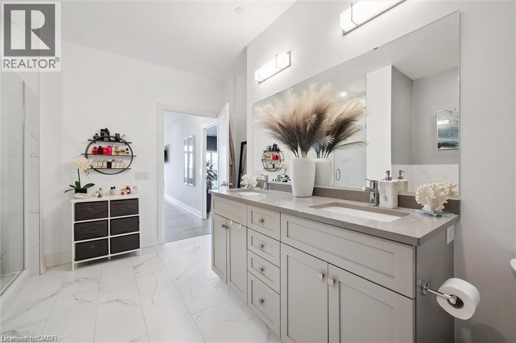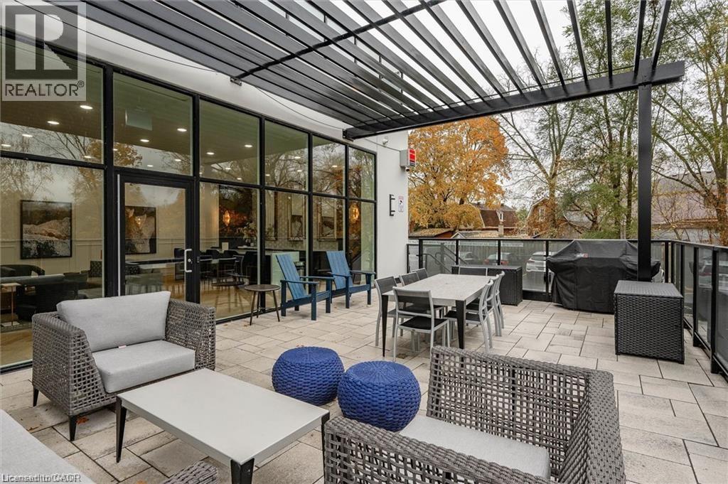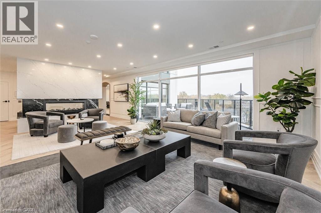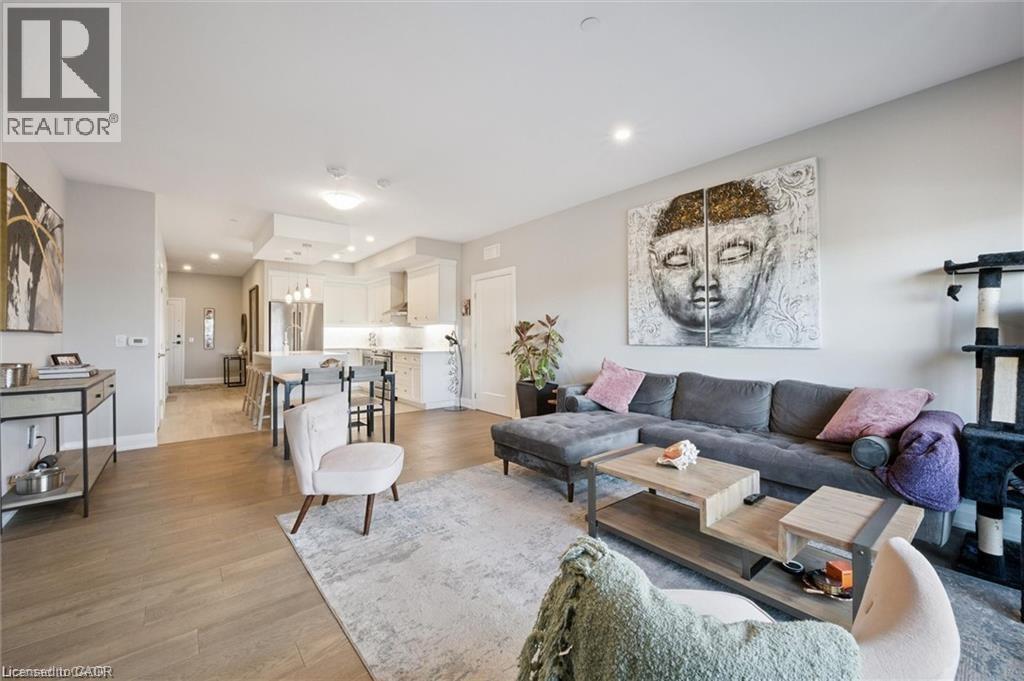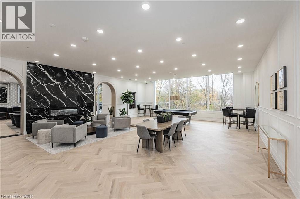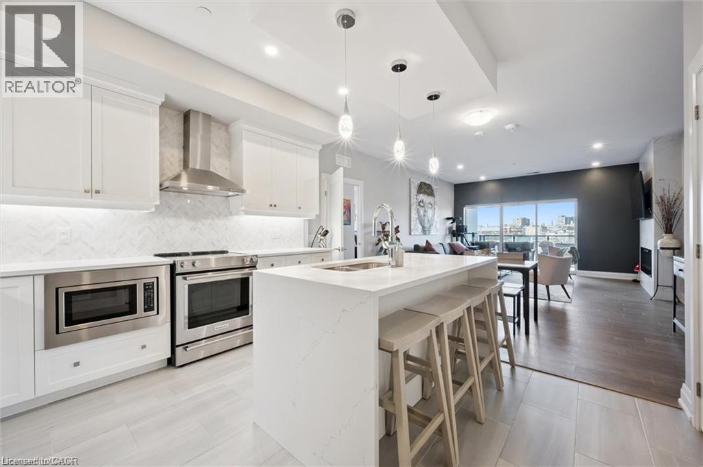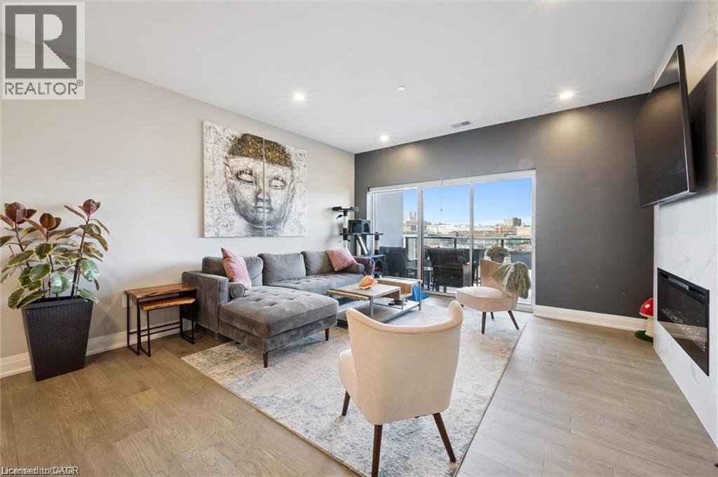 Experience refined condo living at Edgewater Condominium, ideally located along the Eramosa River in the heart of Downtown Guelph. Unit 608 is a well-appointed 2-bedroom, 2-bath suite offering two private balconies and a functional open-concept layout with approx. 1260 square feet of living space. Engineered hardwood flooring extends throughout the living areas and bedrooms. The kitchen features a waterfall island, stone countertops, modern backsplash, and premium appliances, opening to the living and dining areas highlighted by a floor-to-ceiling tiled fireplace and walk-out to a balcony with city views. The primary bedroom includes a walk-in closet, private balcony, and a 5-piece ensuite with freestanding tub, glass shower, and heated floors. A second bedroom, 3-piece bath, and in-suite laundry complete the suite. Large windows provide abundant natural light and neutral finishes throughout. Includes one underground parking space, one storage locker, and access to building amenities including a library, party and media rooms, fitness centre, and guest suites. Steps to downtown amenities, riverfront trails, and GO/VIA Rail access. (id:4555)