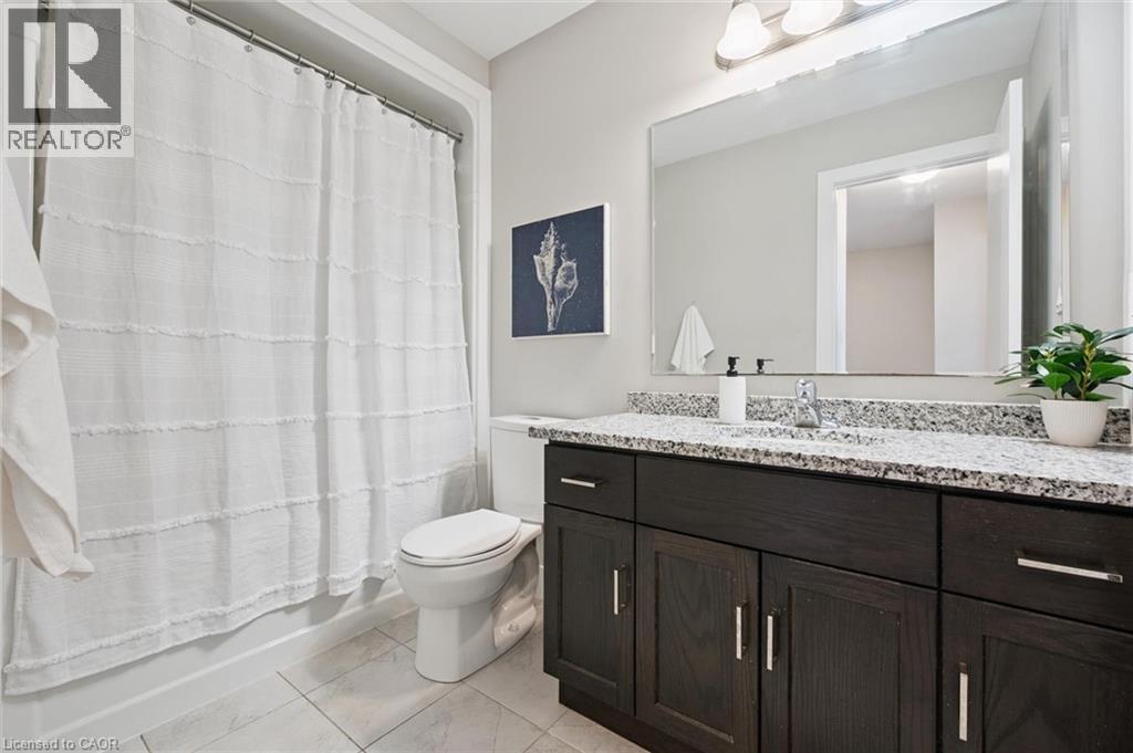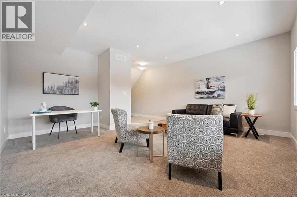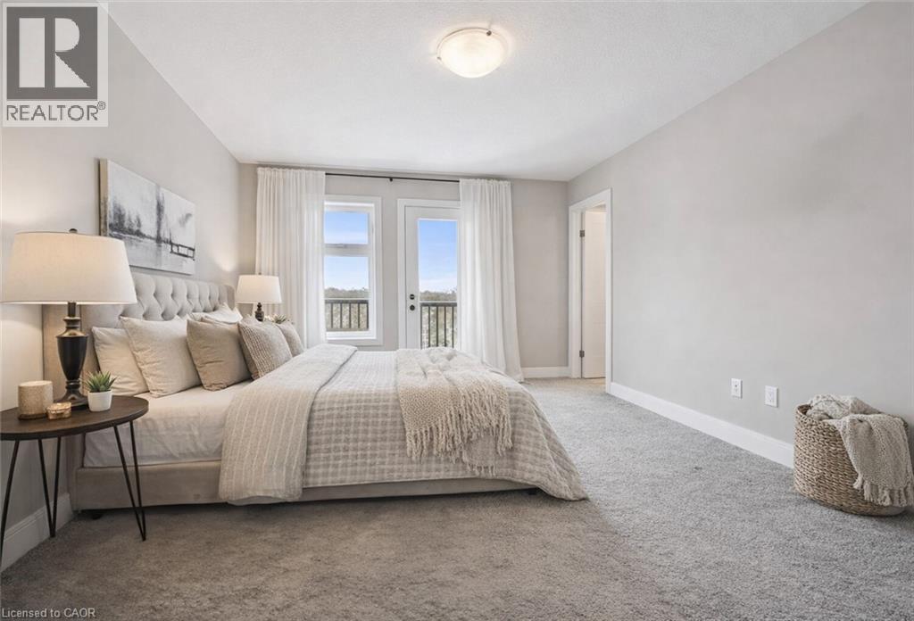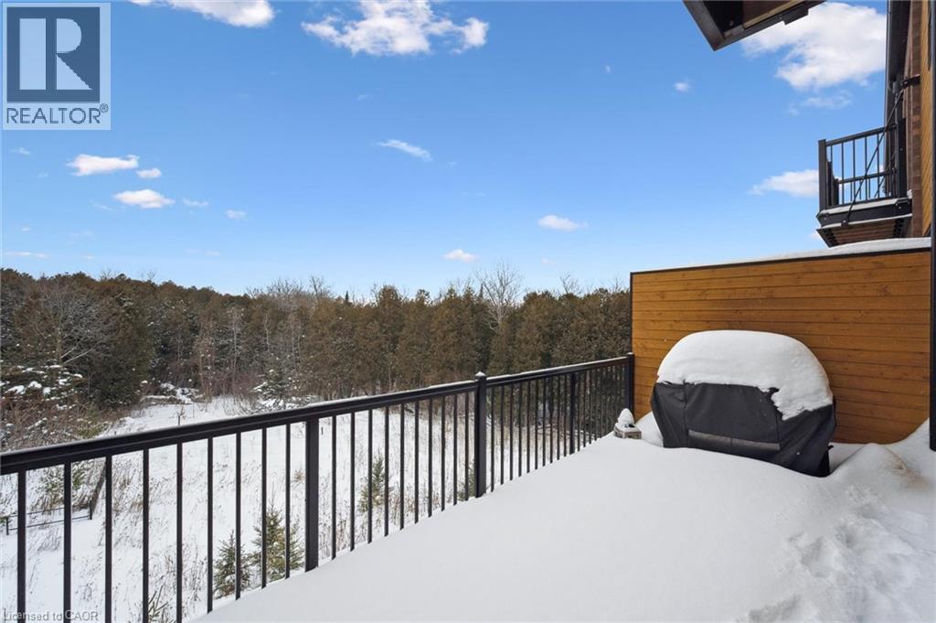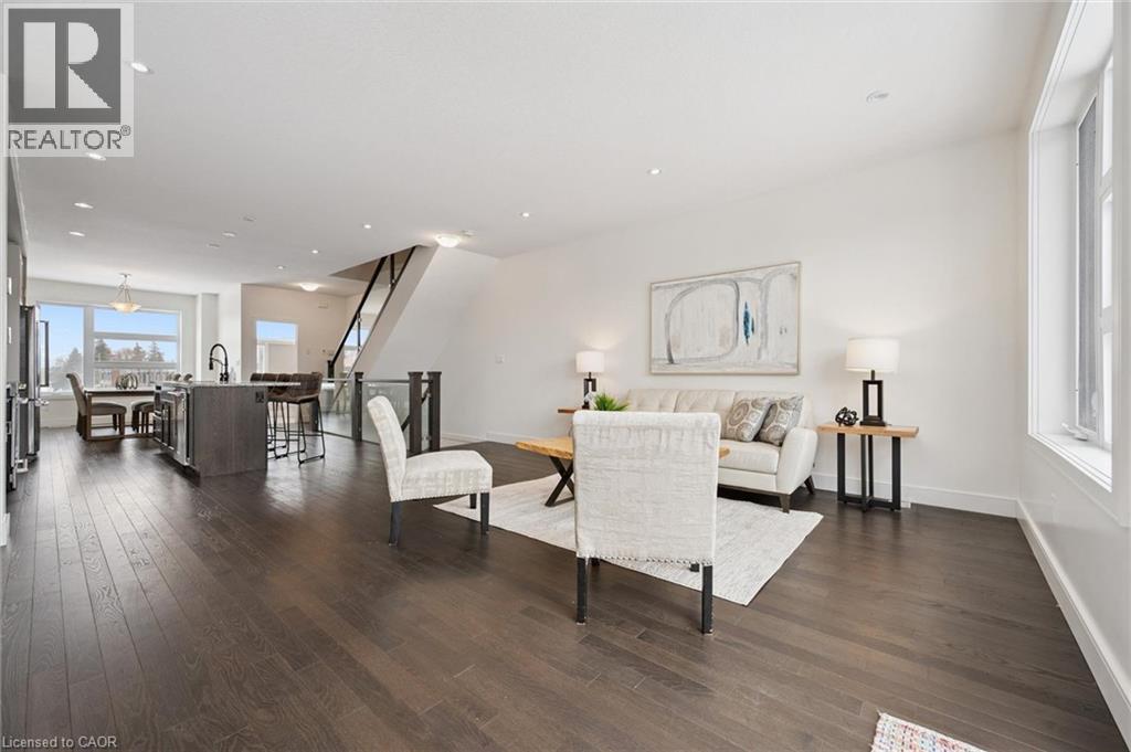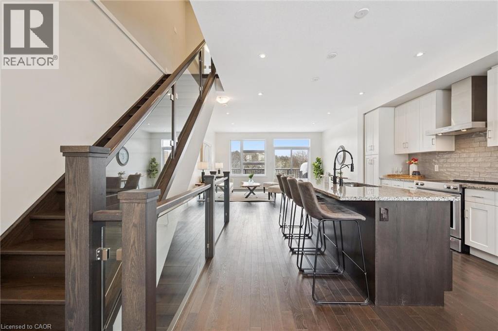 Upscale 2286sqft, 3-storey townhome located in award-winning complex in Guelph’s highly sought-after south end! Backing onto greenspace this home boasts one of the best positions in the community offering unobstructed views from the front & rear of the unit. With 3 bdrms, 3 bathrooms & potential for add'l bdrms this home delivers privacy, functionality & lifestyle. Enter main level to bonus room filled W/natural light from large windows & pot lighting. This space easily adapts to your lifestyle & works well as home office, secondary living room, playroom or teen retreat. Follow the chic wood & glass staircase to heart of the home where open-concept main living area truly impresses. Kitchen is designed for everyday living & entertaining W/white cabinetry that extends to the ceiling, S/S appliances, backsplash & contrasting island topped W/stone counters & bar seating. Kitchen flows seamlessly into dining area where large window creates perfect backdrop for family meals. Living room offers rich hardwood, oversized windows & sliding glass door that opens to balcony overlooking treetops. This space is ideal for morning coffee or evening unwinding offering fresh air, privacy & calming connection to nature. 2pc bath completes this level. Upstairs primary bdrm offers W/I closet, large windows & private balcony. Ensuite W/dbl vanity, stone counters & glass-enclosed shower. 2 add'l bdrms & 4pc main bath W/granite counter & shower/tub. Convenient upper-level laundry! W/O bsmt offers endless possibilities to create 4th bdrm, rec room or office. Sliding doors lead to private patio extending the space outdoors. Each level of the home enjoys stunning backdrops of mature trees & protected greenspace. Easy access to 401, UofG bus route, GO Transit stops, trails & highly rated schools. You're surrounded by dining options, groceries, fitness, banks & more. Stone Rd Mall & amenities are a short drive away making this an exceptional location for families, professionals & commuters! (id:4555)