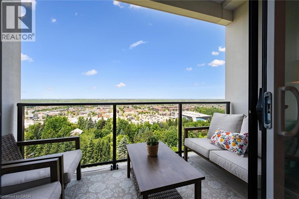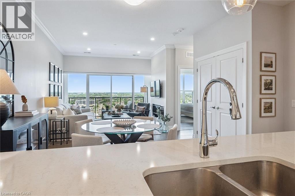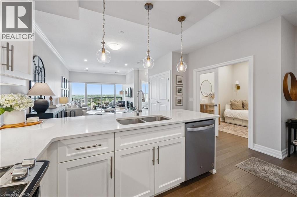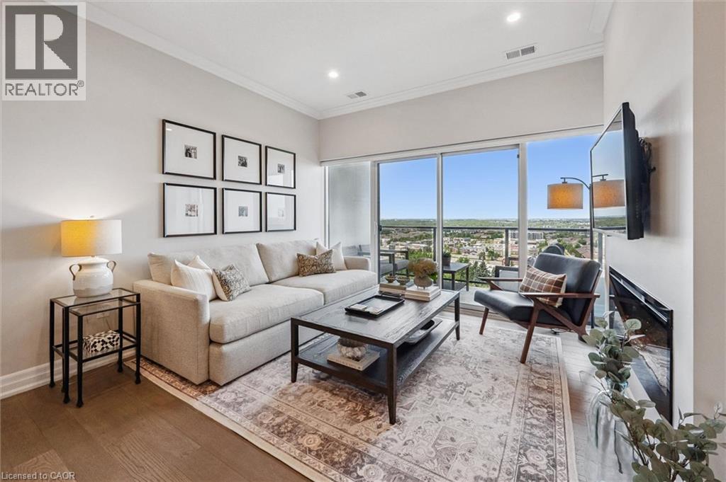 Set high above Guelph's vibrant south-end this suite showcases impressive 941sqft, 1-bdrm + den where modern elegance meets breathtaking views! Bathed in natural light this unit captures sweeping vistas of treetops & city skyline offering serene backdrop for everyday living. At this price point it offers exceptional value per sqft in one of Guelph's desirable neighbourhoods. Designed W/upscale finishes this modern suite exudes comfort & sophistication. Soaring ceilings & wide-plank engineered hardwood create airy ambience that flows seamlessly through the open-concept living space. Relax by fireplace in living room or step onto private balcony-ideal spot to sip morning coffee or unwind & take in city views. Gourmet kitchen W/white cabinetry, quartz counters, backsplash & S/S appliances. Oversized breakfast bar W/pendant lighting invites casual dining & entertaining. Primary bdrm W/floor-to-ceiling windows deliver breathtaking vistas. Luxurious 4pc bath W/oversized vanity, quartz counters & soaker tub surrounded by marble-inspired tile. French doors reveal versatile den-ideal as home office, guest room or creative studio. W/I closet in entryway & pantry off dining area keep everything organized & within reach. Live, work & play without leaving home! Residents enjoy amenities: state-of-the-art fitness, golf simulator lounge W/bar, social spaces W/kitchen, billiards, lounge seating & outdoor terrace. Underground parking for yr-round convenience! For parents of U of G students this suite is a smart alternative to renting. Invest in an appreciating asset 10-min from campus W/direct bus access. 24/7 on-site mgmt & controlled entry, you'll have peace of mind knowing your child is living safely while your investment grows in value. Steps to Pergola Commons for access to groceries, restaurants & shops. Quick access to 401 for commuters. Whether you're picking up produce, meeting friends for dinner or exploring parks & trails, this neighbourhood has it all! (id:4555)