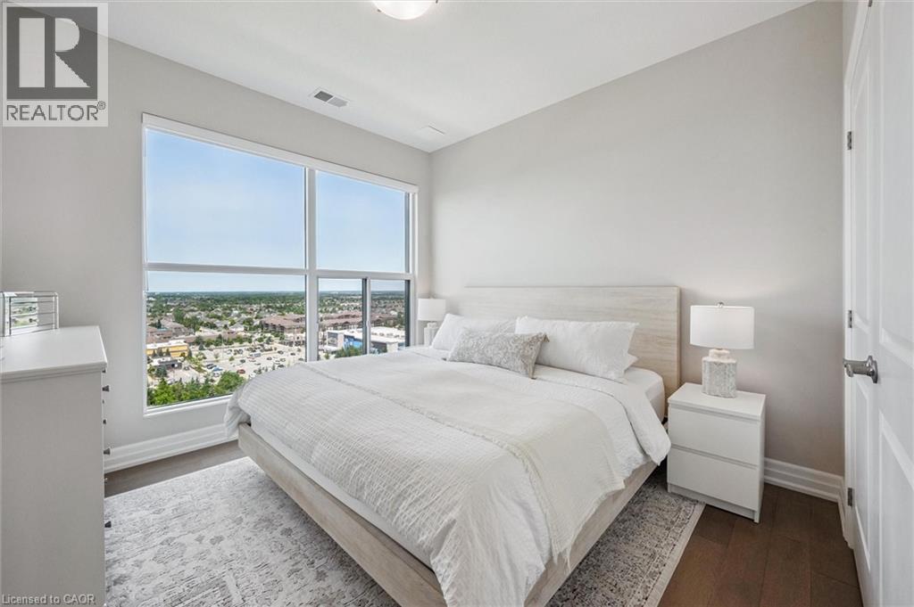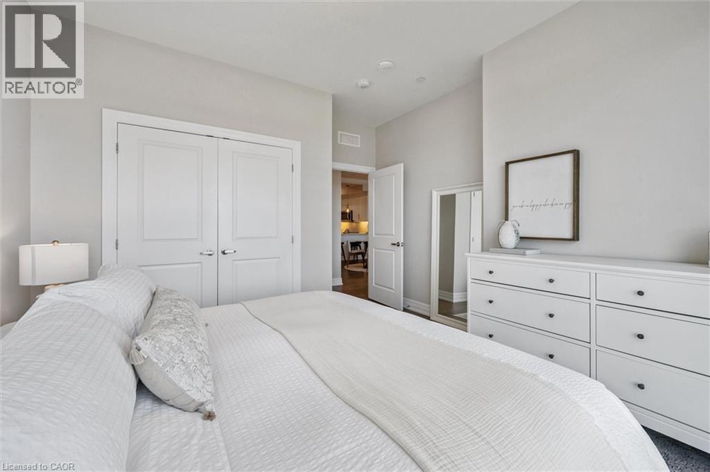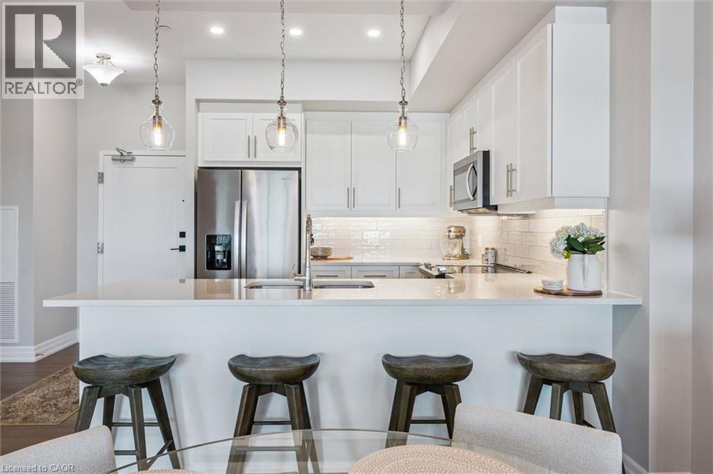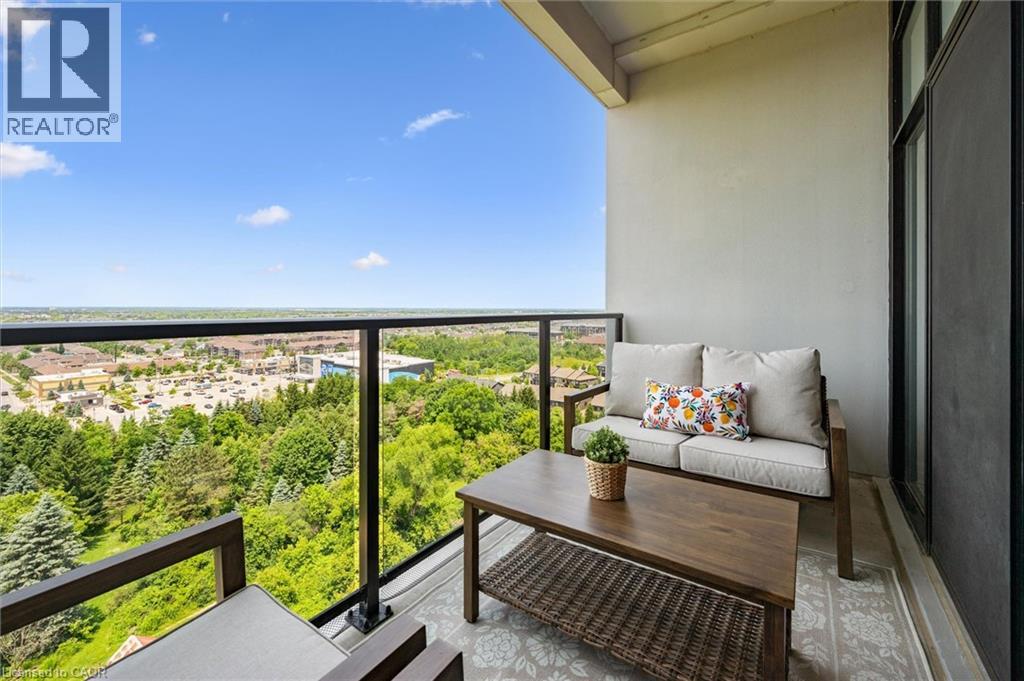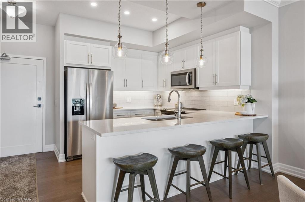 Set high above Guelph's vibrant south-end this suite showcases impressive 941sqft, 1-bdrm + den where modern elegance meets breathtaking views! Bathed in natural light this unit captures sweeping vistas of treetops & city skyline offering serene backdrop for everyday living. At this price point it offers exceptional value per sqft in one of Guelph's desirable neighbourhoods. Designed W/upscale finishes this modern suite exudes comfort & sophistication. Soaring ceilings & wide-plank engineered hardwood create airy ambience that flows seamlessly through the open-concept living space. Relax by fireplace in living room or step onto private balcony-ideal spot to sip morning coffee or unwind & take in city views. Gourmet kitchen W/white cabinetry, quartz counters, backsplash & S/S appliances. Oversized breakfast bar W/pendant lighting invites casual dining & entertaining. Primary bdrm W/floor-to-ceiling windows deliver breathtaking vistas. Luxurious 4pc bath W/oversized vanity, quartz counters & soaker tub surrounded by marble-inspired tile. French doors reveal versatile den-ideal as home office, guest room or creative studio. W/I closet in entryway & pantry off dining area keep everything organized & within reach. Live, work & play without leaving home! Residents enjoy amenities: state-of-the-art fitness, golf simulator lounge W/bar, social spaces W/kitchen, billiards, lounge seating & outdoor terrace. Underground parking for yr-round convenience! For parents of U of G students this suite is a smart alternative to renting. Invest in an appreciating asset 10-min from campus W/direct bus access. 24/7 on-site mgmt & controlled entry, you'll have peace of mind knowing your child is living safely while your investment grows in value. Steps to Pergola Commons for access to groceries, restaurants & shops. Quick access to 401 for commuters. Whether you're picking up produce, meeting friends for dinner or exploring parks & trails, this neighbourhood has it all! (id:4555)
