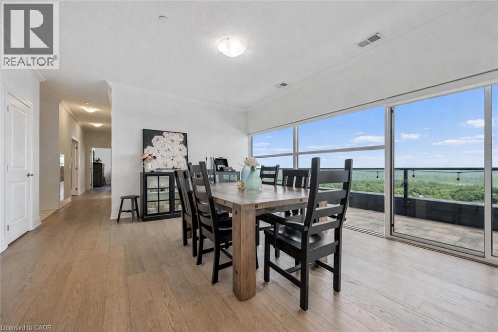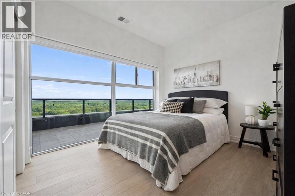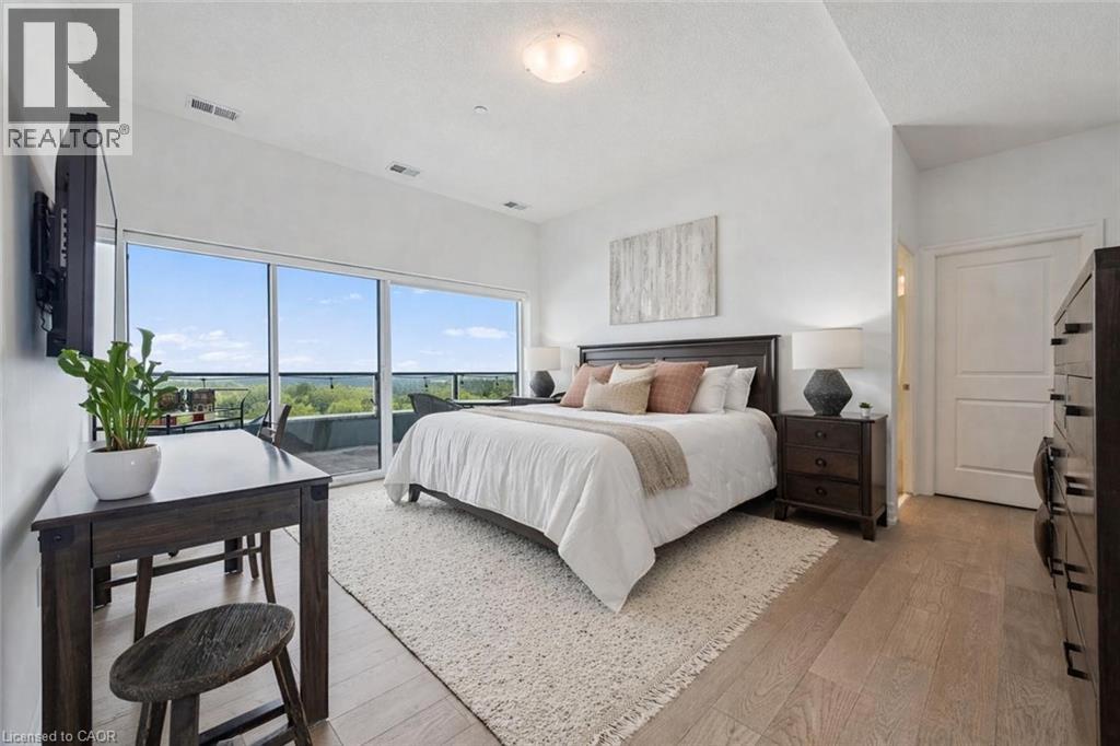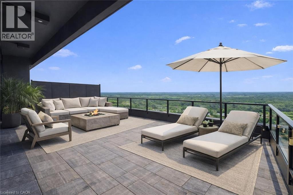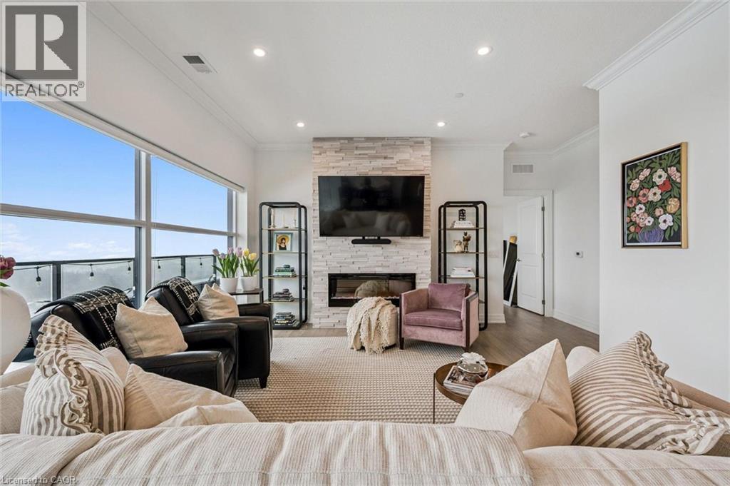Spectacular 3-bdrm + den residence offering 2006sqft of refined living space in Guelph’s most sought-after south-end addresses! Nestled within esteemed prof. managed building W/resort-style amenities, this exceptional penthouse delivers perfect balance of luxury, comfort & convenience. Breathtaking wall of floor-to-ceiling windows span living & dining areas flooding the home W/natural light & framing treetop views. Open-concept layout feels expansive yet welcoming ideal for everyday living & entertaining. Dining area flows seamlessly into living room where fireplace adds warmth & architectural interest. Sliding doors lead to massive 1042sqft south-facing private terrace offering unobstructed views over lush greenspace, tranquil water & miles of trails. Designed for unforgettable gatherings or peaceful moments, this space accommodates multiple seating areas. Whether hosting under the stars or enjoying morning coffee, this terrace isn’t just an extension of living space, it’s your serene retreat from hustle & bustle of everyday life! Chef-inspired kitchen W/white cabinetry is complemented by elegant backsplash, quartz counters & island W/breakfast bar seating. High-end S/S appliances, range hood & B/I microwave complete a space that is functional & beautiful. Primary bdrm W/dramatic wall of windows & serene views, W/I closet & ensuite W/dbl quartz vanity, soaker tub & W/I glass shower. 2 add'l bdrms offer large windows & closet space. Glass French doors open to den perfectly suited for home office or reading room. 4pc main bath W/quartz counters & W/I glass shower. 2pc bath completes the layout. Enjoy access to impressive amenities: state-of-the-art fitness centre, lounge W/kitchen & billiards, outdoor terrace, golf simulation W/bar area & guest suites. Located in the vibrant south end you'll have access to 401, UofG, GO Transit, dining, shopping & more. Penthouse 1404 is a rare offering, 1 of only 4 penthouses combining exceptional space, views & elevated lifestyle! (id:4555)