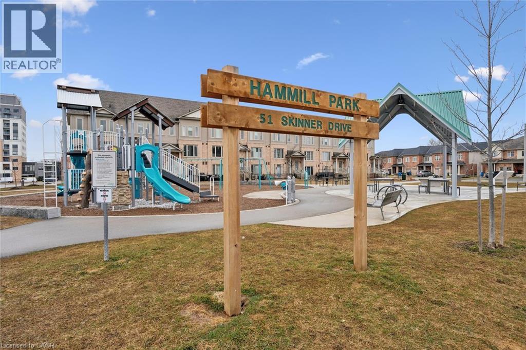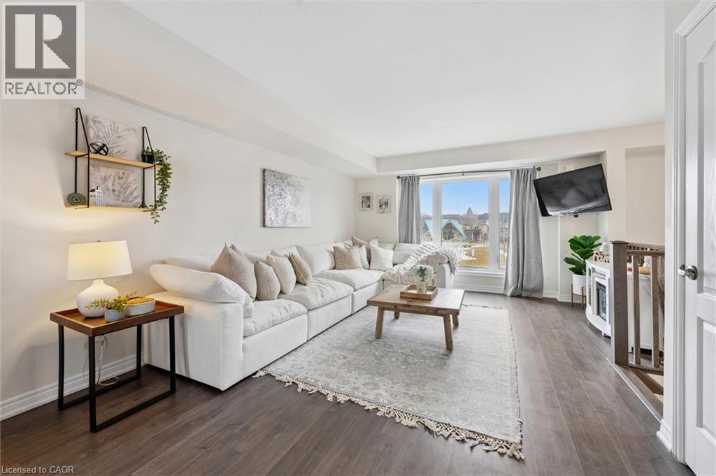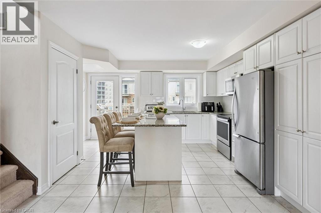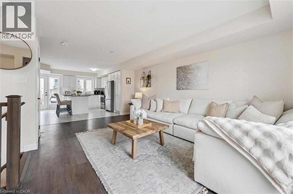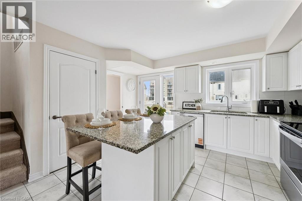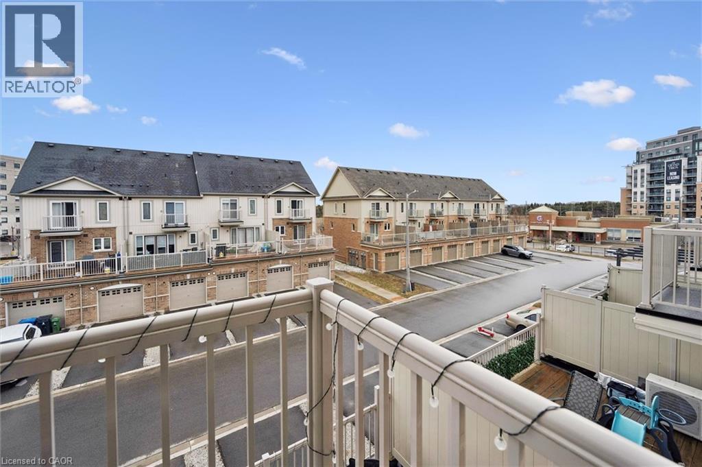 Three-bedroom, three-bathroom homes with a garage don't come up for often in these townhouse blocks. This end-unit was built in 2019, features a spacious living room with luxury vinyl flooring and a large window to allow plenty of natural light. Open to the kitchen, which features lots of beautiful white cabinetry, an island with granite counters, stainless steel appliances, a subway tile backsplash and doors leading to a private terrace that can easily fit a large table and chairs. There is also a powder room on this level. Upstairs has three bedrooms and two bathrooms - the primary bedroom has a walk in closet, ensuite bathroom with quartz counters and a walk-in shower. There is also a sliding door to a private balcony from this bedroom. A very convenient laundry room completes this level. Downstairs provides interior access to a single car garage, plus you have a second parking spot in your driveway. There is a park directly across the street, so there are no neighbours obstructing your front view!. The east end of Guelph has fantastic schools, a public library, Eastview Park with a splash pad, disc golf, and soccer fields, amazing walking trails and great access to the GTA from Guelph Line!. Of note: On-demand water heater, dishwasher (2026), water softener (2025), and low condo fees of $197.14. (id:4555)