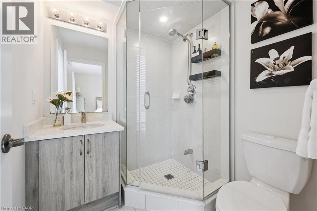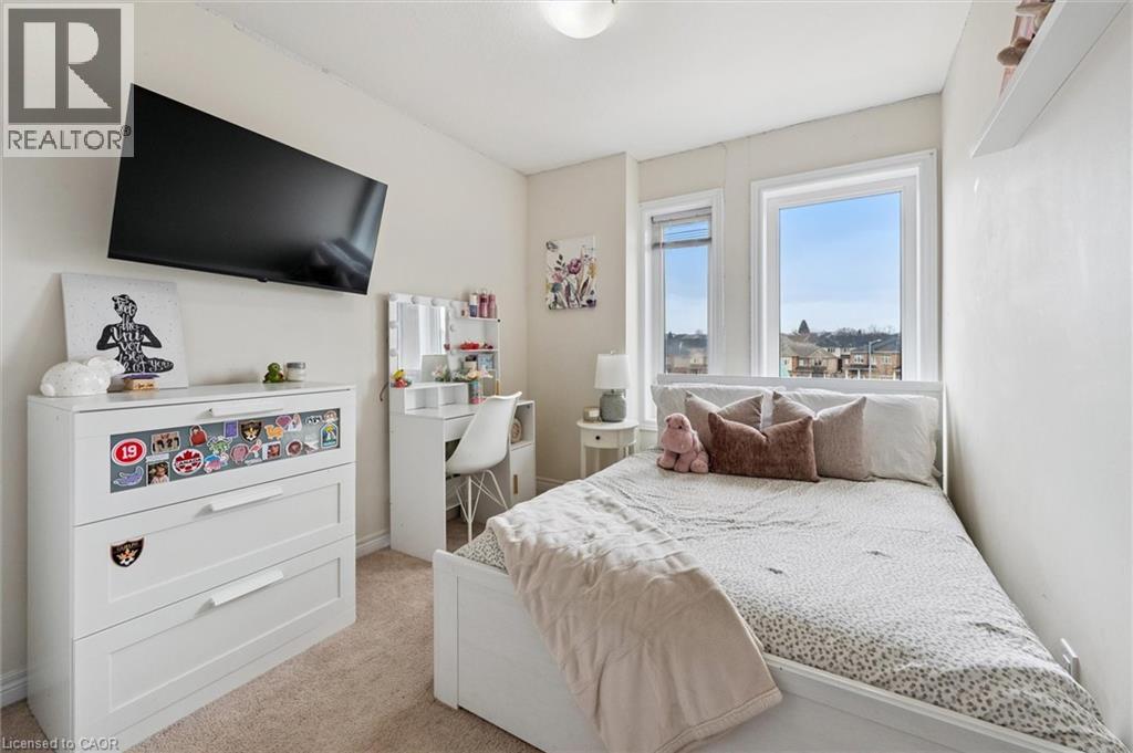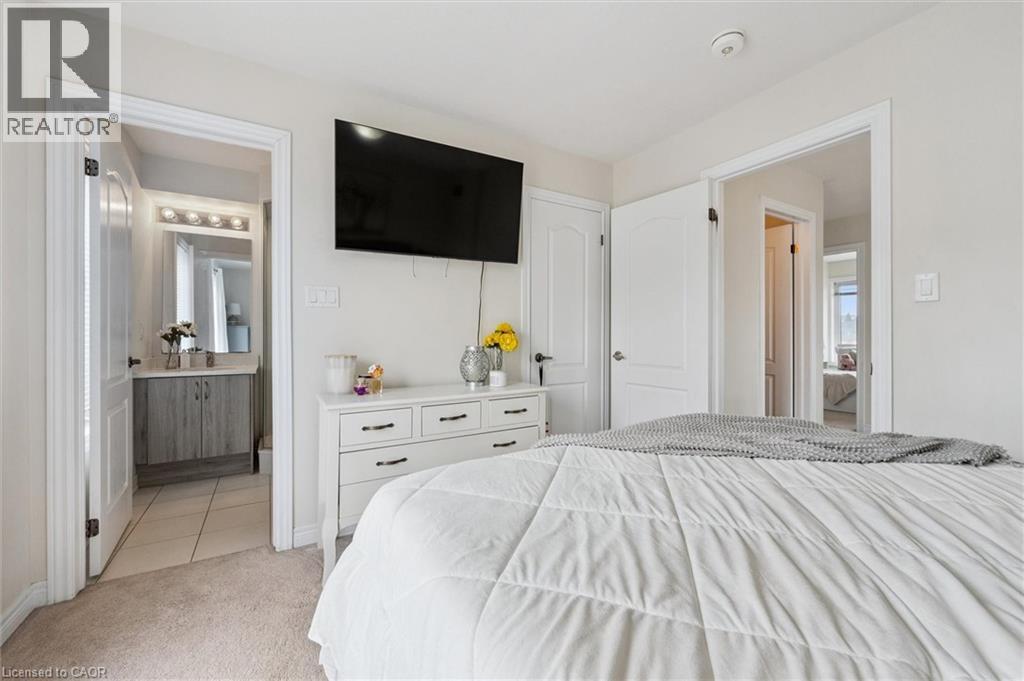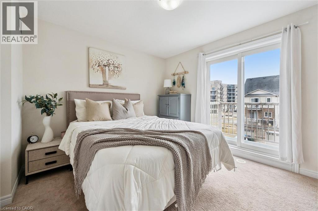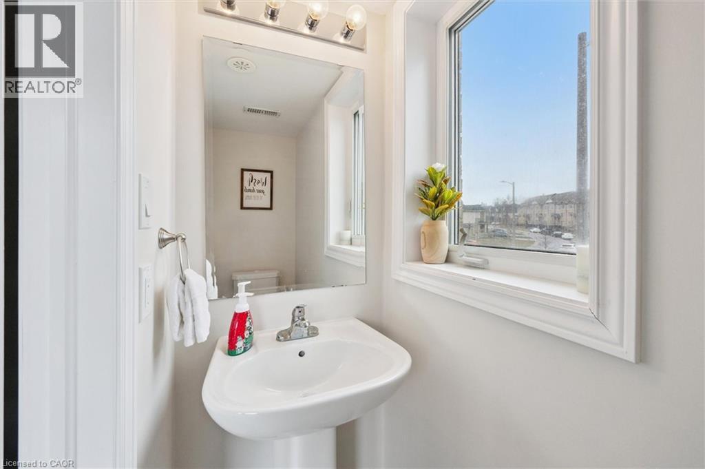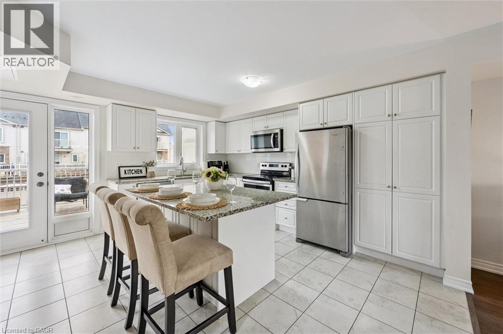 Three-bedroom, three-bathroom homes with a garage don't come up for often in these townhouse blocks. This end-unit was built in 2019, features a spacious living room with luxury vinyl flooring and a large window to allow plenty of natural light. Open to the kitchen, which features lots of beautiful white cabinetry, an island with granite counters, stainless steel appliances, a subway tile backsplash and doors leading to a private terrace that can easily fit a large table and chairs. There is also a powder room on this level. Upstairs has three bedrooms and two bathrooms - the primary bedroom has a walk in closet, ensuite bathroom with quartz counters and a walk-in shower. There is also a sliding door to a private balcony from this bedroom. A very convenient laundry room completes this level. Downstairs provides interior access to a single car garage, plus you have a second parking spot in your driveway. There is a park directly across the street, so there are no neighbours obstructing your front view!. The east end of Guelph has fantastic schools, a public library, Eastview Park with a splash pad, disc golf, and soccer fields, amazing walking trails and great access to the GTA from Guelph Line!. Of note: On-demand water heater, dishwasher (2026), water softener (2025), and low condo fees of $197.14. (id:4555)