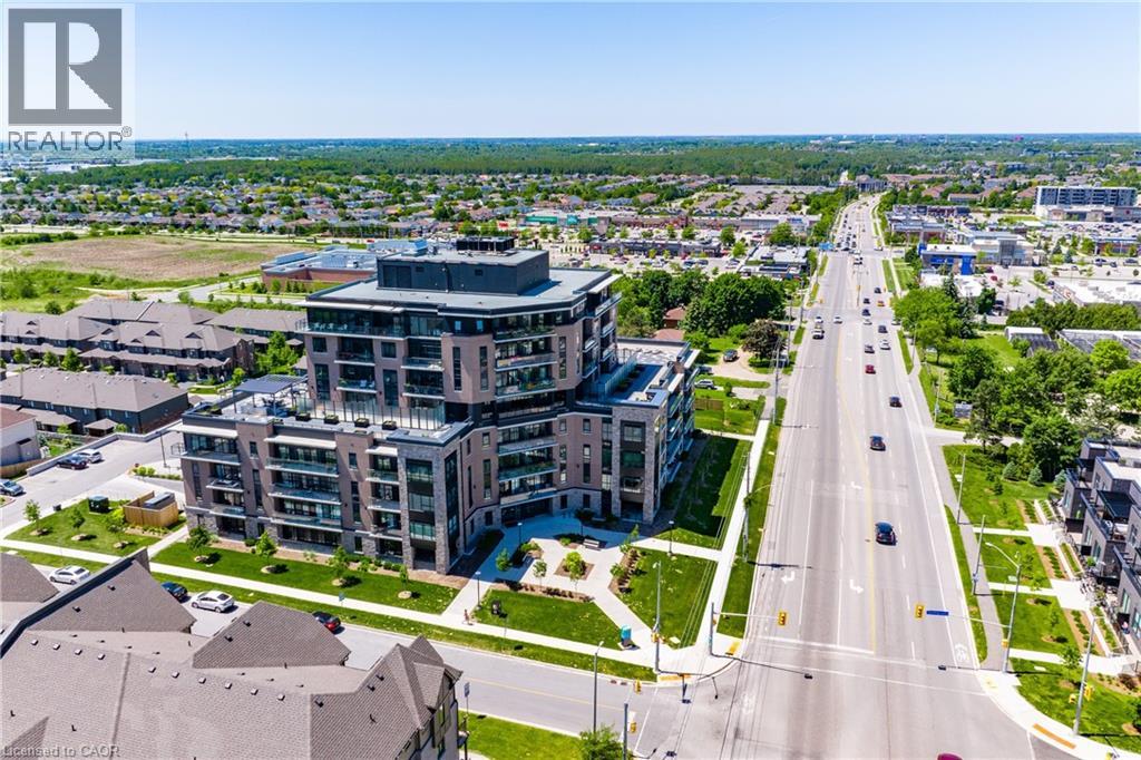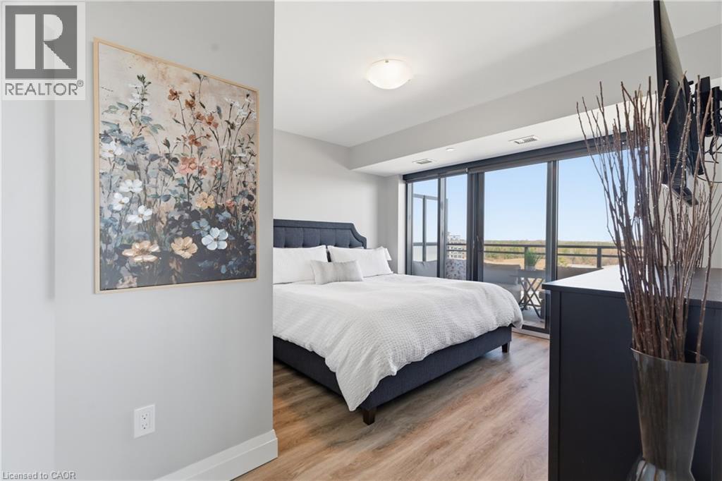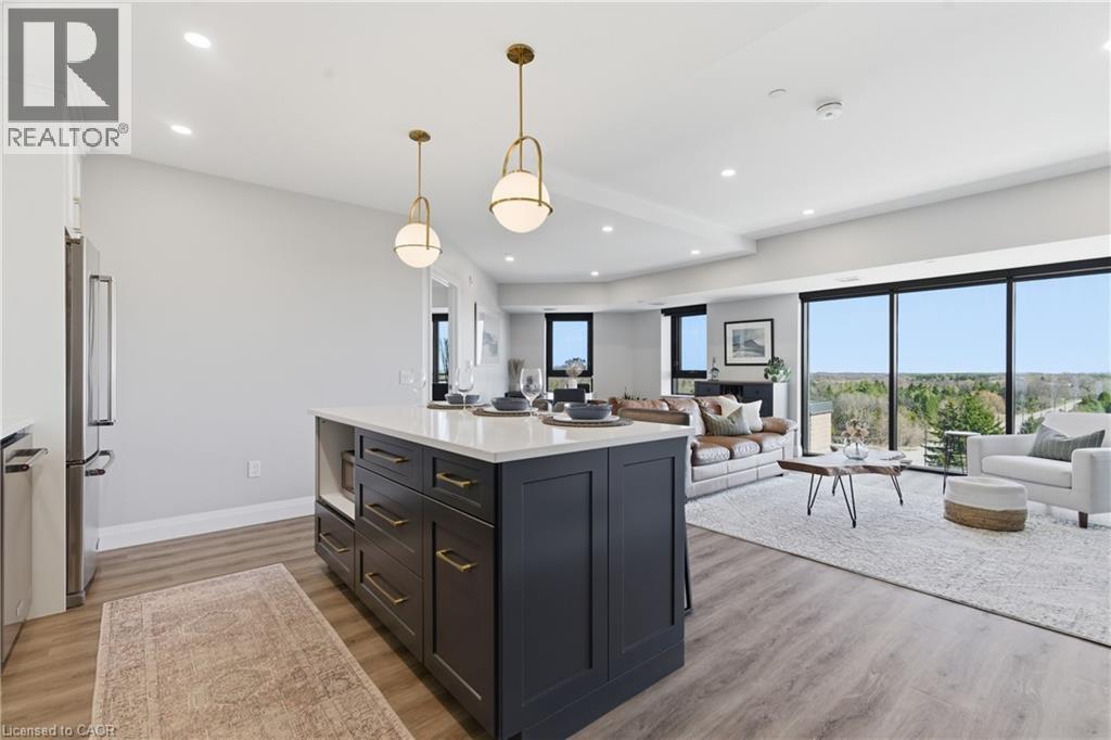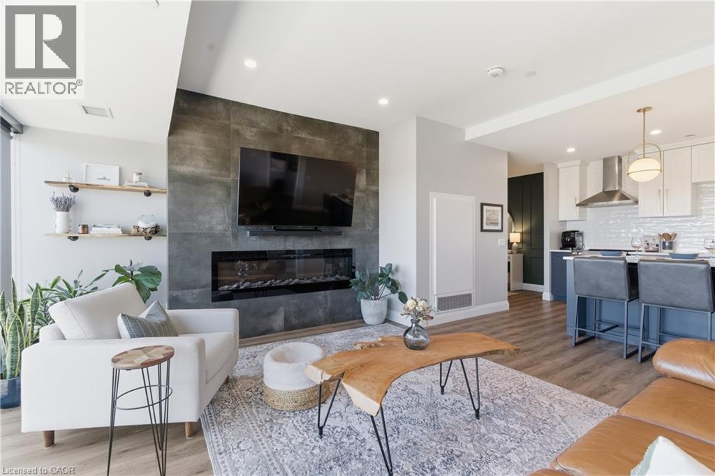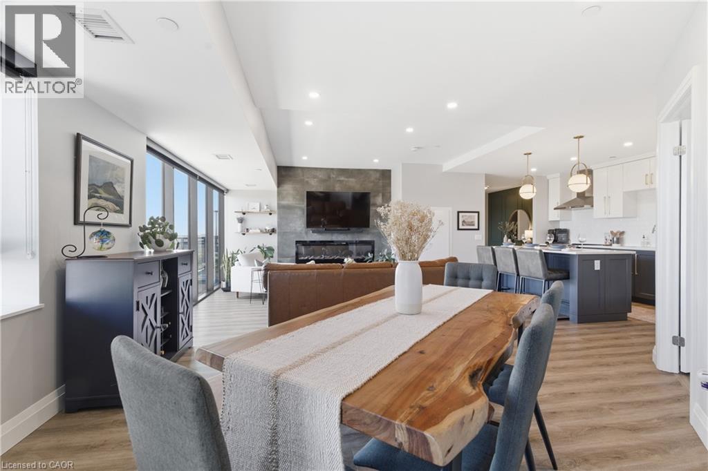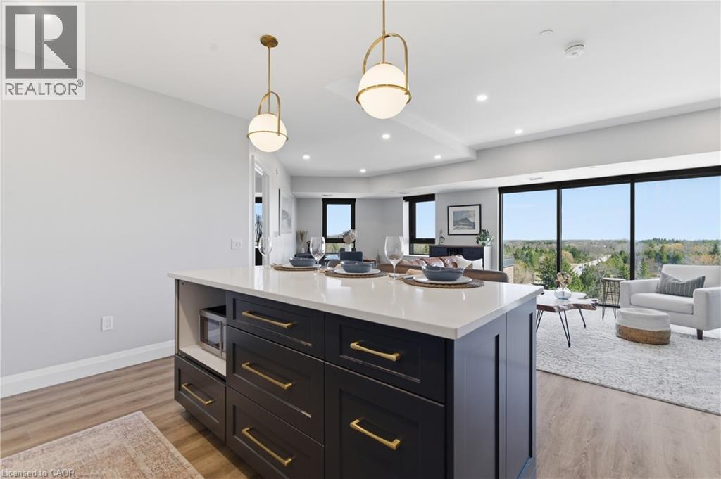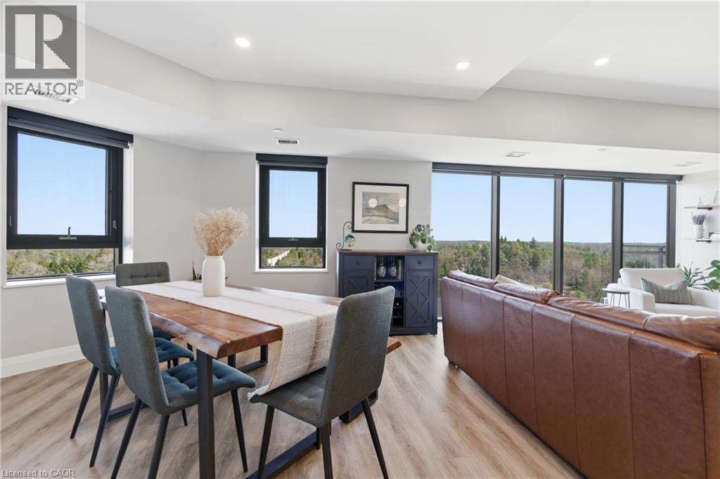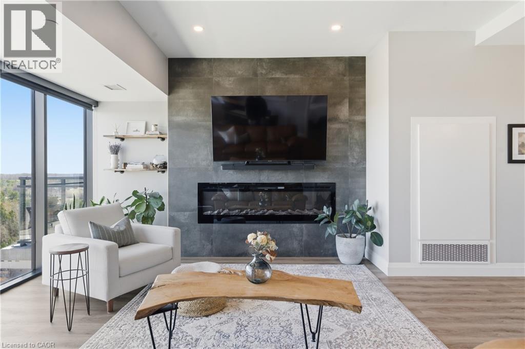 Welcome to penthouse living at its finest in the heart of South Guelph. Perched above the trees, this renovated 2-bedroom, 2-bathroom condo offers a rare combination of privacy, space, and truly unobstructed views of lush greenery. Spanning just under 1,300 square feet, the thoughtful floor plan offers an ideal balance of open-concept living and well-separated bedroom spaces—perfect for both everyday comfort and entertaining. The main living area is flooded with natural light from expansive floor-to-ceiling windows, creating a bright and inviting atmosphere while showcasing the stunning panoramic views. Fully renovated from top to bottom, this suite features modern finishes throughout, including stylish accent walls and a sleek built-in fireplace with TV mount—creating a true focal point in the living space. The kitchen connects to the dining and living areas, making it ideal for hosting or relaxing. The spacious primary bedroom retreat includes walk-in closet and a beautifully updated ensuite, while the second bedroom offers flexibility for guests, an office, or growing family. Enjoy the luxury of two private balconies—perfect for coffee, unwinding, or simply taking in the peaceful surroundings. With desirable southern exposure, the unit is bathed in natural sunlight throughout the day. This condo offers a low-maintenance lifestyle—no stairs, no grass to cut, and no snow to shovel. Underground parking adds year-round convenience and ease. Residents also enjoy access to premium building amenities, including a fully equipped gym, a stylish party room for entertaining, and a dedicated media room—adding even more value and lifestyle appeal to this exceptional property. Located just minutes from everything you need, you’re only a 5-minute drive to the highway and just 2 minutes from grocery stores, dining, gyms, and parks—offering the perfect blend of tranquility and accessibility. A rare penthouse opportunity in one of Guelph’s most sought-after neighbourhoods. (id:4555)