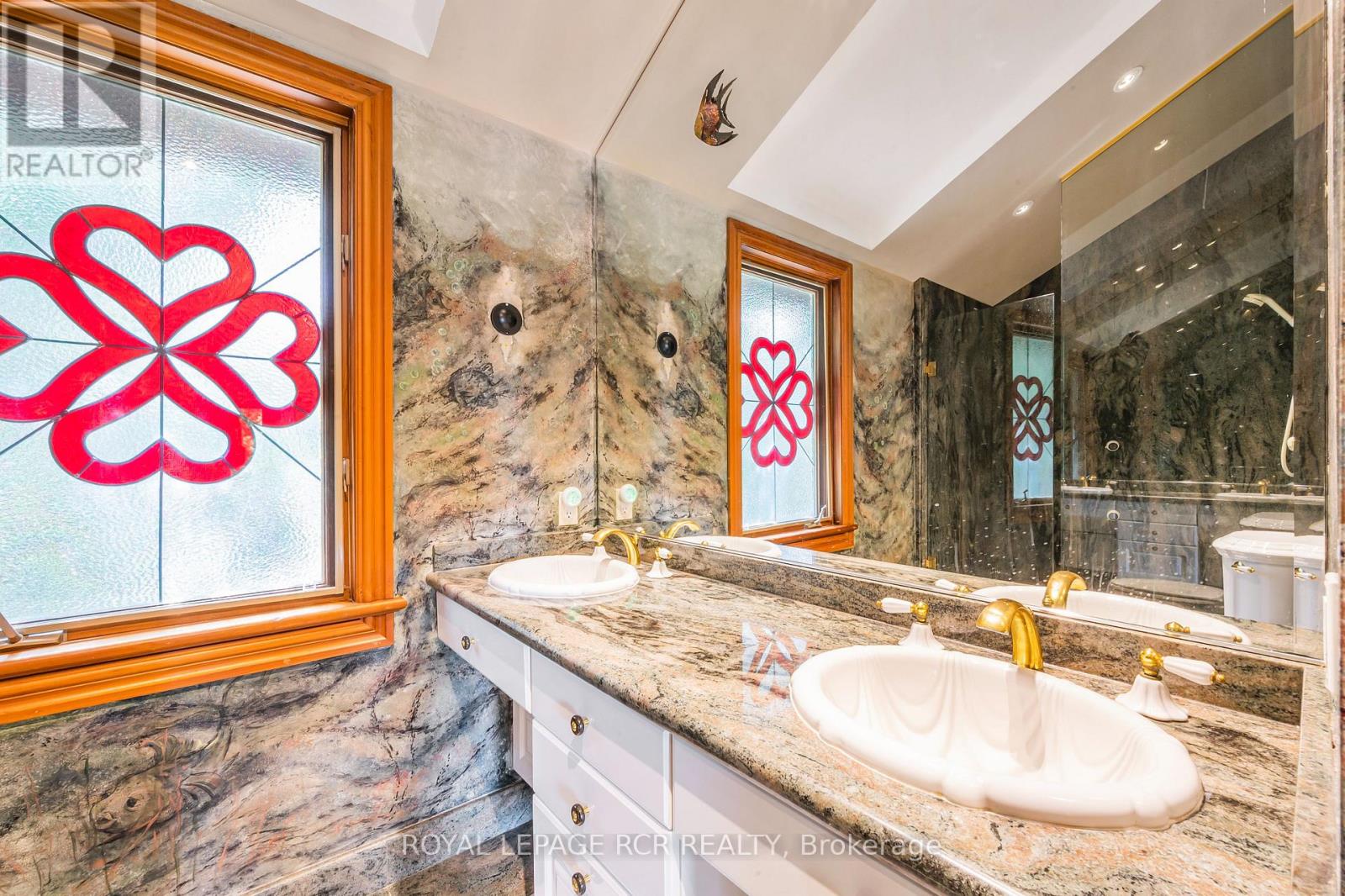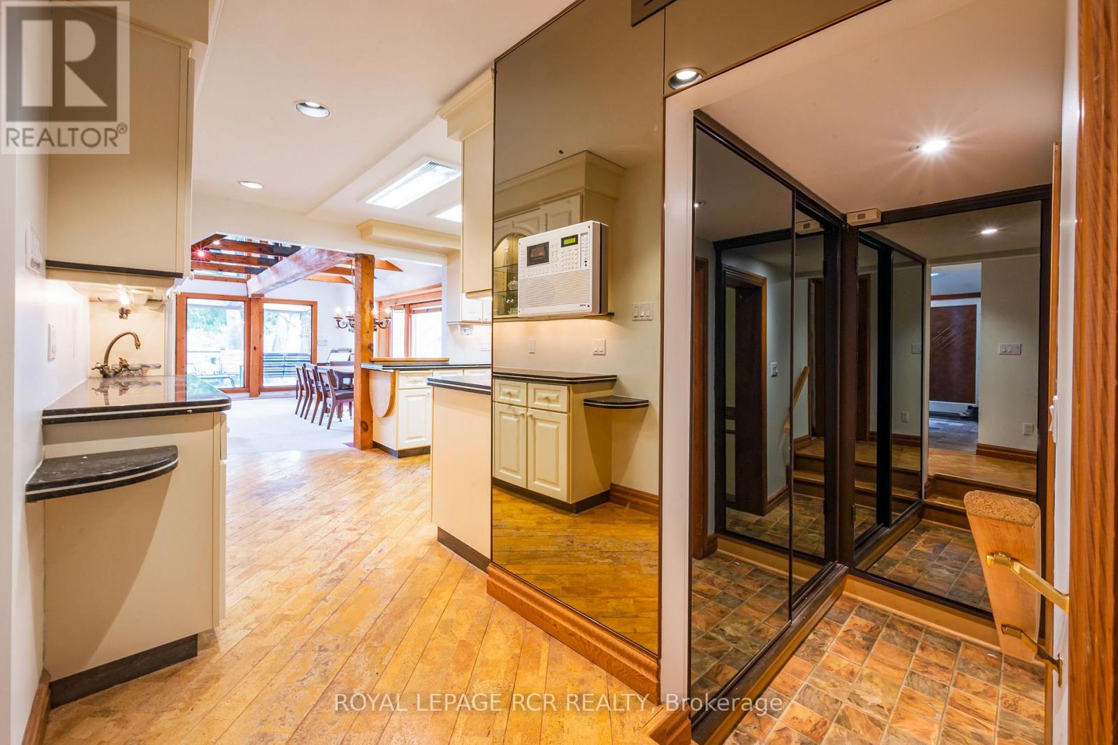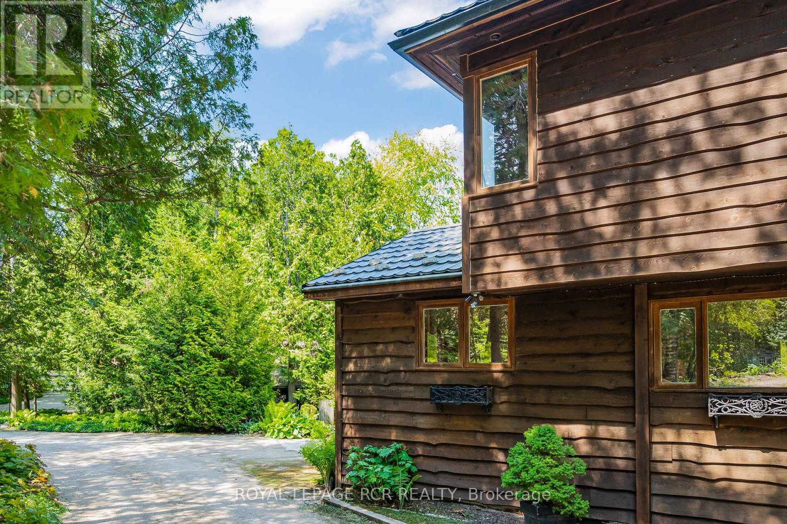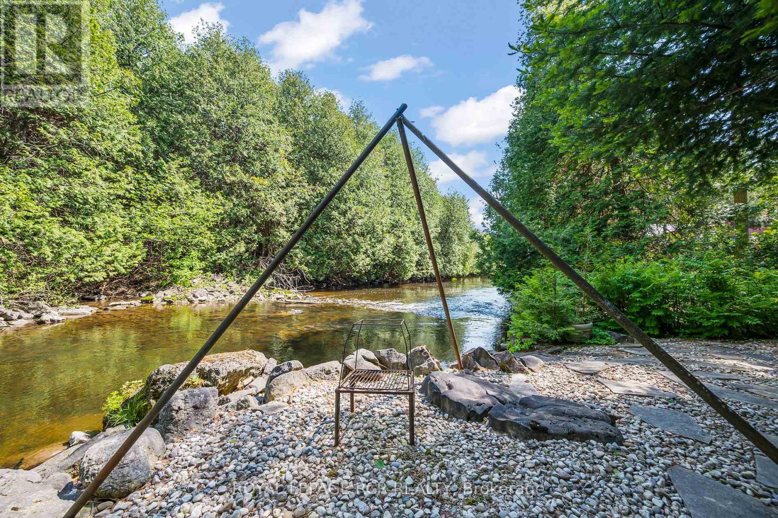 Tucked away on a secluded road, 15 River Bluff Path offers an extraordinary sanctuary blending natural beauty, creative energy, and quiet seclusion. Set on 13 acres with over 750 feet along the Eramosa River, this property presents a once-in-a-lifetime opportunity, with many unique features grandfathered in by the GRCA. The winding drive leads through a forest of mature trees to an almost otherworldly scene where a breathtaking infinity pool appears to spill into the river, surrounded by tranquil vistas and lush vegetation. Enjoy the scenery from the tiered deck, relax in the indoor hot tub, or watch wildlife such as deer, herons, and turtles. The private trail system leads to whimsical outbuildings, including a screened wooden pergola, a Japanese Maple Zen garden, and an outdoor privy. Once owned by a renowned Canadian naturalist, the property brims with creativity and inspiration. Inside, the great room captivates with soaring ceilings, stained glass accents, rustic wood beams, and a dramatic gas fireplace. A wall of windows connects the indoors to the breathtaking river view. The adjoining dining nook is perfect for gatherings, while the spacious kitchen features ample storage, a skylight, and an iconic AGA gas cooker. The main floor includes a vaulted-ceiling bedroom, a dressing/hobby room, two three-piece bathrooms (one wheelchair accessible), and a large laundry room. Upstairs, a loft-style theatre room provides an ideal space for entertainment, and two additional bedrooms share an impressive four-piece bathroom with heated floors and a spacious walk-in glass shower. With a two-car garage and an intercom system throughout, this retreat guarantees comfort and connectivity. Despite its privacy, it's just minutes from Rockwood's amenities and easily accessible to Guelph, Milton, and Pearson Airport. 15 River Bluff Path is more than just a home - it's a legacy property rooted in nature and creativity, where every moment feels extraordinary. (id:4555)