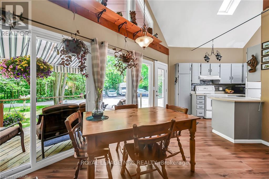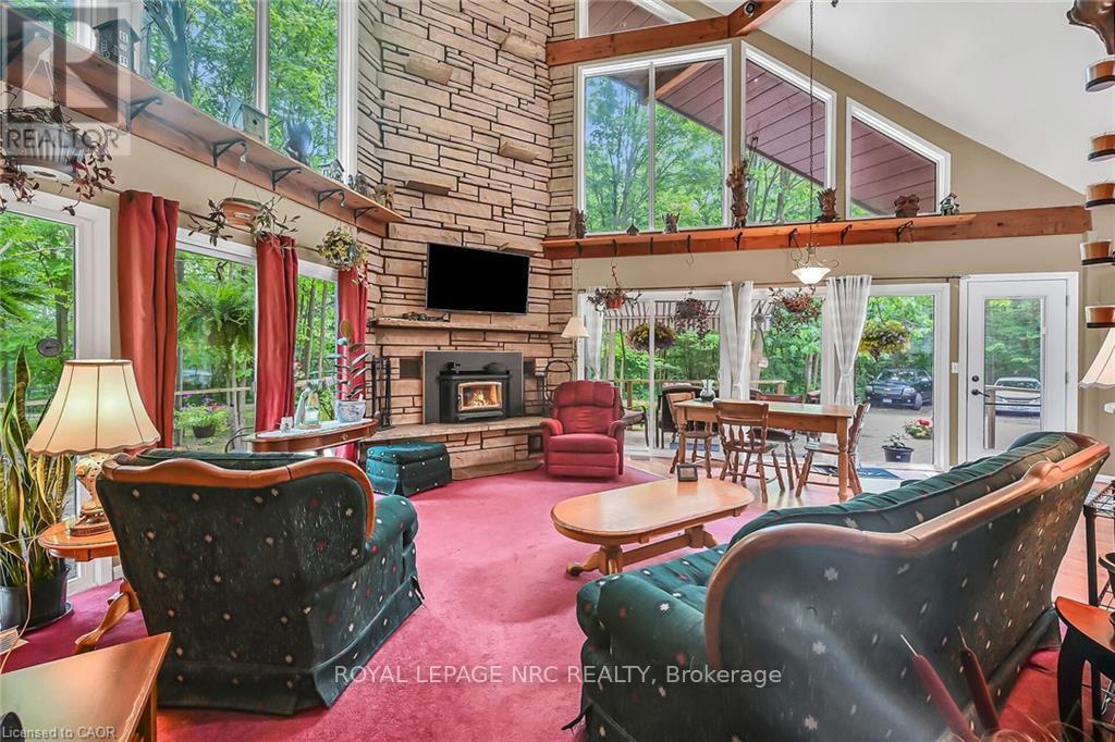 This picturesque property is a true retreat from city life. Experience natural privacy as you enter the winding driveway leading to a secluded 1-acre property that is frequented by deer, wild turkeys, rabbits, squirrels and various bird species. The sturdy chalet construction, with its harmonious blend of natural wood, angel-stone and expansive windows, invites the outdoors inside, creating an atmosphere that is both elegant and inviting. For hobbyists and mechanics, the property features a 24'x36' heated 3-car garage/workshop and a 10'x15' storage shed. The open concept main floor is highlighted by a soaring cathedral ceiling, a kitchen w/skylight and ample cabinetry, a dining area with garden door access to a wrap-around deck with awning, a sun-filled great rm w/sliding patio doors, and a 2-sided wood fireplace for both indoor and outdoor enjoyment. There are 2 spacious main floor bedrooms and a 4pc bath with cedar accent wall and an exterior door for bathroom access from the deck. The 2nd floor contains a primary 3rd bedroom, plus a home office area. The upper floor includes a potential 4th bedrm. The partially finished basement houses the laundry/utility rm and provides ample storage space. Notable amenities include a propane furnace, c/air, 15,000-gal cistern, septic system, and 200-amp hydro. Situated on a paved year- round road in a tranquil setting surrounded by a serene forest, vibrant perennial gardens, landscaped grounds, and a large driveway ideal for parking multiple vehicles and a boat/RV. This property appeals to outdoor enthusiasts and offers a cottage-like ambiance. You will be delighted by the 4-season beauty this property offers. Conveniently located near Cayuga & Dunnville, 30-60 min commutes to Hamilton and Niagara. With all the benefits of rural living and the convenience of nearby towns, 35 Little Rd, Cayuga, truly stands apart as a sanctuary where cherished memories are just waiting to be made. (id:4555)