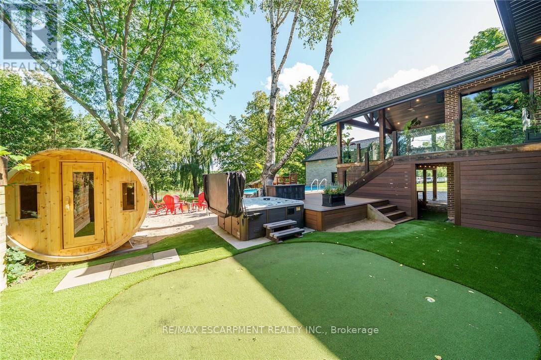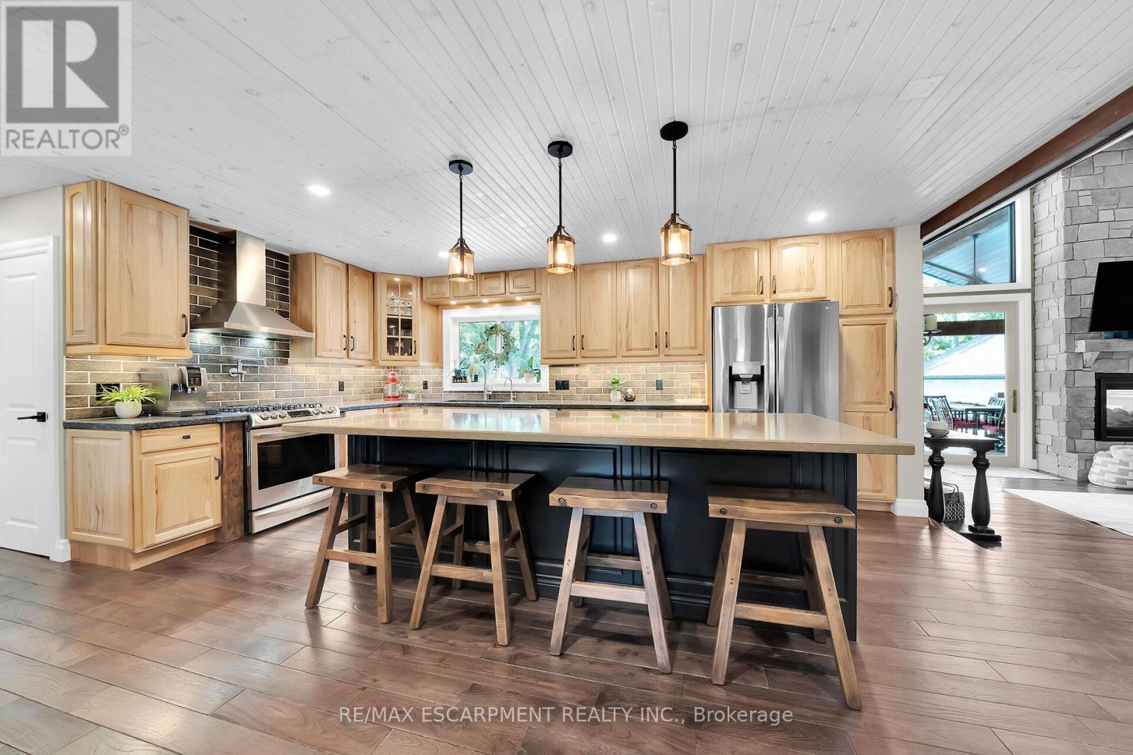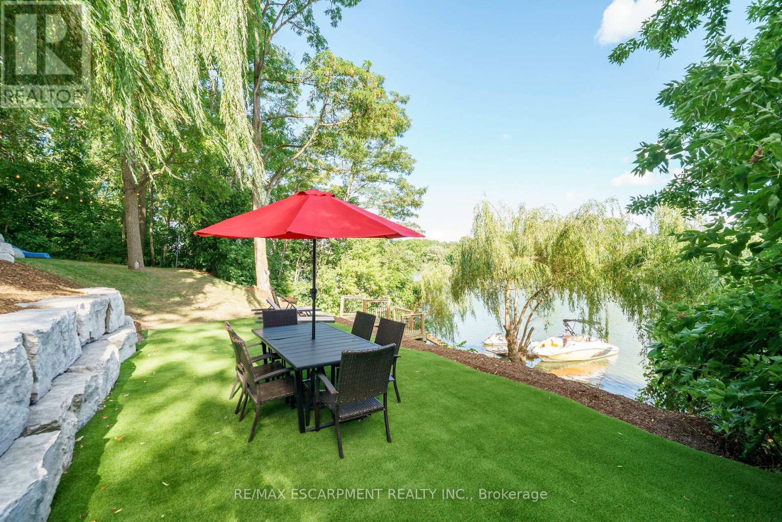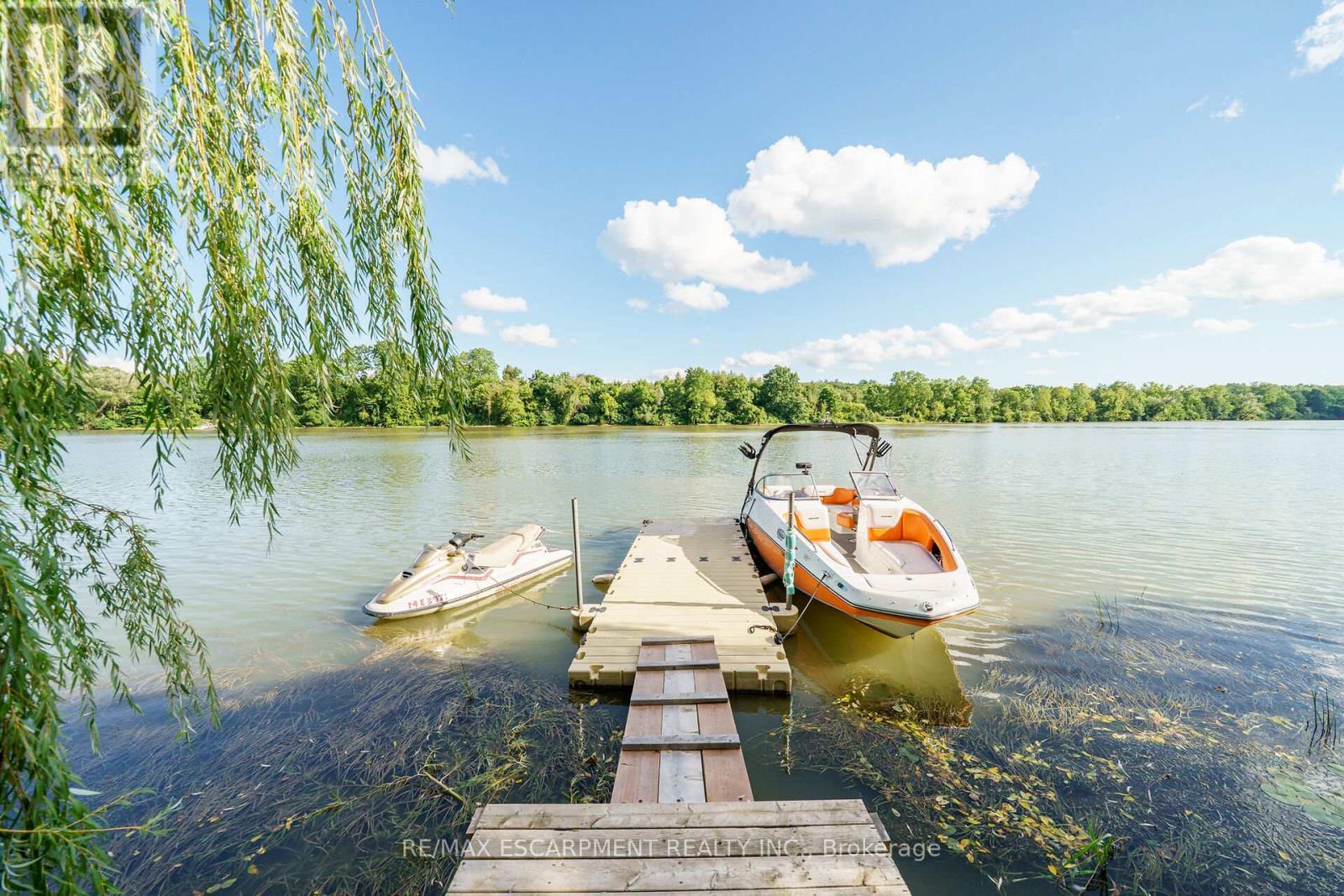 Grand River Waterfront Masterpiece! Exquisitely updated throughout by "Kreekside Construction" this 4 bedroom, 4 bathroom Bungalow with walk out basement is situated on "Muskoka" Like lot with over 20 km of navigable water. Incredible curb appeal with detached 20' x 30' garage. Entertainers dream backyard Oasis complete with covered porch, TV, stone clad double-sided gas FP, outdoor kitchen, 3 hole putting green, barrel sauna, hot tub, & heated pool. The easily accessible waterfront area includes extensive armour stone, entertaining area & 6' x 20' Dock. Stunning interior offers approximately 3200 sq ft of living space highlighted by great room with v. ceilings, fireplace, custom kitchen cabinetry with granite, & walk-in pantry, dining area, 3 MF bedrooms including primary suite with spa bathroom with soaker tub & walk in shower. Lower-level features rec room with woodstove, 4th bedroom, 2 pc bath, plus gym/living room with 2 pc bath & separate entrance. Live the Grand River Lifestyle! (id:4555)