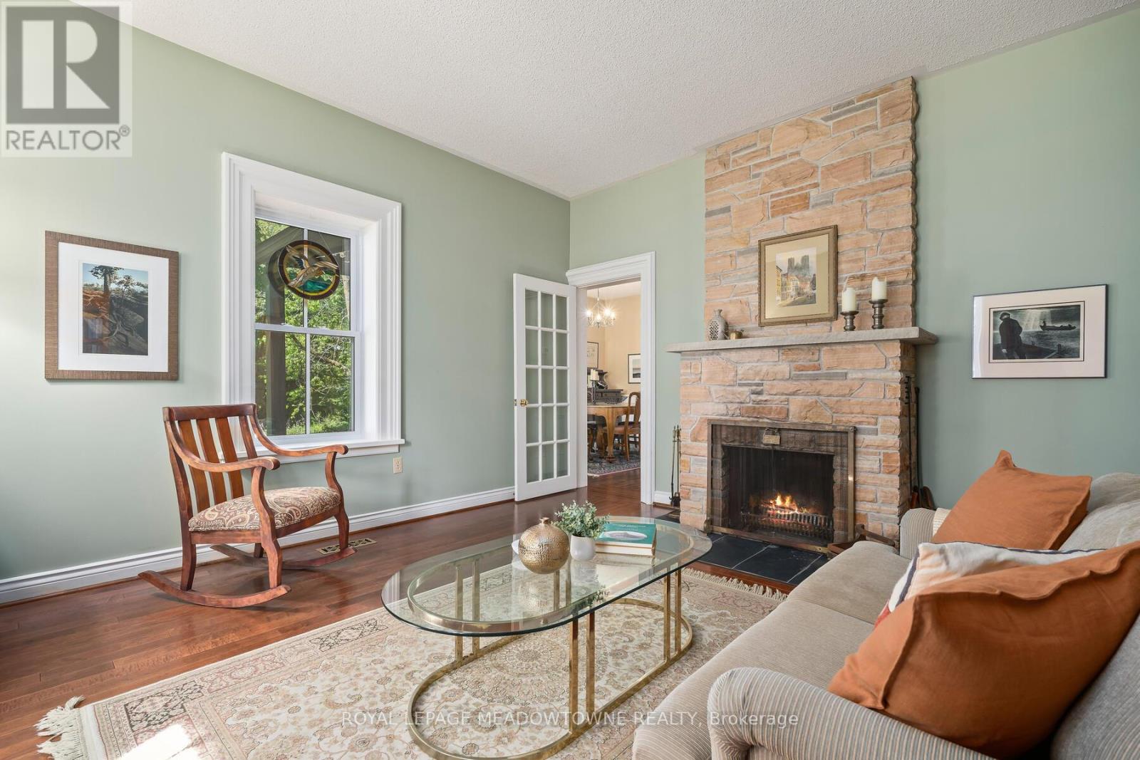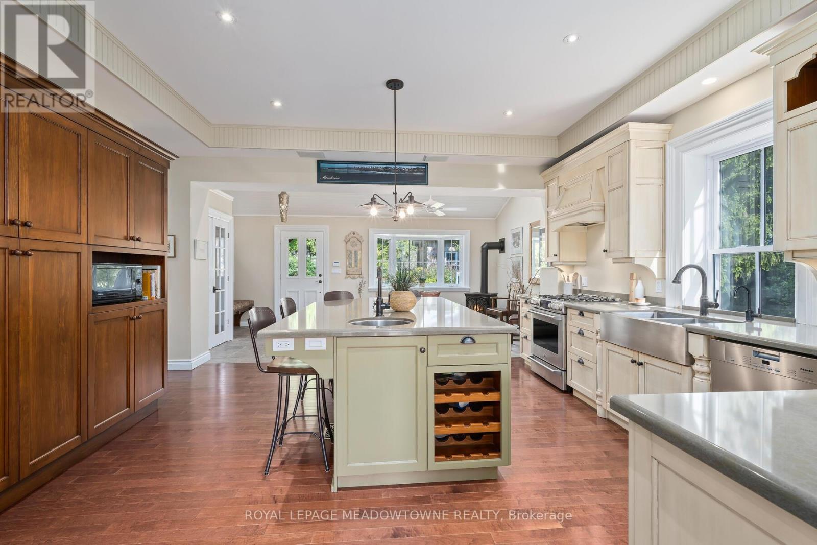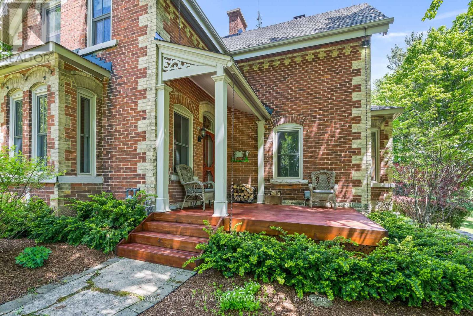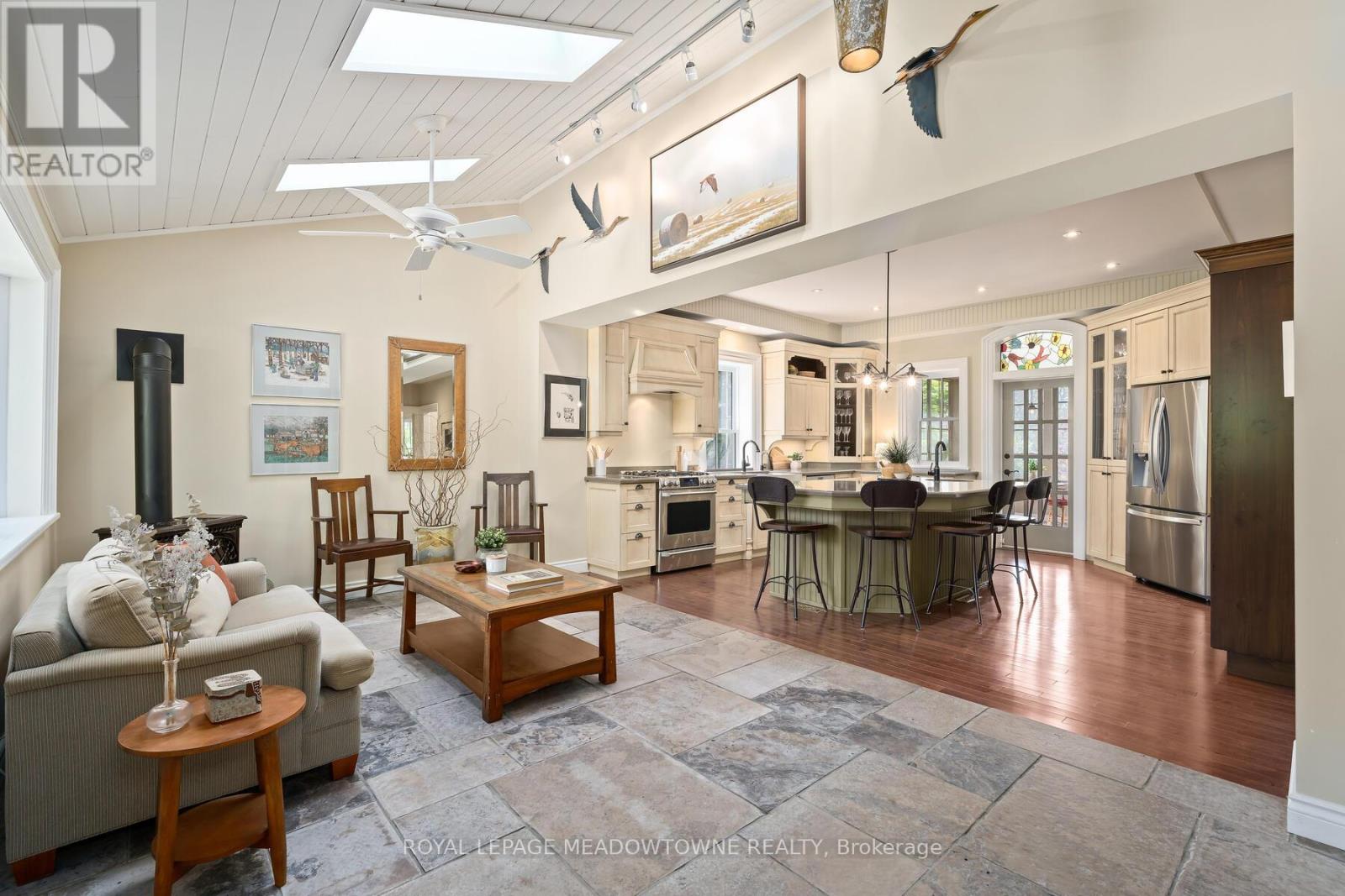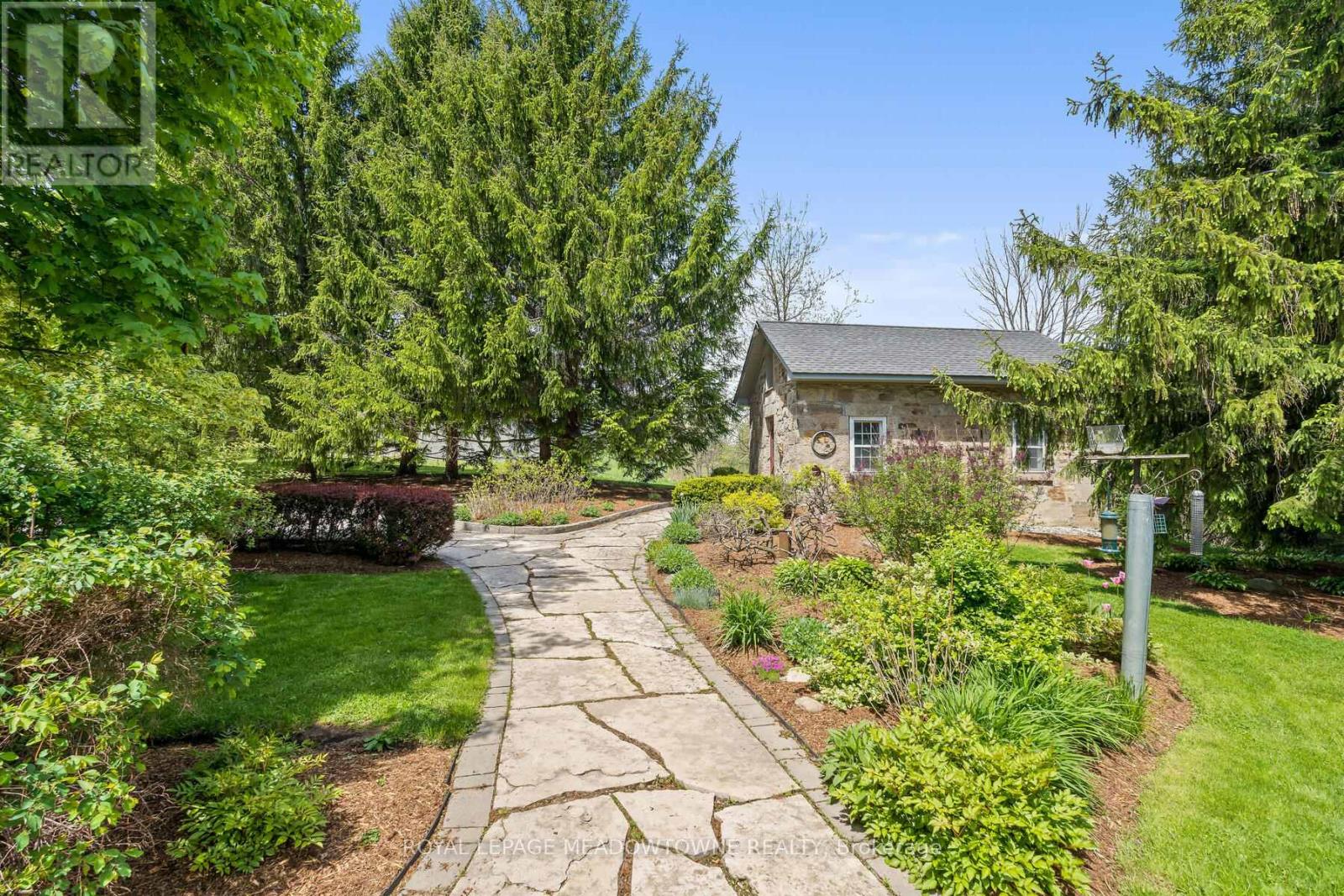 Picture perfect setting on 84+ beautiful acres in the heart of Halton Hills Country! Fabulous tree-lined drive and professionally landscaped gardens welcome you to this gorgeous century home in mint condition and completely updated with lovely country views from every window, spectacular stone studio with tons of charm and incredible barn plus a 5-bay driveshed. Versatile living space. The stone house can be used for an office, teenagers getaway, inlaw suite and so much more. Stunning open concept kitchen with quartz counters, breakfast bar, stainless steel appliances open to a sitting room with gas stove, formal living room w/cozy wood burning fireplace (with WETT compliance certificate), pretty dining room, primary suite with walk-in closet and luxurious ensuite, spacious three-season room boasting country views and tons of storage in the basement. The formal living room could work as a main floor bedroom ideal for an elderly family member making it a three bedroom home. Heated floors at entrance, hardwood flooring, main floor laundry, updated plumbing and electrical, skylights, pot lighting, wainscotting & more. Tastefully designed keeping all the charming character but with modern conveniences. Forced air gas heating - a rare find in the country! Also includes solar panels. Approx 65 acres farmed. Prime location centrally located close to Georgetown, Milton and Acton and minutes to the 401 & the GO. It's the perfect country package! (id:4555)