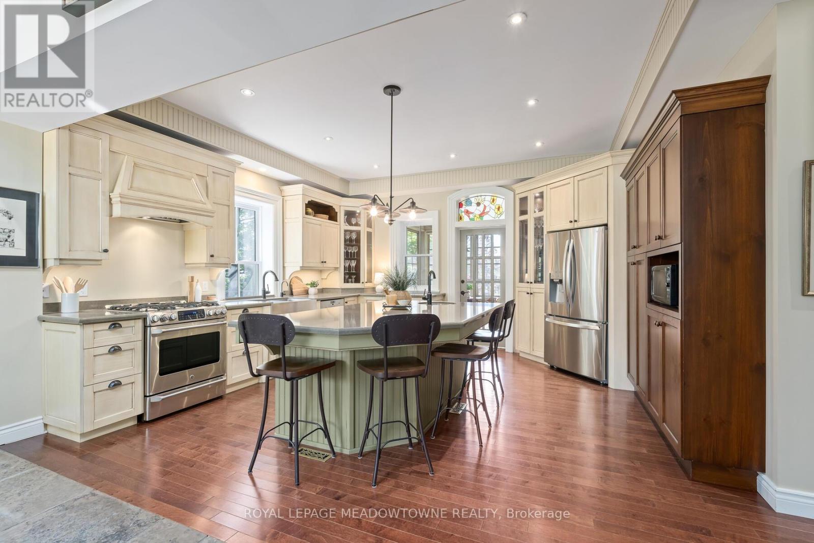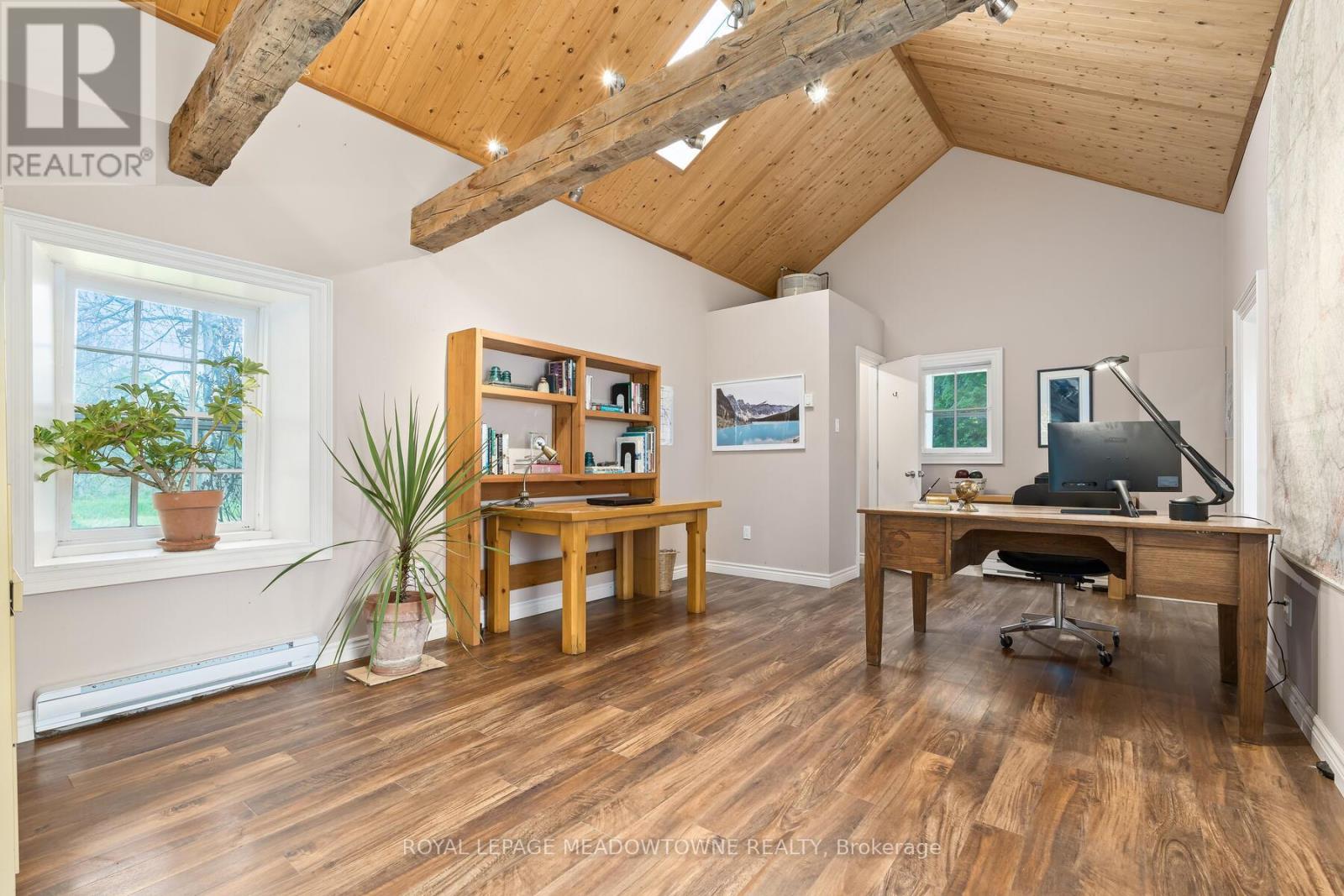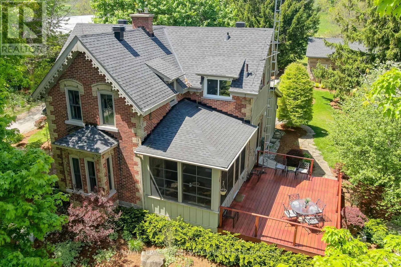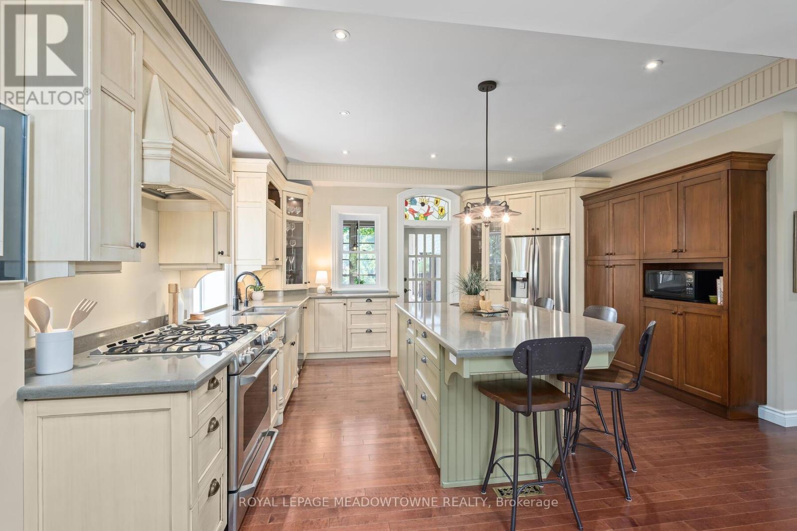Picture perfect setting on 84+ beautiful acres in the heart of Halton Hills Country! Fabulous tree-lined drive and professionally landscaped gardens welcome you to this gorgeous century home in mint condition and completely updated with lovely country views from every window, spectacular stone studio with tons of charm and incredible barn plus a 5-bay driveshed. Versatile living space. The stone house can be used for an office, teenagers getaway, inlaw suite and so much more. Stunning open concept kitchen with quartz counters, breakfast bar, stainless steel appliances open to a sitting room with gas stove, formal living room w/cozy wood burning fireplace (with WETT compliance certificate), pretty dining room, primary suite with walk-in closet and luxurious ensuite, spacious three-season room boasting country views and tons of storage in the basement. The formal living room could work as a main floor bedroom ideal for an elderly family member making it a three bedroom home. Heated floors at entrance, hardwood flooring, main floor laundry, updated plumbing and electrical, skylights, pot lighting, wainscotting & more. Tastefully designed keeping all the charming character but with modern conveniences. Forced air gas heating - a rare find in the country! Also includes solar panels. Approx 65 acres farmed. Prime location centrally located close to Georgetown, Milton and Acton and minutes to the 401 & the GO. It's the perfect country package! (id:4555)