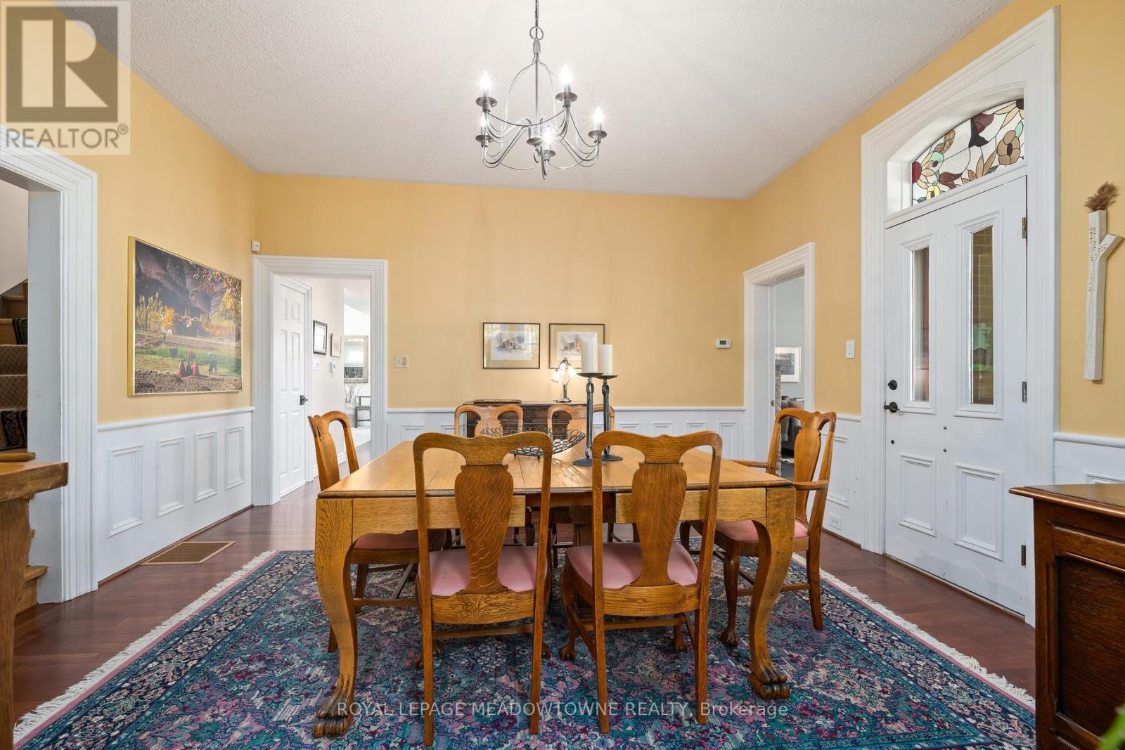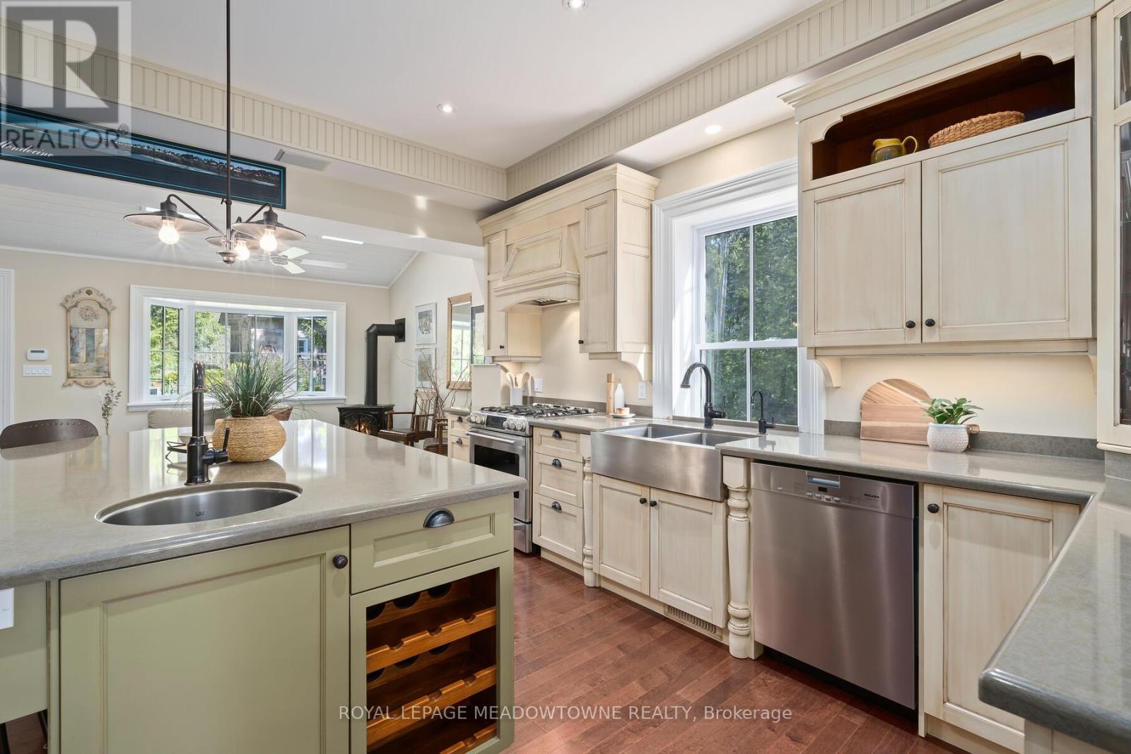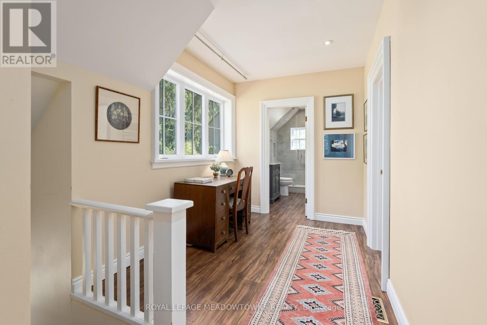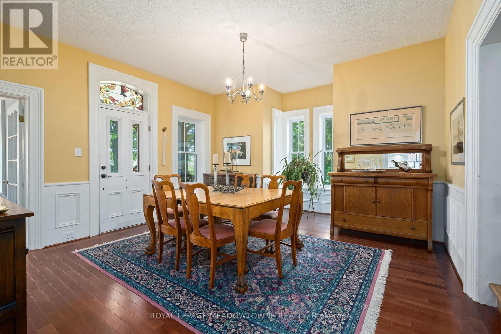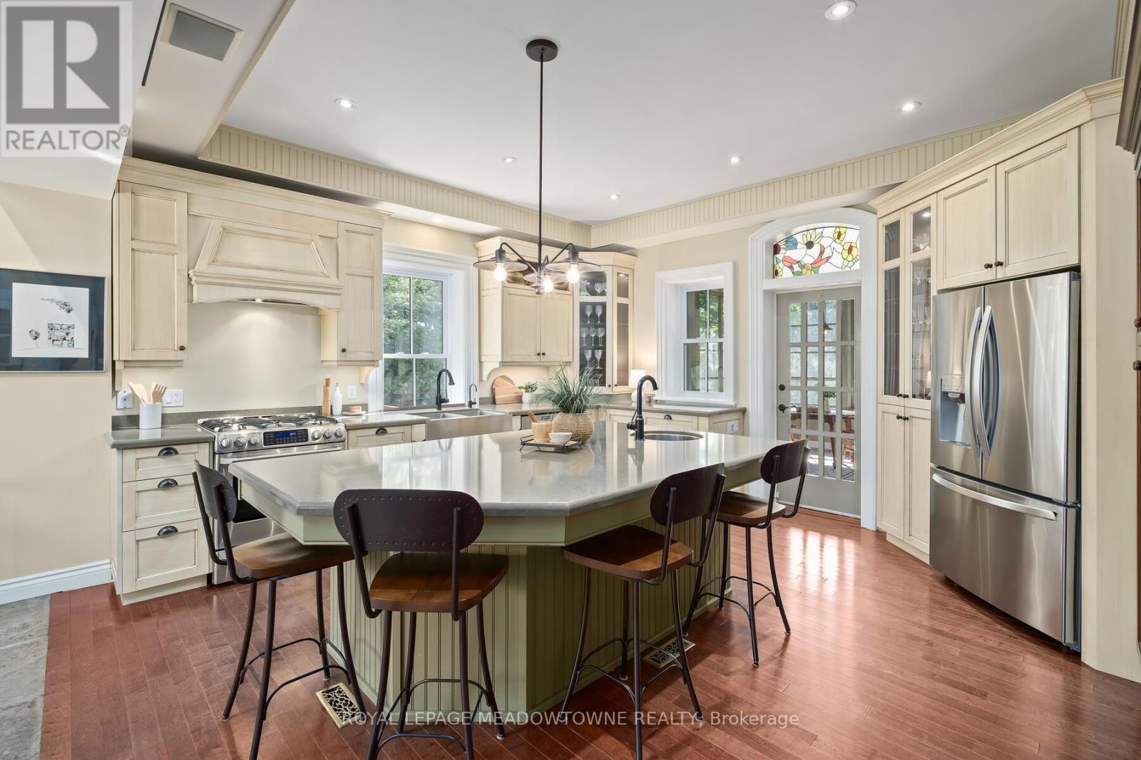 Picture perfect setting on 84+ beautiful acres in the heart of Halton Hills Country! Fabulous tree-lined drive and professionally landscaped gardens welcome you to this gorgeous century home in mint condition and completely updated with lovely country views from every window, spectacular stone studio with tons of charm and incredible barn plus a 5-bay driveshed. Versatile living space. The stone house can be used for an office, teenagers getaway, inlaw suite and so much more. Stunning open concept kitchen with quartz counters, breakfast bar, stainless steel appliances open to a sitting room with gas stove, formal living room w/cozy wood burning fireplace (with WETT compliance certificate), pretty dining room, primary suite with walk-in closet and luxurious ensuite, spacious three-season room boasting country views and tons of storage in the basement. The formal living room could work as a main floor bedroom ideal for an elderly family member making it a three bedroom home. Heated floors at entrance, hardwood flooring, main floor laundry, updated plumbing and electrical, skylights, pot lighting, wainscotting & more. Tastefully designed keeping all the charming character but with modern conveniences. Forced air gas heating - a rare find in the country! Also includes solar panels. Approx 65 acres farmed. Prime location centrally located close to Georgetown, Milton and Acton and minutes to the 401 & the GO. It's the perfect country package! (id:4555)