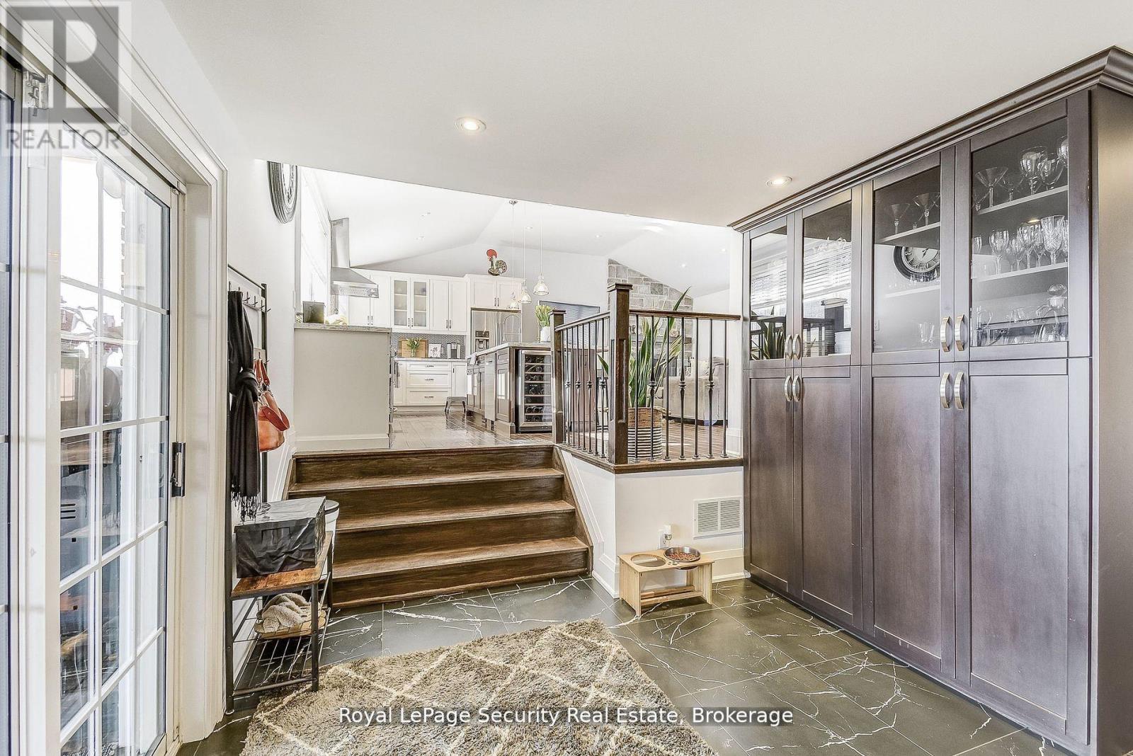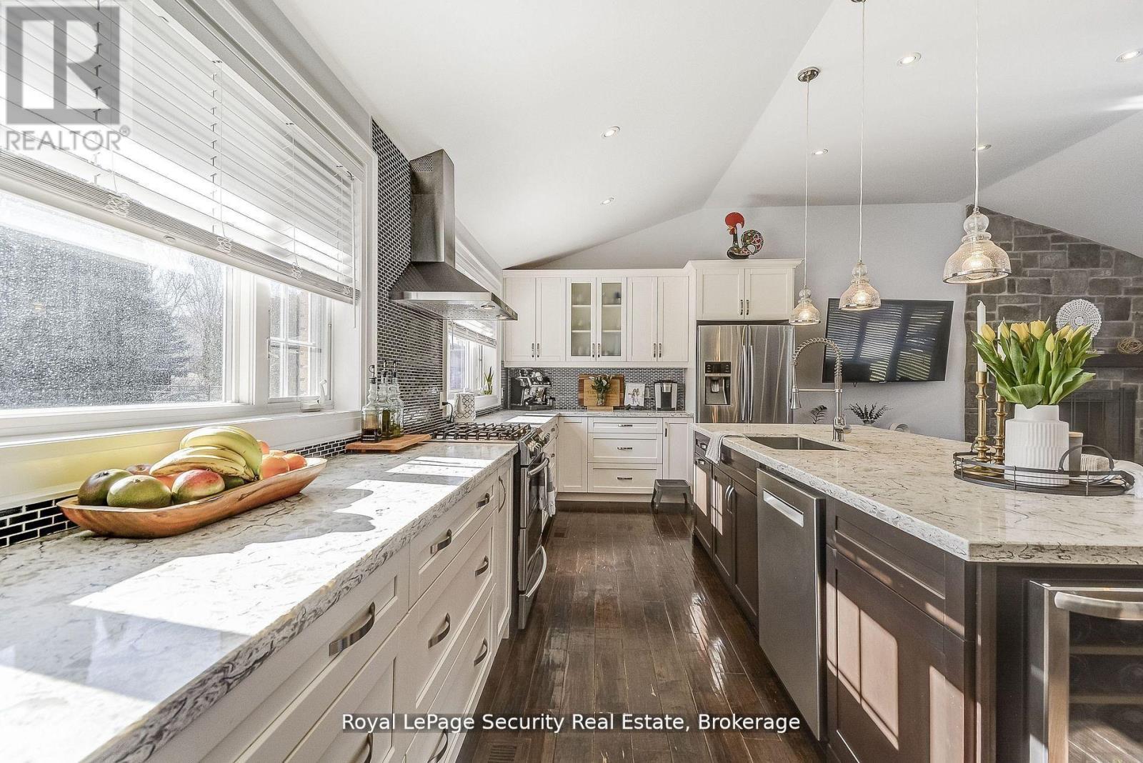 Exceptional detached home with a flexible multi-level layout ideal for today's modern families. Meticulously maintained and move-in ready, this home offers 4 bedrooms and 4 bathrooms, including a fully self-contained in-law/nanny suite with excellent income potential. The main home features 3 bedrooms and 3 bathrooms. The second-level in-law/nanny suite includes a private entrance, walk-out deck, full kitchen, living area, bedroom, bathroom, and in-suite laundry, with direct access from the main house as well as a separate exterior entrance-perfect for multi-generational living or rental use. Enjoy open-concept living with a chef-inspired kitchen featuring quartz countertops, ample cabinetry, and a large island with seating for six. Hardwood floors and a cozy wood-burning fireplace add warmth and style throughout. The fully finished basement offers a spacious recreation room and a spa-like bathroom with heated floors. Step into the enclosed walk-out porch, ideal for year-round BBQs and entertaining, overlooking a peaceful backyard retreat complete with a fire pit. An oversized 11' x 26' workshop provide sexcellent space for hobbies or storage. Unbeatable location across from The Club at North Halton golf course and minutes to schools, shopping, and major highways. A rare opportunity offering space, flexibility, and income potential-this is one you don't want to miss. (id:4555)