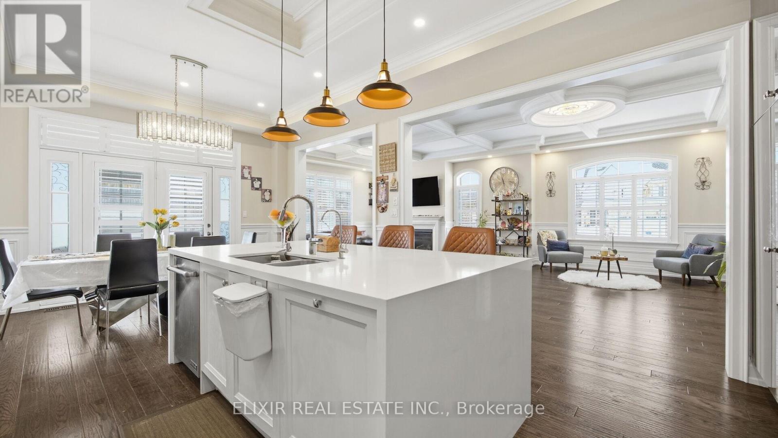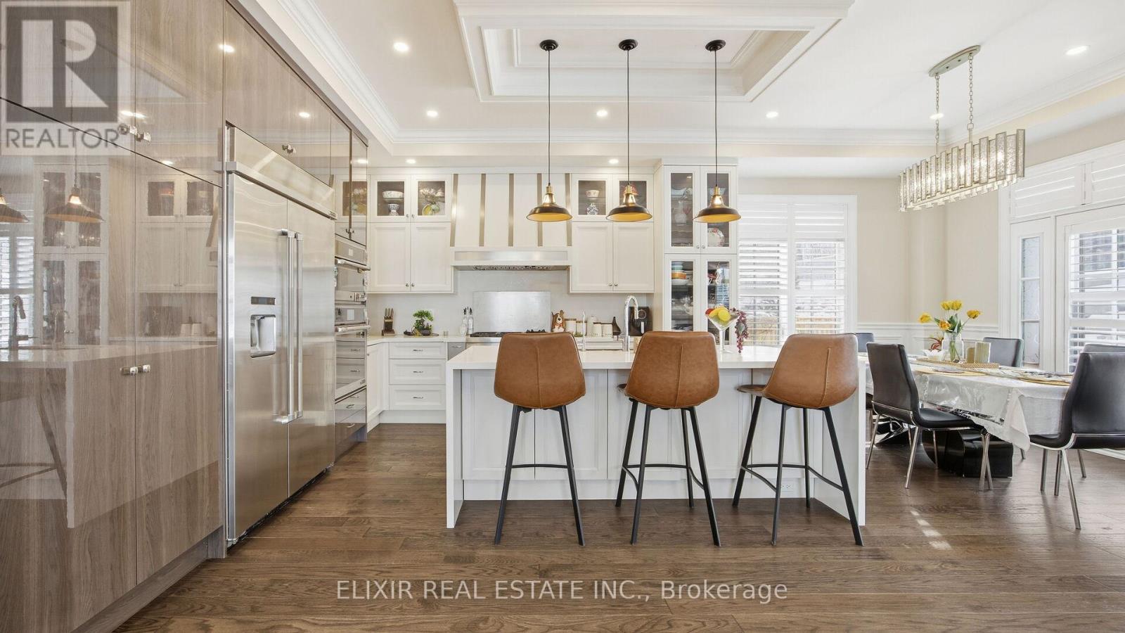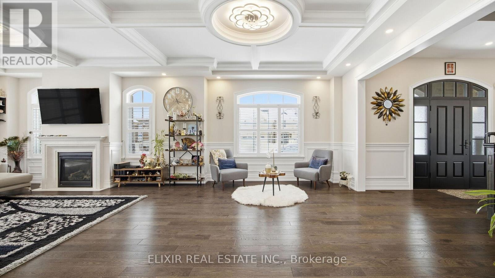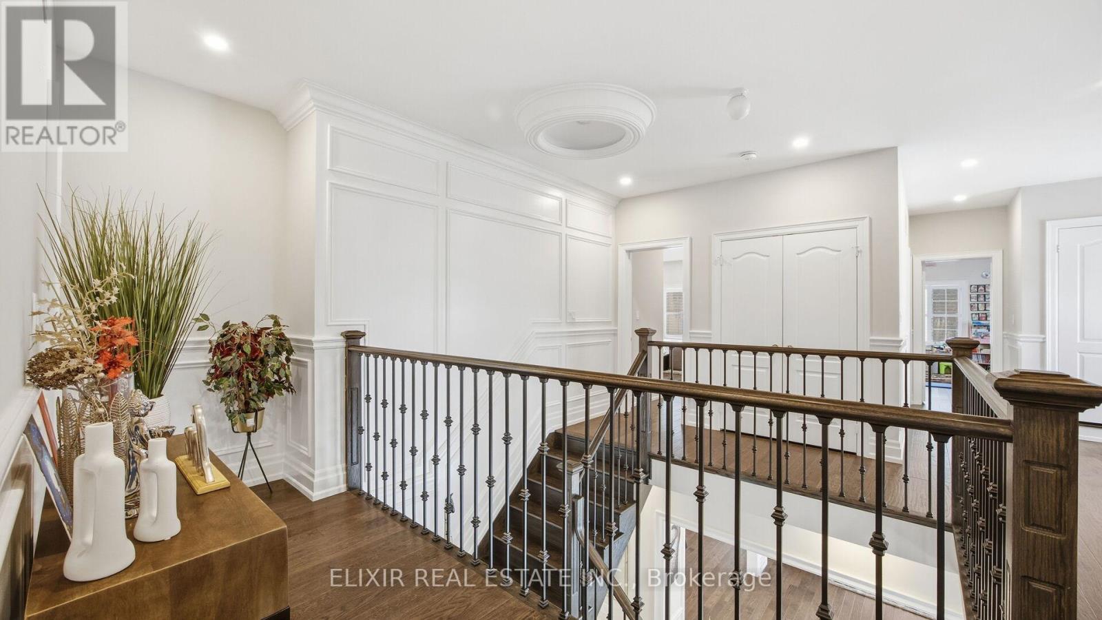 Welcome to a statement of refined luxury in the prestigious Riverwood community of Halton Hills. Set on a rare, premium corner lot, this exceptional 2018-built detached residence offers 4+1 bedrooms and 5 bathrooms, thoughtfully designed for elevated living with uncompromising attention to detail. The home's stone and brick façade, paired with professionally installed interlocking in the front and backyard, delivers timeless curb appeal with effortless maintenance. Step inside to an atmosphere of sophistication highlighted by 10-ft custom coffered ceilings, rich premium hardwood flooring, designer wainscoting, and pot lights throughout. The expansive, sun-filled layout features separate living and family rooms with a defined dining space, creating the perfect balance between elegant entertaining and everyday comfort. The heart of the home is a chef-inspired gourmet kitchen, showcasing high-end JennAir stainless steel appliances, custom Cameo cabinetry, Caesarstone countertops, and a striking oversized island-designed for both culinary excellence and upscale hosting. A custom-stained staircase seamlessly matches the hand-scraped engineered hardwood flooring, leading to the upper level where luxury continues. Upstairs, discover four generously sized bedrooms, including a primary suite retreat with soaring ceilings, his-and-her closets, and a spa-like 5-piece ensuite. Each additional bedroom features a private or semi-private bathroom, offering hotel-style comfort and privacy for family and guests. The fully finished basement extends the home's luxurious living space with an additional bedroom, a large recreation area, and an open-concept exercise zone-ideal for guests or a home wellness retreat. Located near parks, trails, top-rated schools, and community centers. This is a rare luxury lifestyle opportunity in Georgetown's most sought-after neighborhood. Once you experience it, there's no comparison (id:4555)