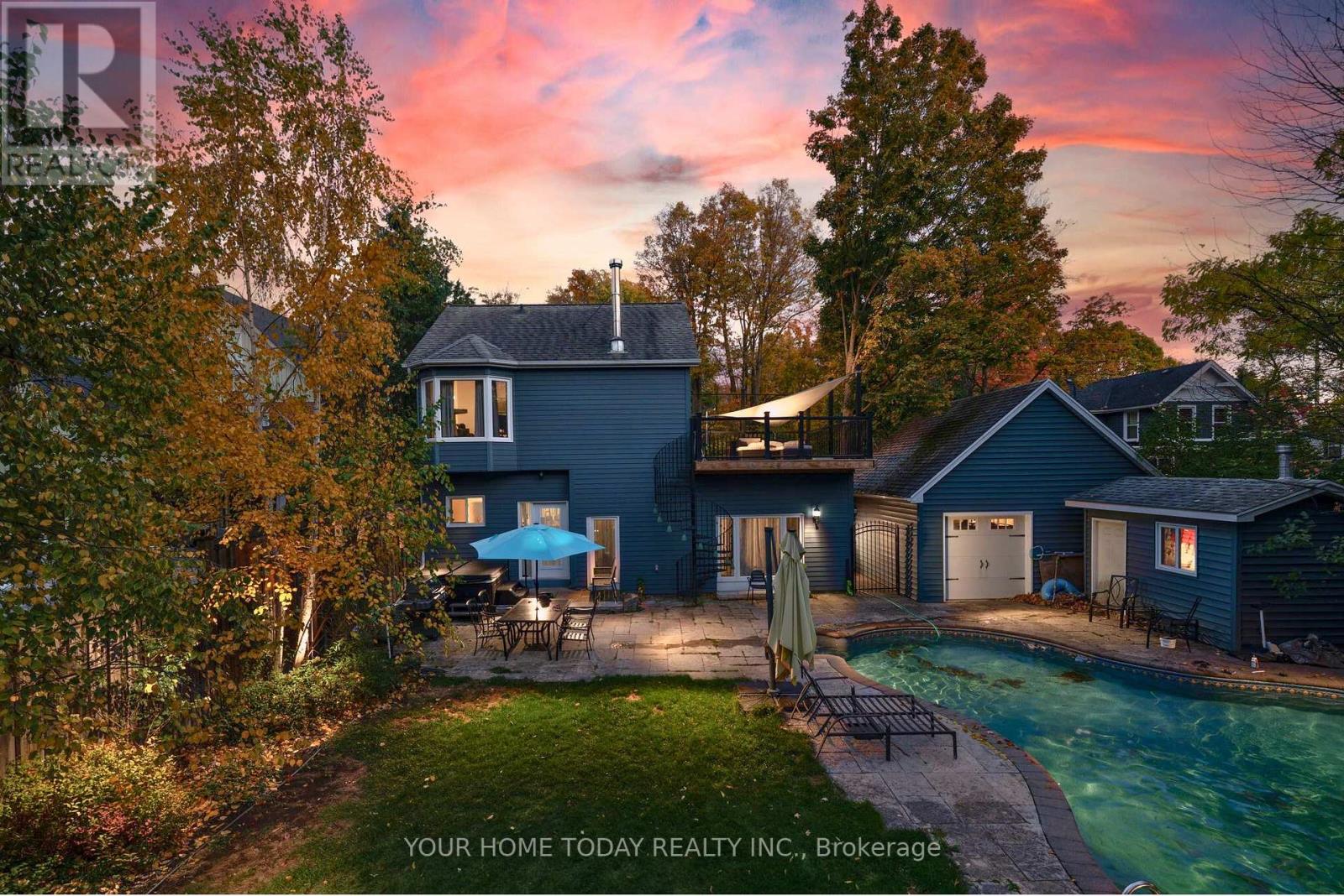 Set on a huge, mature lot backing onto a picturesque ravine, this exceptional property offers impressive outdoor living complete with a heated, saltwater in-ground pool, hot tub and beautifully landscaped grounds. A premium Hardie board exterior (fibre cement product) - prized for its durability and timeless appeal and large covered front porch set the stage for this charming, heritage-designated, 4-bedroom, 3-bathroom century home, thoughtfully updated for today's lifestyle. An eye-catching exterior circular wrought-iron staircase leads to a private upper balcony with direct access to the primary suite - an architectural feature that adds both character and charm. Inside, the stunning kitchen features a large island, quartz countertops, stainless steel appliances, and multiple walkouts to separate decks. Formal living and dining rooms showcase crown molding, built-in cabinetry and pocket doors while the cozy family room offers a gas fireplace flanked by custom built-in cabinetry. An office nook and powder room complete this level. The upper level offers four bedrooms, including the primary retreat with walk-in closet, 3-piece ensuite and walkout to balcony. A main 4-piece bathroom serves the remaining bedrooms, all featuring an abundance of character. Second-floor laundry adds everyday convenience. Ideally located just steps to the GO station and within a short walk to schools, downtown shops, library, cultural centre, hospital, and more, with easy highway access for commuters. (id:4555)