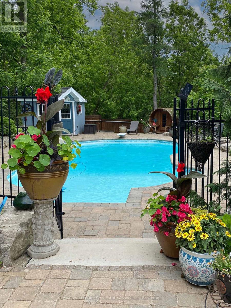 Tucked away on a quiet dead-end cul-de-sac court, this stunning raised bungalow combines elegance, comfort, and versatility with rare country-style privacy just steps from city living. Perfect for families, entertainers, or those seeking multi-generational living, this home offers an exceptional lifestyle. Inside, you'll find a spacious layout featuring 4 bedrooms above grade, including a primary suite with his-and-her closets and convenient semi-ensuite access. The home offers a luxurious 5-piece semi-ensuite bath plus a powder room with laundry, balancing style with everyday practicality. The heart of the home is the expansive gourmet kitchen with skylight, designed with both function and entertaining in mind. The adjoining dining area flows seamlessly to the backyard, creating a natural extension of your living space. Gather in the inviting family room with a cozy fireplace, or enjoy cinematic nights with the built-in drop-down screen. The lower level impresses with a second full kitchen, 3-piecebath, and a private dwelling unit with its own entrance-ideal for extended family, guests, or rental income. This self-contained suite features 1 bedroom, 1 bath, a kitchen, laundry, and storage. Car enthusiasts and professionals will love the double tandem heated garage, partially converted into a stylish hair salon while still offering generous storage. Additional parking is effortless with an attached carport and a driveway for 10+ vehicles. A large barn at the rear provides secure space for your collector car or extra storage. The backyard is a true resort-style retreat. Enjoy the pool, sauna, and cabana built by Jameson Pools in 2010, complemented by an outdoor fire pit-perfect for summer gatherings or quiet evenings under the stars. The expansive grounds invite both entertaining and private relaxation in equal measure. This property truly offers it all: luxury, functionality, and endless possibilities-all in an unparalleled setting. (id:4555)
