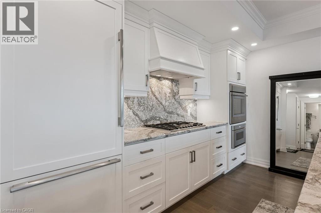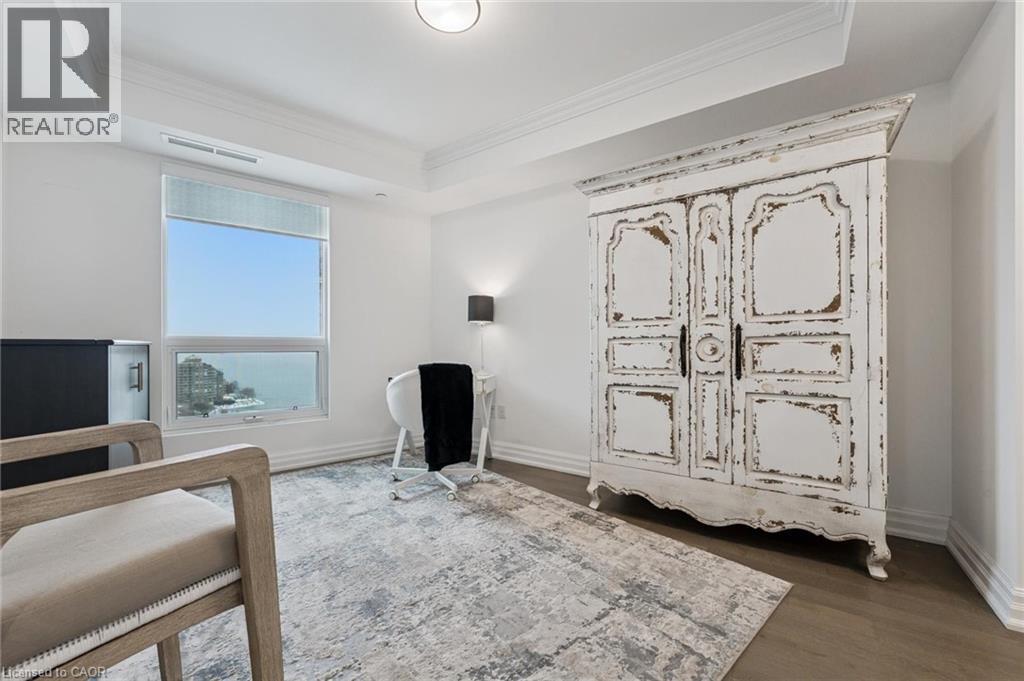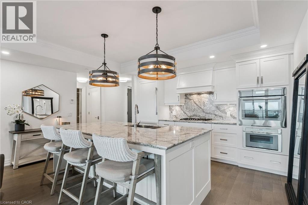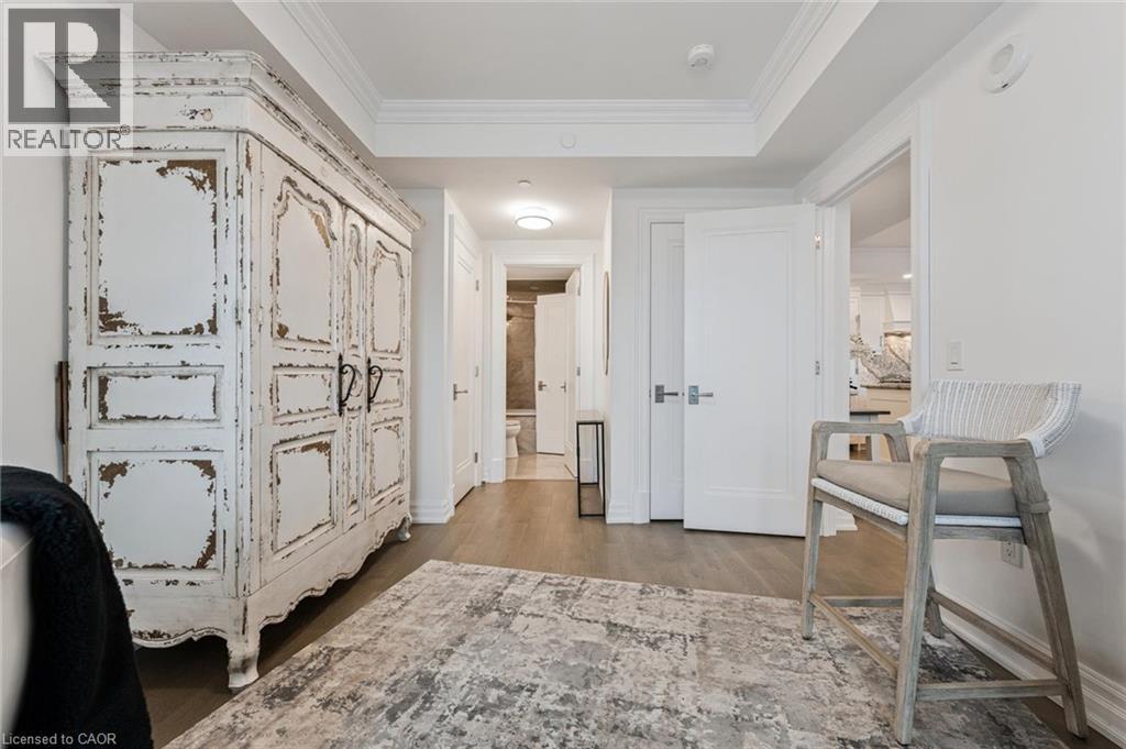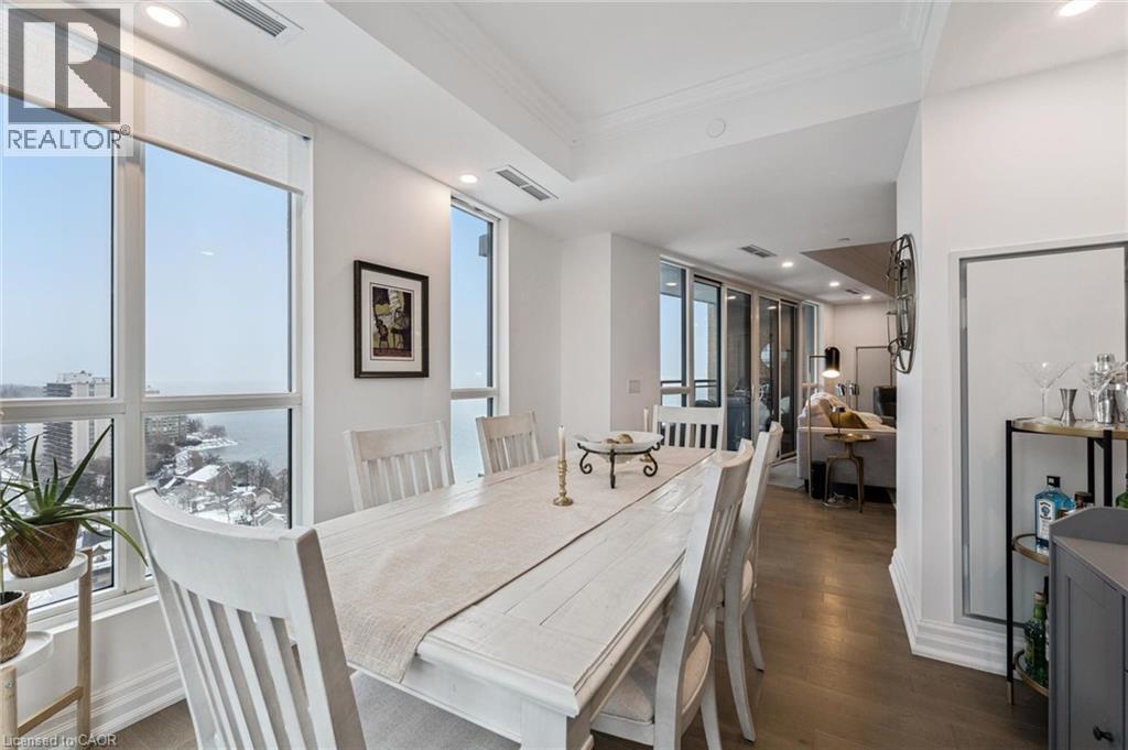 Experience refined lakeside living at Bridgewater Private Residences. This 1,275 sq. ft. corner suite offers a great layout with sweeping views of Lake Ontario and the Burlington–Toronto skyline. The floor plan includes two spacious bedrooms, each with its own ensuite bathroom and heated floors, as well as a separate dining room that can also serve as an office/den or additional bedroom, study, or fitness space. The upgraded kitchen includes Thermador appliances, a five-burner gas cooktop, upgraded large island with additional lower cabinet storage, and a layout designed to capture the lake views. The living and dining areas offer generous space for multiple furniture configurations, with an upgraded large 36” gas fireplace, perfect for warm winter evenings and direct access to the balcony equipped with a gas line for a barbecue and upgraded maintenance free, custom balcony decking from Condo Kandy. Additional features include automatic Hunter Douglas blinds, in-suite laundry, large closets, and floor-to-ceiling windows. Residents enjoy a collection of on-site amenities, including an indoor pool, two fitness rooms, a rooftop courtyard, games room, party room, 24-hour concierge, bike storage, and valet visitor parking. The suite also includes two parking spaces, with the option for EV charging installation. Bridgewater Private Residences offers a sought-after waterfront lifestyle in downtown Burlington with convenient access to shops, restaurants, parks, and the lakefront. (id:4555)