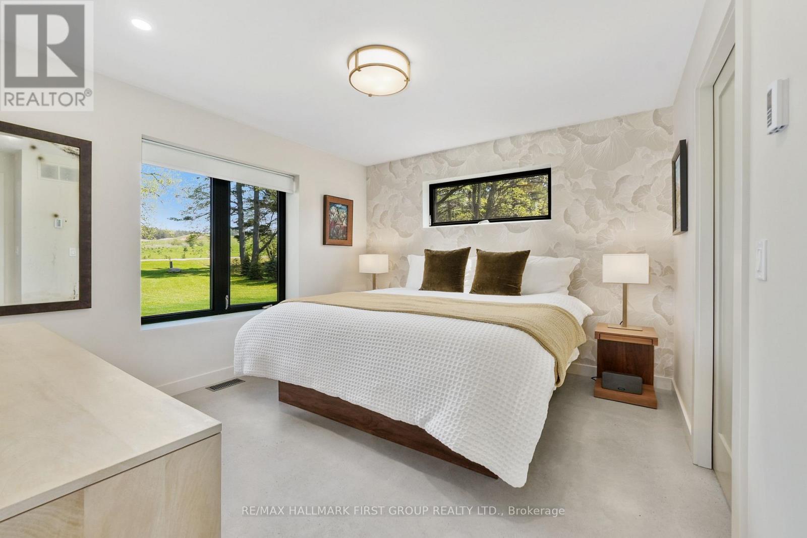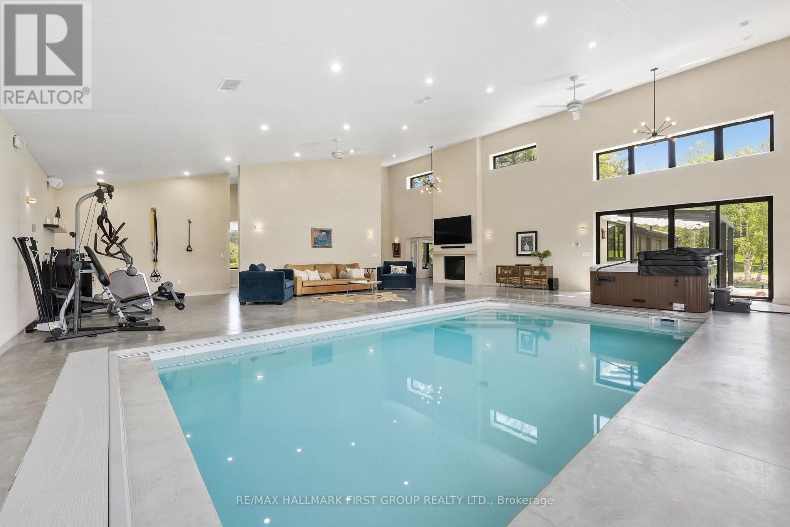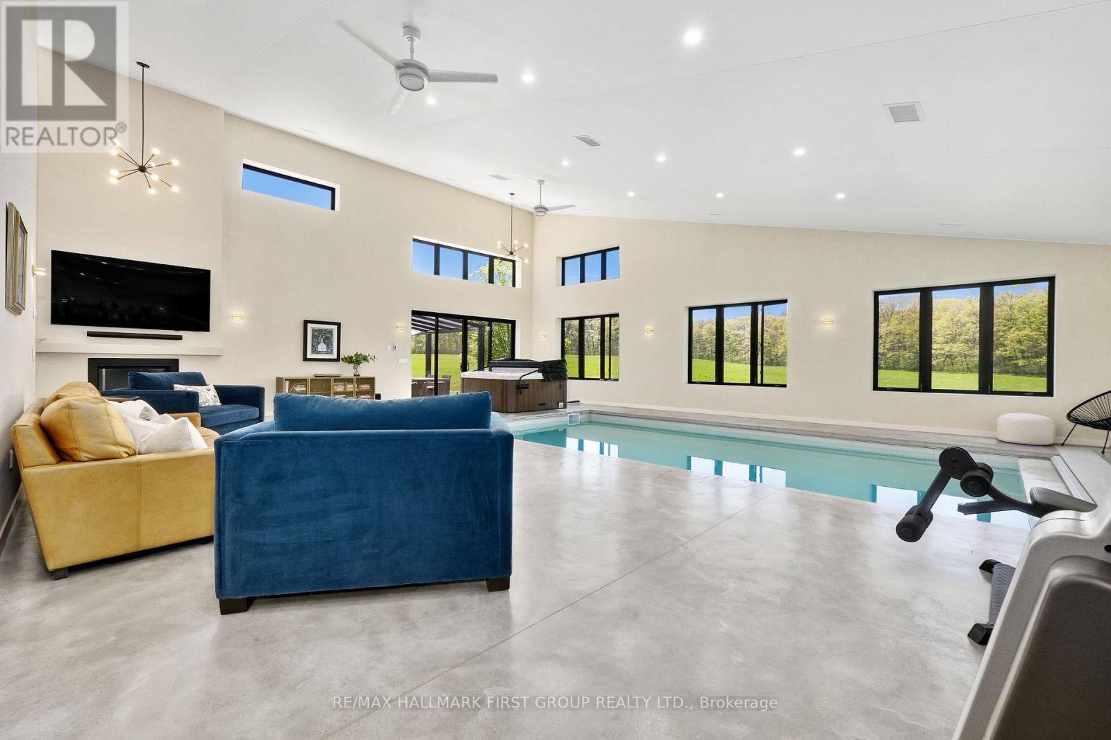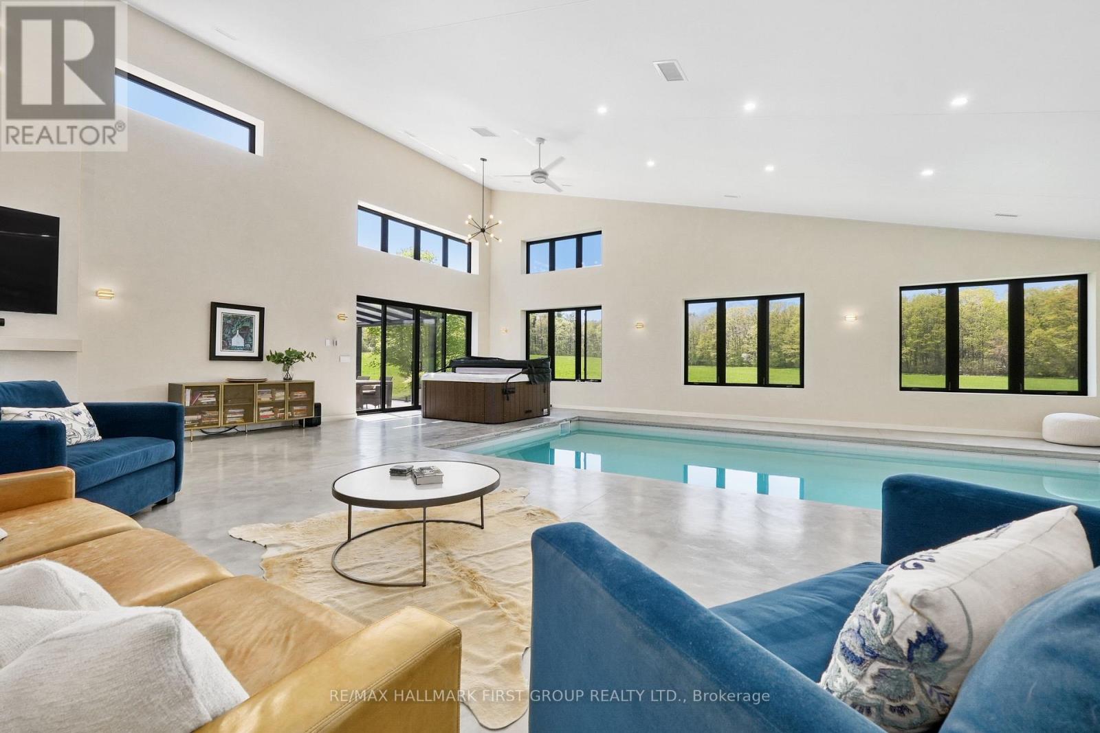 Set on a sprawling 23-acre estate, this striking modern residence exemplifies the perfect balance between contemporary elegance and rural serenity. Every detail has been thoughtfully curated, blending sleek architectural design with high-performance construction, including efficient ICF walls and radiant heated concrete flooring. Step into a grand, open-concept living area defined by cathedral ceilings and a dramatic wall of windows. A double-sided Napoleon propane fireplace anchors the space, connecting the living room to a sophisticated dining area adorned with modern lighting and walkout to the second-level deck ideal for outdoor entertaining. Sunlight pours into the kitchen through oversized windows and skylights, offering breathtaking views of the rolling countryside beyond and showcasing top-tier Jenn-Air appliances, striking Dekton countertops and a waterfall island with a breakfast bar. Resort-style living awaits in the private attached oasis. A 14x24 heated indoor saltwater pool, soaring 20-foot ceilings, expansive windows, a hot tub, and space for a lounge or home gym create an oasis-like experience, ideal for year-round relaxation and entertaining. The primary suite is a tranquil retreat featuring a walk-in closet and spa-inspired ensuite with dual vanity, freestanding soaker tub, and glass shower enclosure with steam shower. An additional bedroom and two bathrooms round out the level. The finished lower level adds flexible living space, including a sprawling bedroom suite with sitting area, semi-ensuite bath, and walkout to a covered patio. A massive recreation room with a walk-in closet offers potential for a future fourth bedroom. Enjoy a lower covered patio area, fenced yard, and firepit area, perfect for summer nights under the stars. Additional highlights include a radiant heated 4-car garage and a 16x24 barn for versatile use. This one-of-a-kind property is the pinnacle of modern rural luxury. Just under 15 minutes to Cobourg and Highway 401. (id:4555)