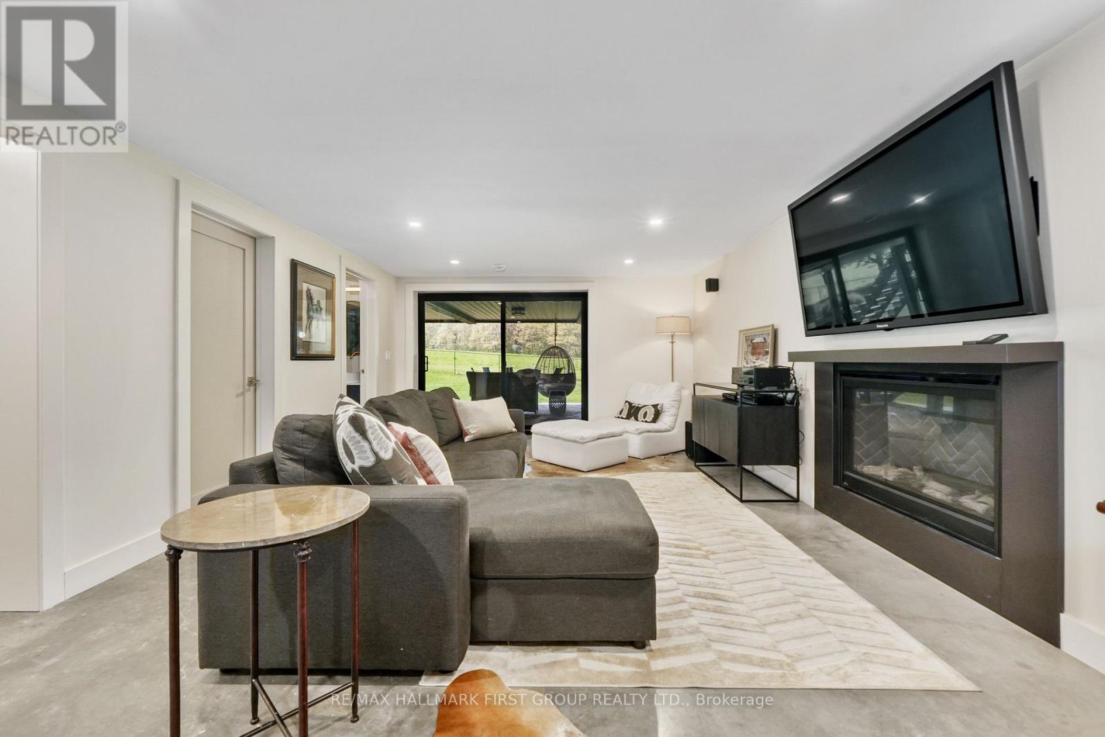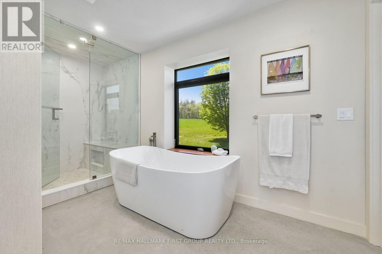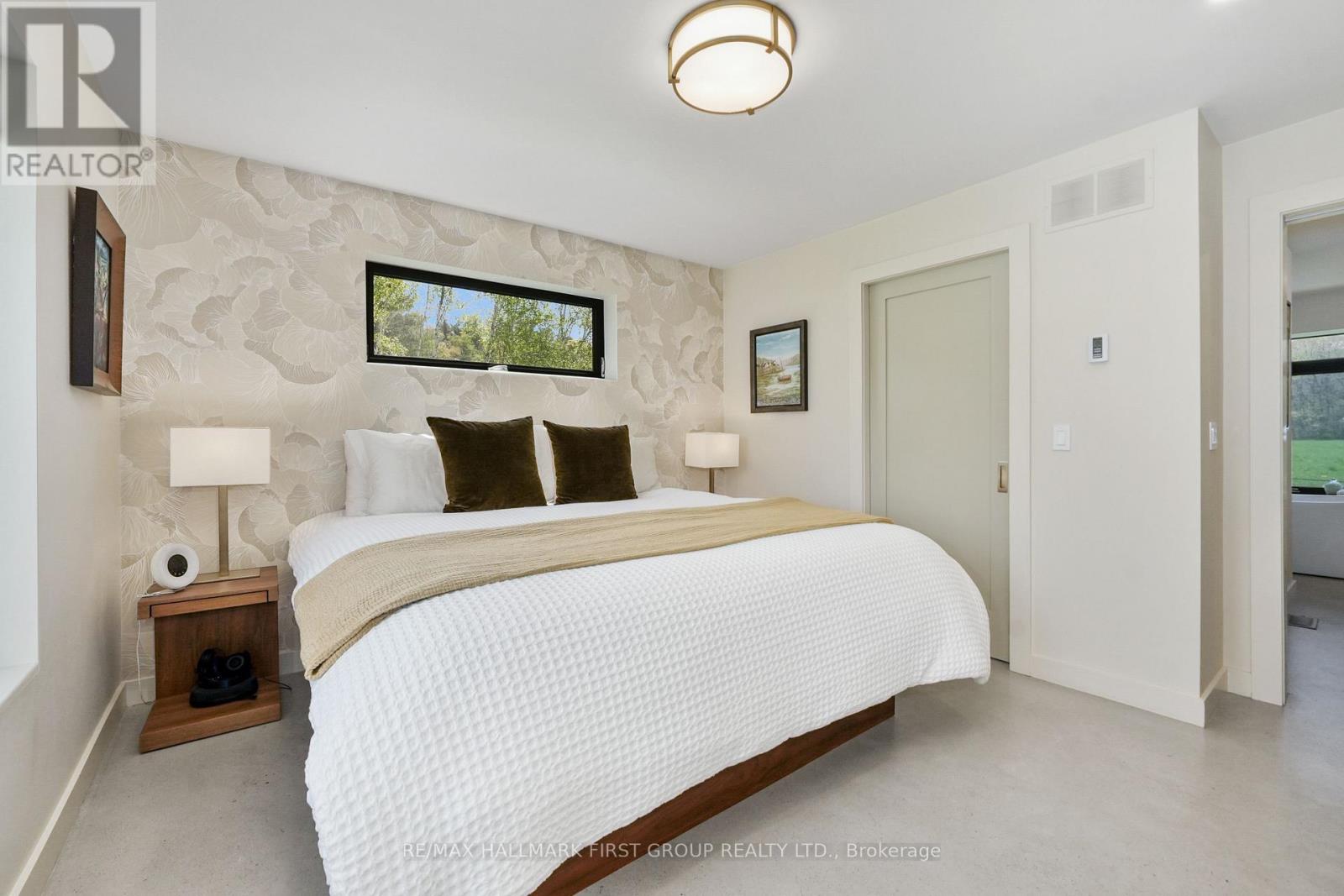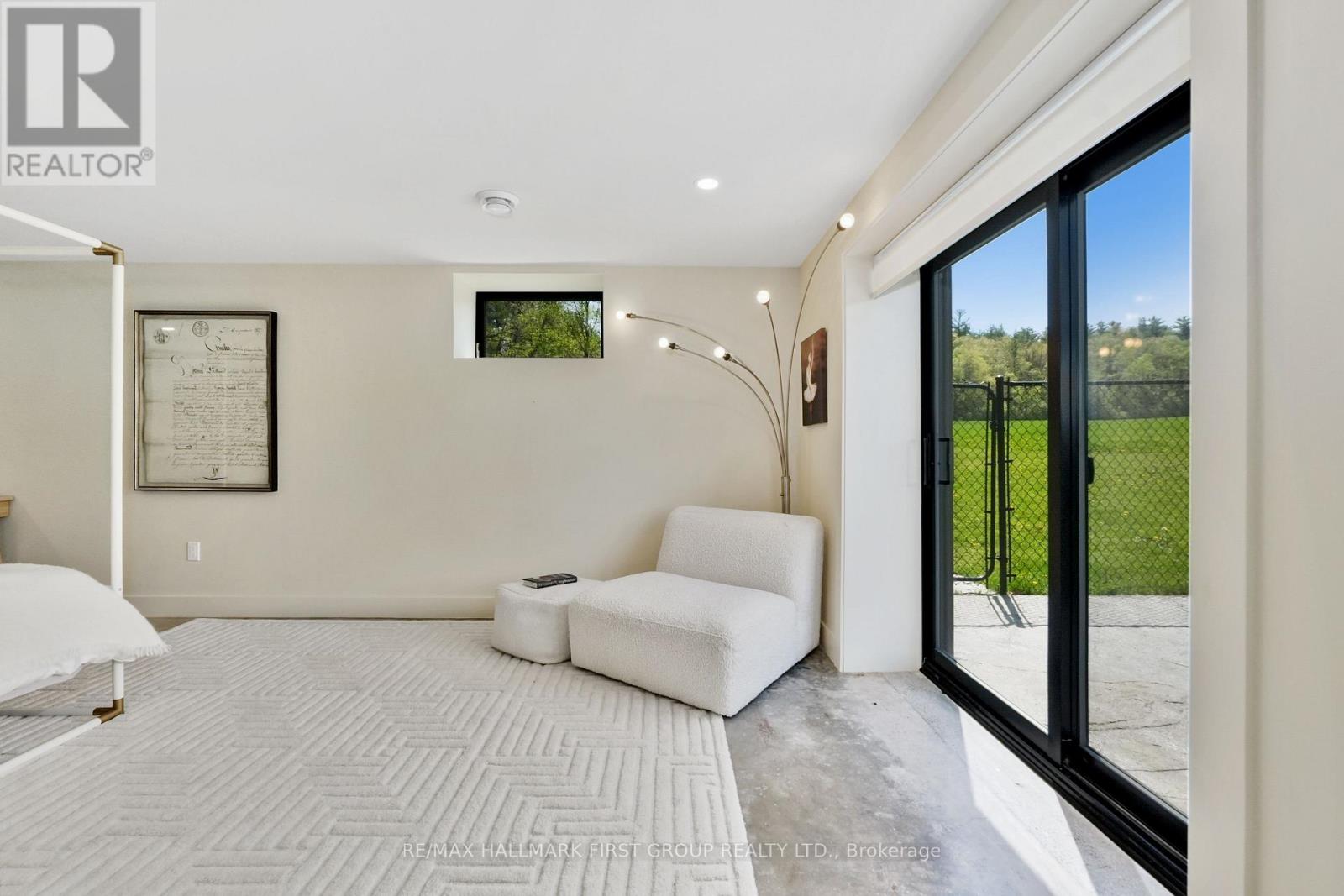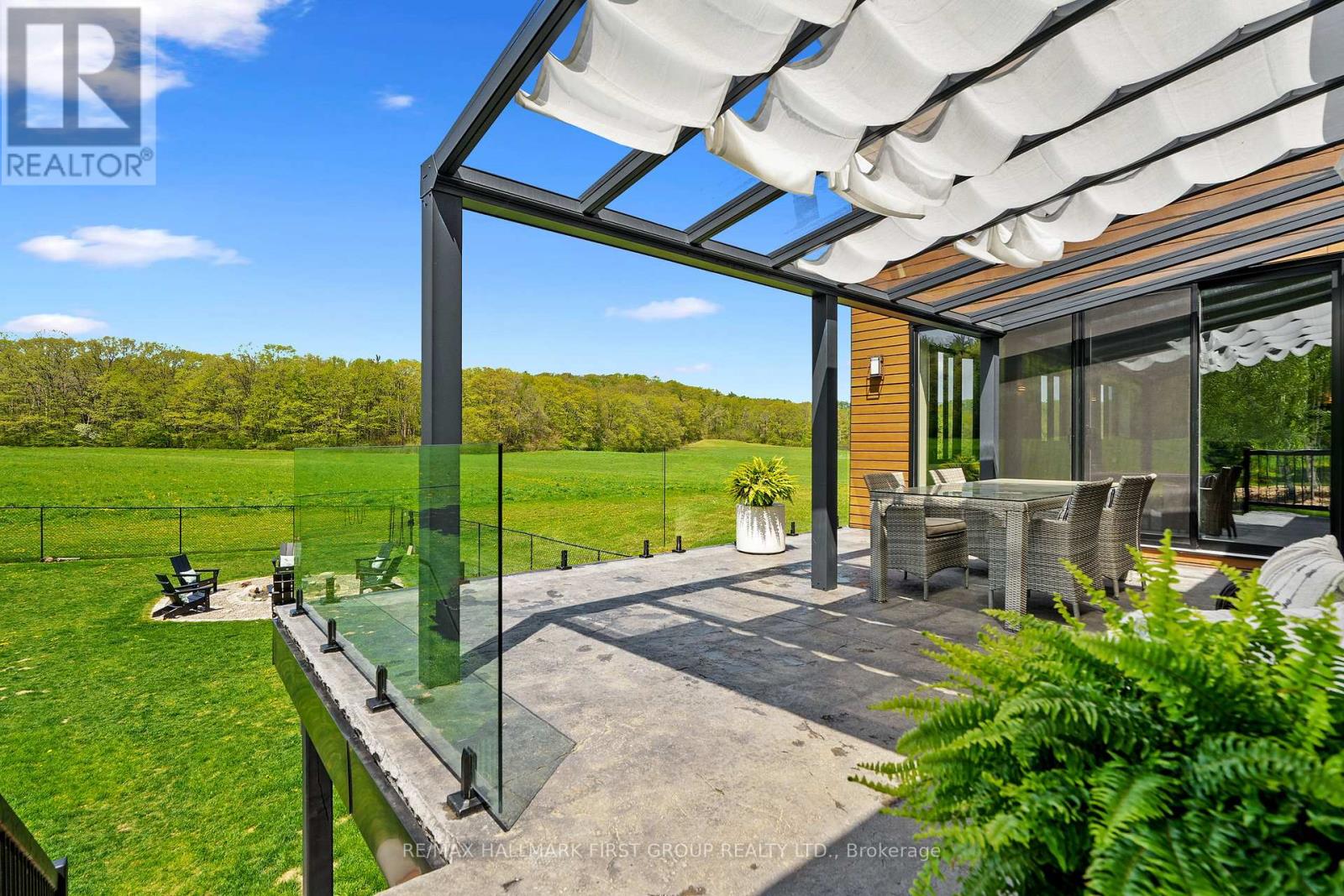 Set on a sprawling 23-acre estate, this striking modern residence exemplifies the perfect balance between contemporary elegance and rural serenity. Every detail has been thoughtfully curated, blending sleek architectural design with high-performance construction, including efficient ICF walls and radiant heated concrete flooring. Step into a grand, open-concept living area defined by cathedral ceilings and a dramatic wall of windows. A double-sided Napoleon propane fireplace anchors the space, connecting the living room to a sophisticated dining area adorned with modern lighting and walkout to the second-level deck ideal for outdoor entertaining. Sunlight pours into the kitchen through oversized windows and skylights, offering breathtaking views of the rolling countryside beyond and showcasing top-tier Jenn-Air appliances, striking Dekton countertops and a waterfall island with a breakfast bar. Resort-style living awaits in the private attached oasis. A 14x24 heated indoor saltwater pool, soaring 20-foot ceilings, expansive windows, a hot tub, and space for a lounge or home gym create an oasis-like experience, ideal for year-round relaxation and entertaining. The primary suite is a tranquil retreat featuring a walk-in closet and spa-inspired ensuite with dual vanity, freestanding soaker tub, and glass shower enclosure with steam shower. An additional bedroom and two bathrooms round out the level. The finished lower level adds flexible living space, including a sprawling bedroom suite with sitting area, semi-ensuite bath, and walkout to a covered patio. A massive recreation room with a walk-in closet offers potential for a future fourth bedroom. Enjoy a lower covered patio area, fenced yard, and firepit area, perfect for summer nights under the stars. Additional highlights include a radiant heated 4-car garage and a 16x24 barn for versatile use. This one-of-a-kind property is the pinnacle of modern rural luxury. Just under 15 minutes to Cobourg and Highway 401. (id:4555)