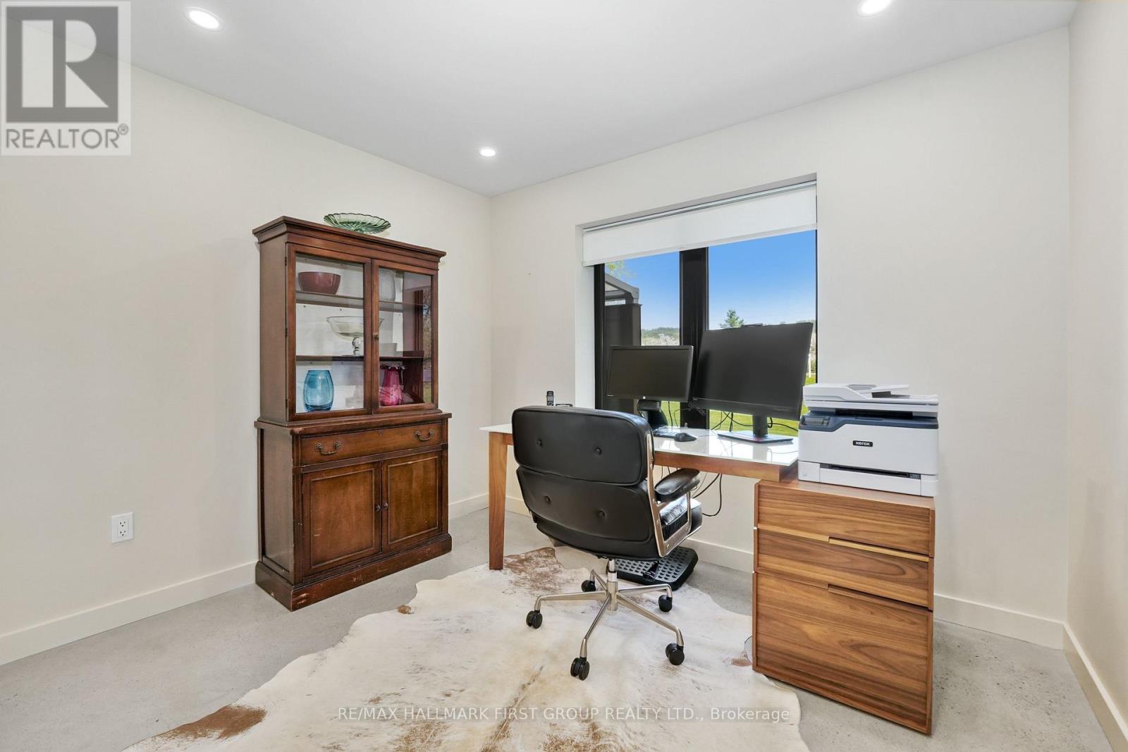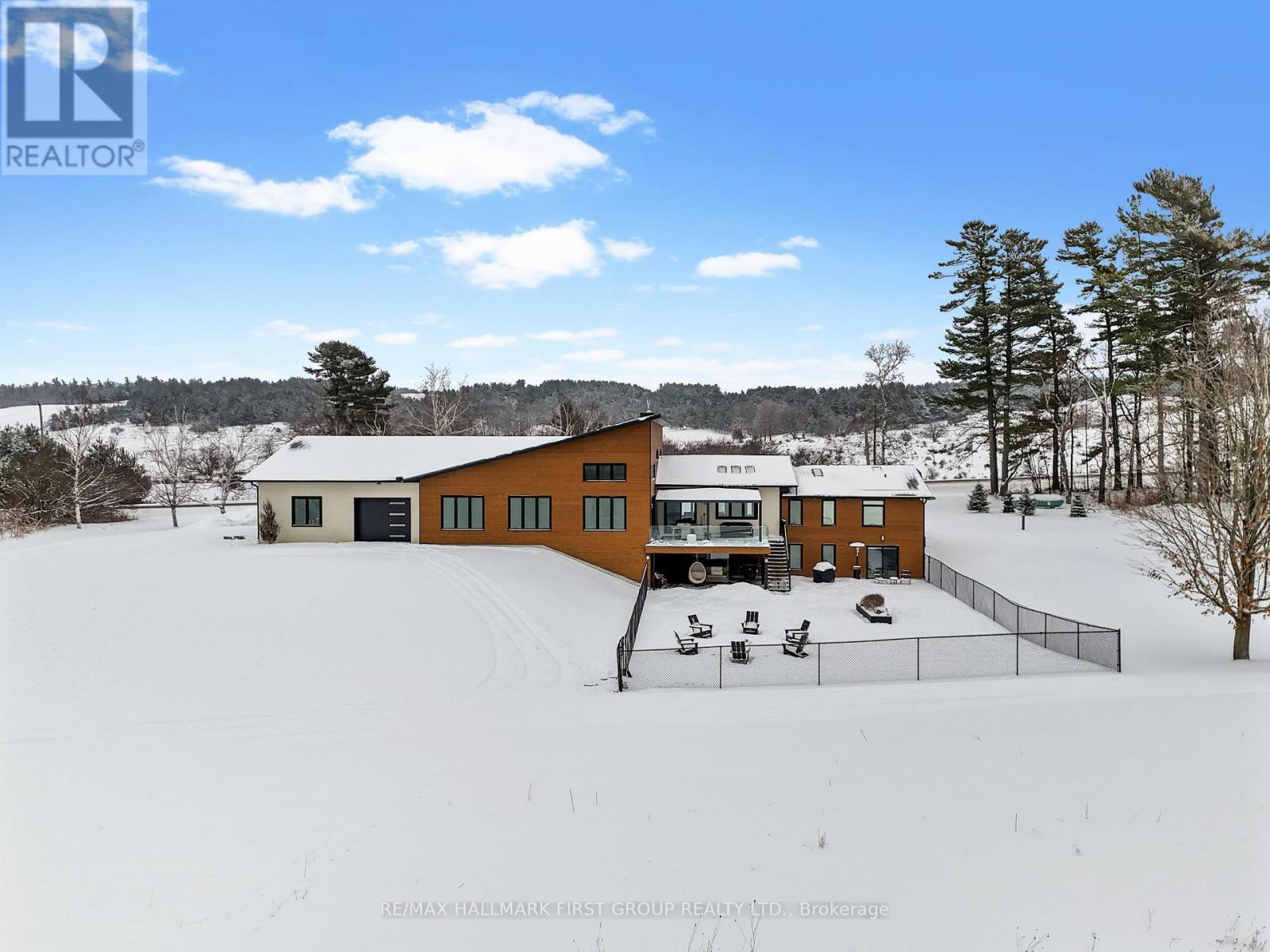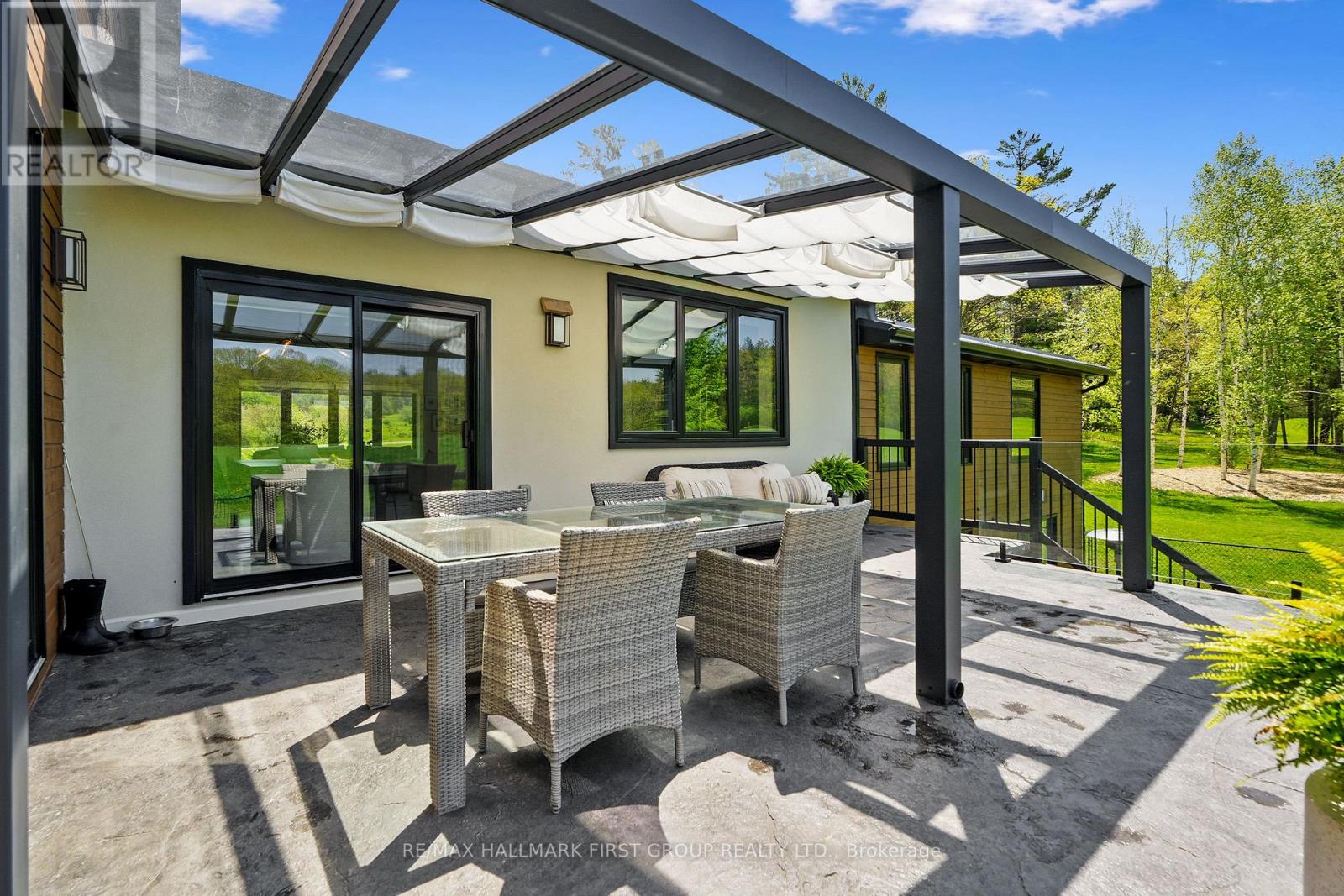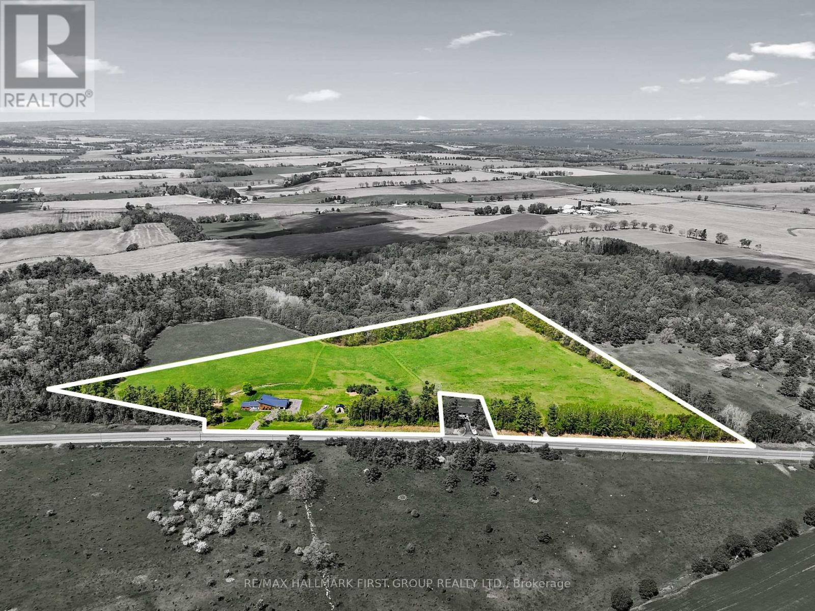 Set on a sprawling 23-acre estate, this striking modern residence exemplifies the perfect balance between contemporary elegance and rural serenity. Every detail has been thoughtfully curated, blending sleek architectural design with high-performance construction, including efficient ICF walls and radiant heated concrete flooring. Step into a grand, open-concept living area defined by cathedral ceilings and a dramatic wall of windows. A double-sided Napoleon propane fireplace anchors the space, connecting the living room to a sophisticated dining area adorned with modern lighting and walkout to the second-level deck ideal for outdoor entertaining. Sunlight pours into the kitchen through oversized windows and skylights, offering breathtaking views of the rolling countryside beyond and showcasing top-tier Jenn-Air appliances, striking Dekton countertops and a waterfall island with a breakfast bar. Resort-style living awaits in the private attached oasis. A 14x24 heated indoor saltwater pool, soaring 20-foot ceilings, expansive windows, a hot tub, and space for a lounge or home gym create an oasis-like experience, ideal for year-round relaxation and entertaining. The primary suite is a tranquil retreat featuring a walk-in closet and spa-inspired ensuite with dual vanity, freestanding soaker tub, and glass shower enclosure with steam shower. An additional bedroom and two bathrooms round out the level. The finished lower level adds flexible living space, including a sprawling bedroom suite with sitting area, semi-ensuite bath, and walkout to a covered patio. A massive recreation room with a walk-in closet offers potential for a future fourth bedroom. Enjoy a lower covered patio area, fenced yard, and firepit area, perfect for summer nights under the stars. Additional highlights include a radiant heated 4-car garage and a 16x24 barn for versatile use. This one-of-a-kind property is the pinnacle of modern rural luxury. Just under 15 minutes to Cobourg and Highway 401. (id:4555)