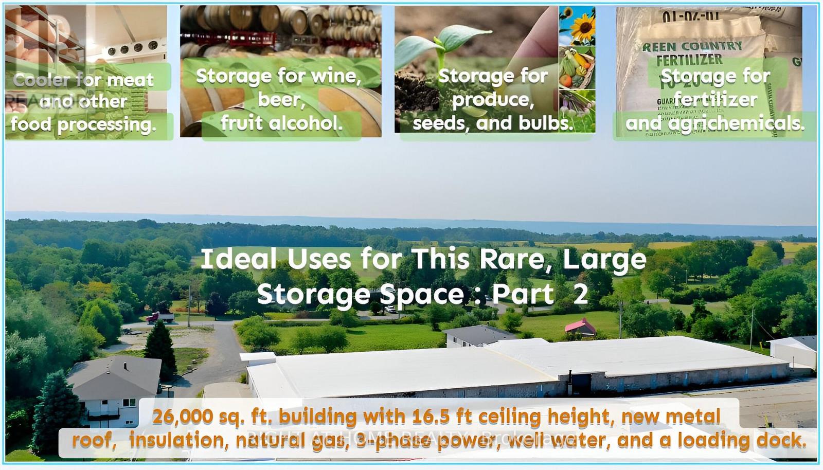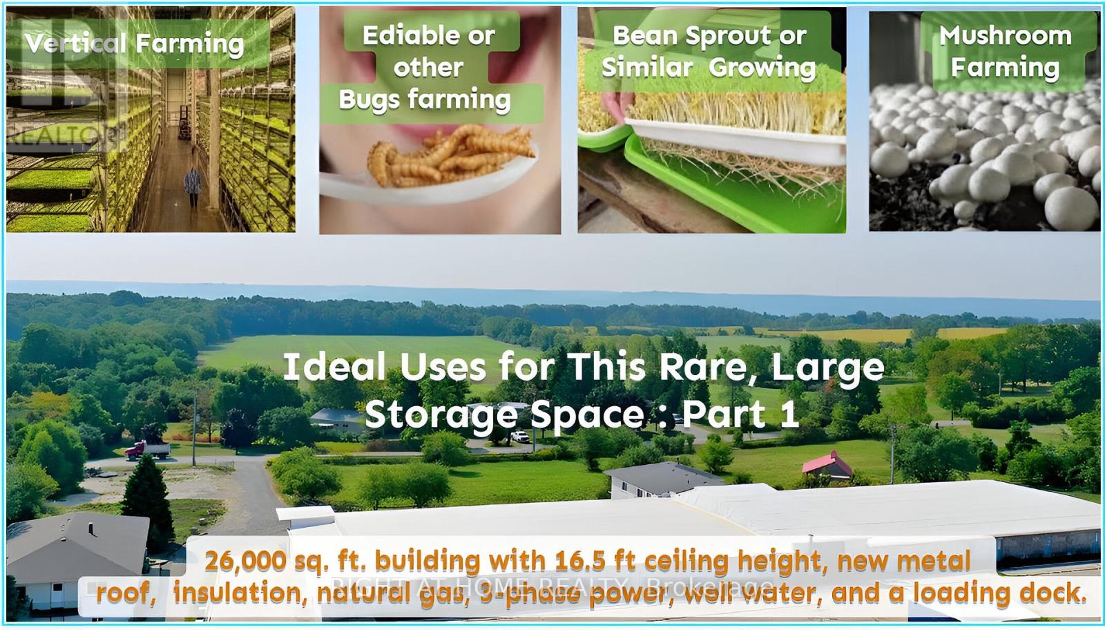 Located in the highly sought-after Flamborough area, this property provides convenient access to Highway 5, Highway 6, the 403, the City of Hamilton, and the Greater Toronto Area, making it an ideal location for a variety of business operations. The barn boasts 26,000 square feet of space with a generous 16.5-foot ceiling height. It features a brand-new metal roof, full insulation, and is equipped with 3-phase power, natural gas, well water, and a durable concrete floor. Additionally, it includes a loading dock for easy access and logistics. The interior of the barn is designed with removable walls, offering flexibility to adapt the space for a range of purposes, including storage, vertical farming, mushroom cultivation, bean sprout production, edible insect farming etc. Additional Details: 1. The barns existing structure allows tenants to modify or customize the interior based on their specific needs, at their own expense. 2. The lease is priced at $5.50 per square foot, per year. Tenants will be responsible for all utility costs. 3. There are several sections available for rent: Part 1, Part 3, and House 269 with a workshop. Its possible to rent either the entire property or just a portion of it. 4. Approximately 6-7 acres of workable land are available for lease at the rear of the barn. If desired, the land can be rented at a negotiable rate. (id:4555)