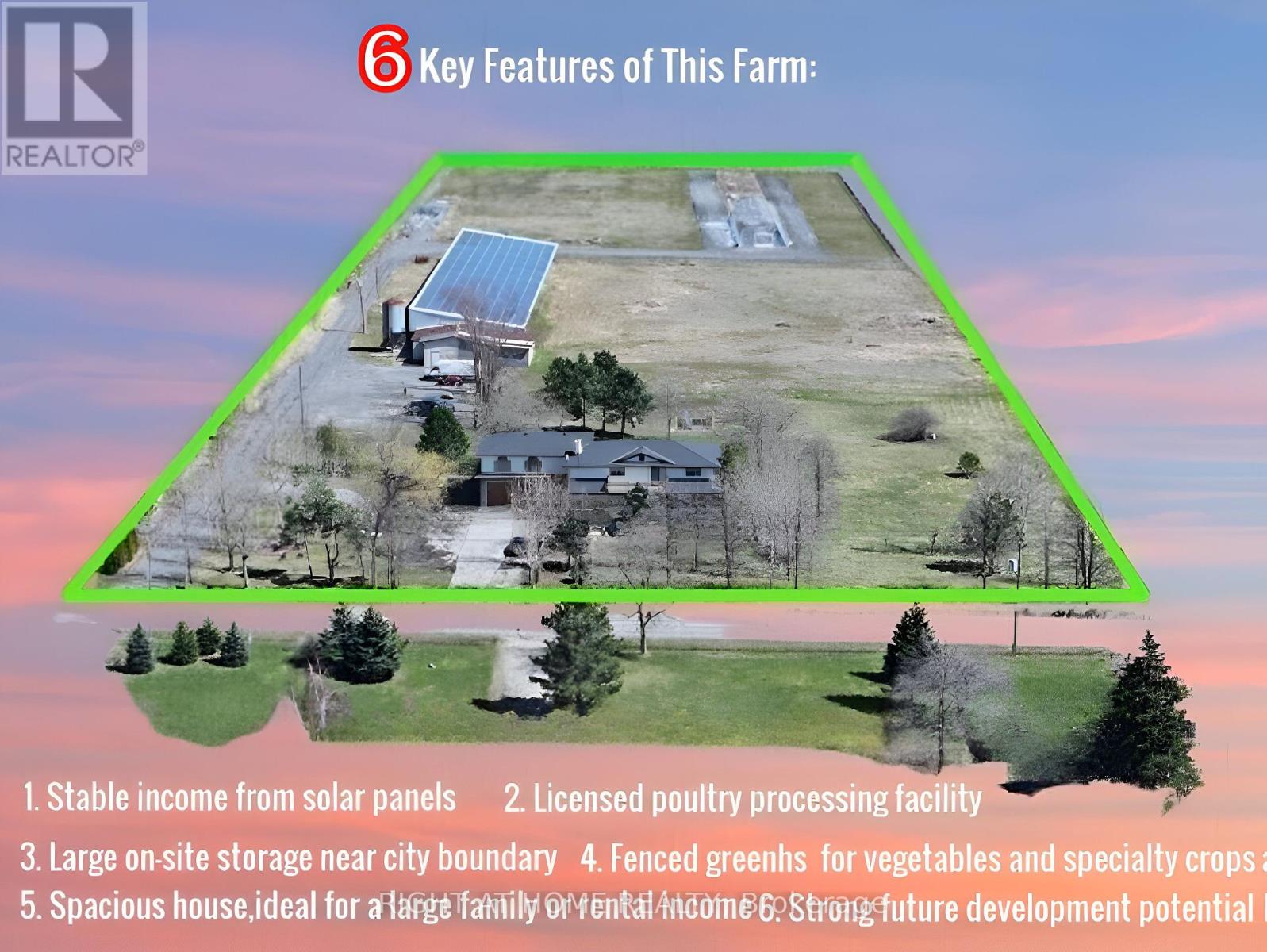 Rare 7-Acre Income-Generating Farm Future Urban Edge of Hamilton! Incredible opportunity to own a revenue-producing farm just steps from Hamilton urban expansion zone with the possibility of city sewer and water services being installed soon ! Perfect for investors, entrepreneurs, or anyone seeking a self-sustaining property with major upside. Land & Buildings: 7 Acres | 3,700 ft 4-Bedroom Home | 9,250 ft Barn | 150kW Solar Roof Project Dual driveways and ample parking . Multiple Income Streams: A. Greenhouse Operation: 7 greenhouse permits (1 built, 2 foundations ready), fenced zone with year-round asphalt driveways, all structural components included . B. Chicken Processing Facility: 2,000 ft licensed processing area, TRQ-eligible under CUSMA/WTO/TPP, ~$100,000/year income potential, C. Solar Energy: FIT1 project generating ~$125,000/year at $0.713/kWh, contract secured until Oct 2035 10.5 years of guaranteed income Additional D. Rental Income: 7,000 ft of indoor storage space inside the barn perfect for leasing to farm businesses or storage needs. The Home: Spacious 4 Bedrooms | 2.5 Baths | 2 Kitchens (ideal for multi-gen living or farm staff), antique marble fireplace, hardwood/tile floors, bonus room above garage, new roof (2024) . Water & Utilities: City water delivery (cistern), septic system, and two 50-ft deep wells (house irrigation + barn automation). Future Growth: Located directly along Hamilton official expansion boundary ready for major appreciation as urban development moves closer. Bonus: The senior and experienced owner is willing to fully train the new buyer in all aspects of the business and property management hoping to pass on his legacy and see this thriving operation grow even stronger. Ideal for: Investors, commercial farmers, poultry processors, greenhouse operators, and lifestyle buyers seeking a rare blend of income and long-term growth. (id:4555)