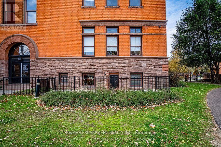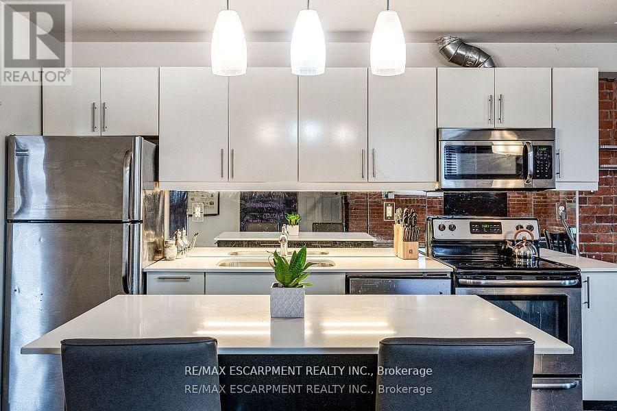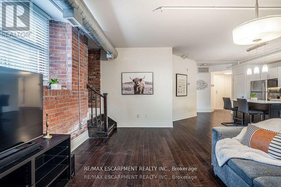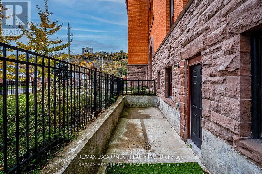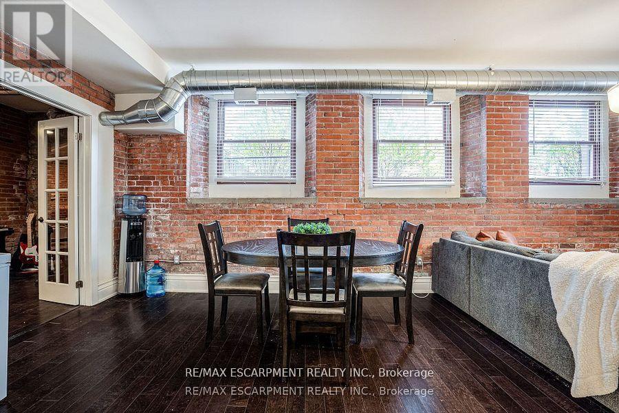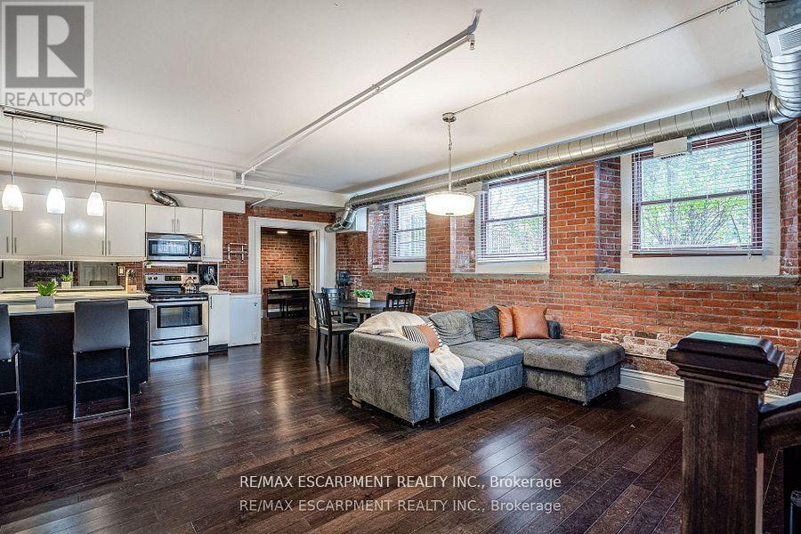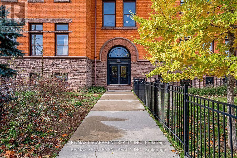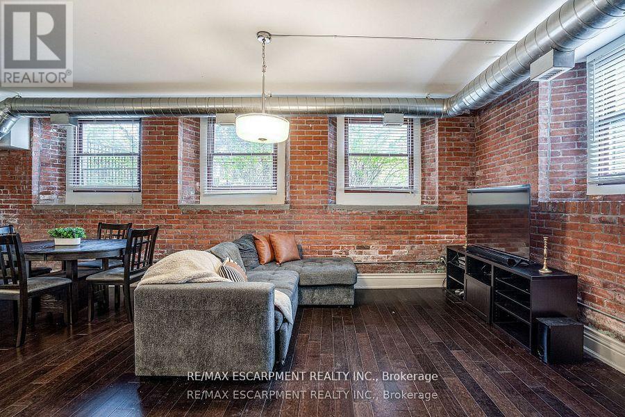 Discover a truly distinctive opportunity at the historic Stinson Lofts, where old-world character and modern comfort converge. This rare main-floor corner unit offers exceptional value for its generous square footage, highlighted by a remarkable 28 x 12 private patio with sweeping views of the community playground and the lush Hamilton escarpment. Inside, soaring ceilings, exposed brick walls, and rich hardwood floors preserve the timeless charm of the 1894 Stinson School, while an airy open-concept design provides a bright and inviting flow. The stylish kitchen features quartz counters with a breakfast bar, stainless steel appliances, and in-suite laundry, seamlessly opening to spacious living and dining areas ideal for entertaining. This unique layout features 2 primary suites, the first with dual closets and a modern three-piece bath. The second private suite has its own entrance off the dining area through french doors, with a large versatile accessway that is perfect for an office or extra storage. Believed to have once been the kindergarten classrooms of the original school, this spacious suite includes built-in shelving and a fall bathroom. It's time to move into this one-of-a-kind residence that offers a rare blend of heritage elegance, modern functionality, and unbeatable value. Includes one exclusive parking spot, P21. (id:4555)
