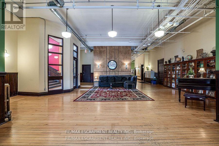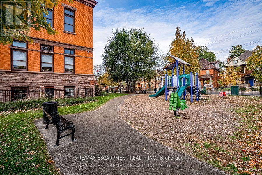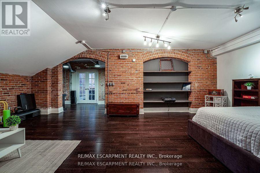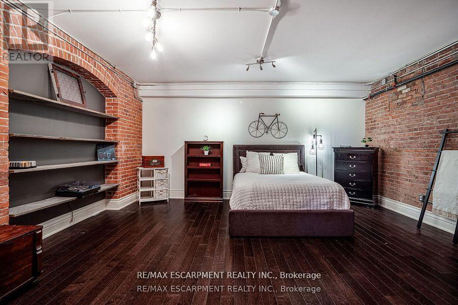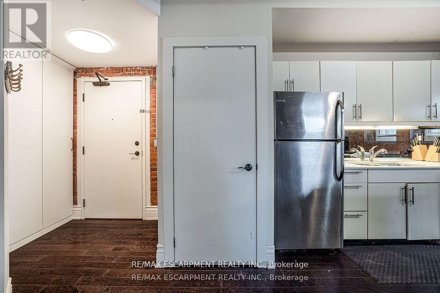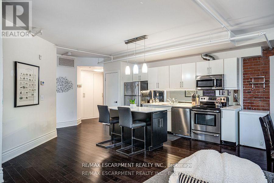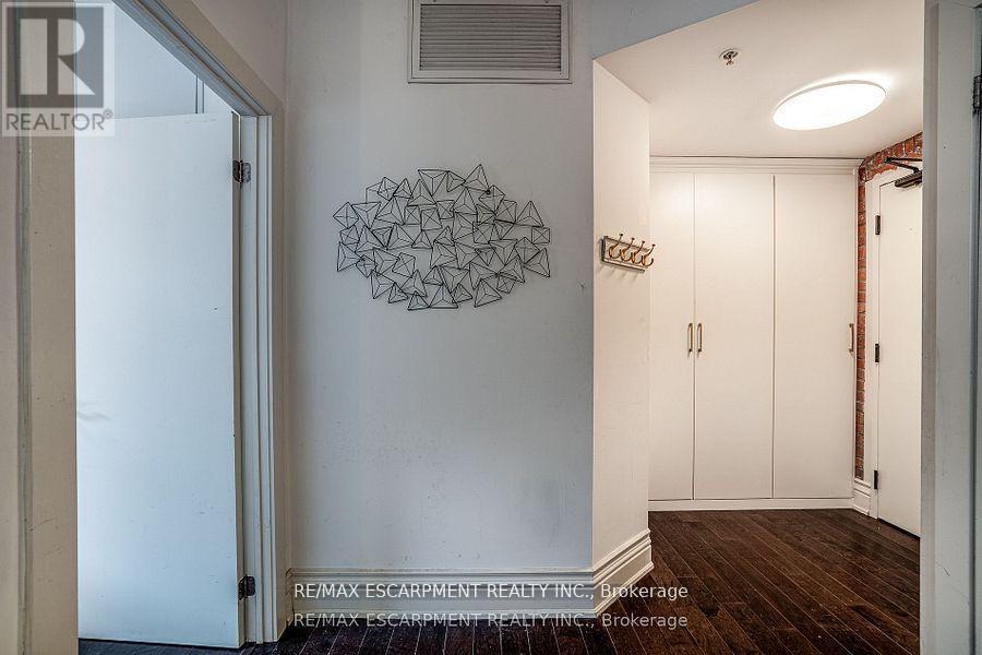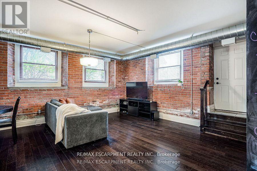 Discover a truly distinctive opportunity at the historic Stinson Lofts, where old-world character and modern comfort converge. This rare main-floor corner unit offers exceptional value for its generous square footage, highlighted by a remarkable 28 x 12 private patio with sweeping views of the community playground and the lush Hamilton escarpment. Inside, soaring ceilings, exposed brick walls, and rich hardwood floors preserve the timeless charm of the 1894 Stinson School, while an airy open-concept design provides a bright and inviting flow. The stylish kitchen features quartz counters with a breakfast bar, stainless steel appliances, and in-suite laundry, seamlessly opening to spacious living and dining areas ideal for entertaining. This unique layout features 2 primary suites, the first with dual closets and a modern three-piece bath. The second private suite has its own entrance off the dining area through french doors, with a large versatile accessway that is perfect for an office or extra storage. Believed to have once been the kindergarten classrooms of the original school, this spacious suite includes built-in shelving and a fall bathroom. It's time to move into this one-of-a-kind residence that offers a rare blend of heritage elegance, modern functionality, and unbeatable value. Includes one exclusive parking spot, P21. (id:4555)