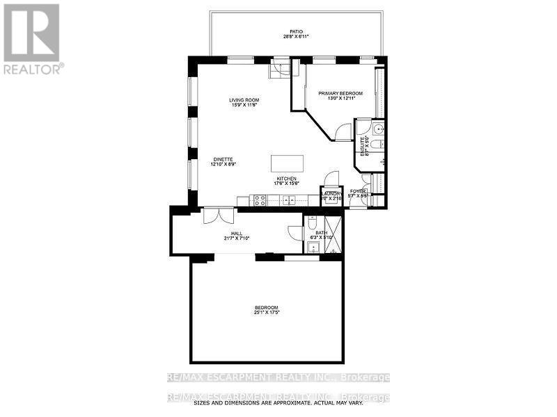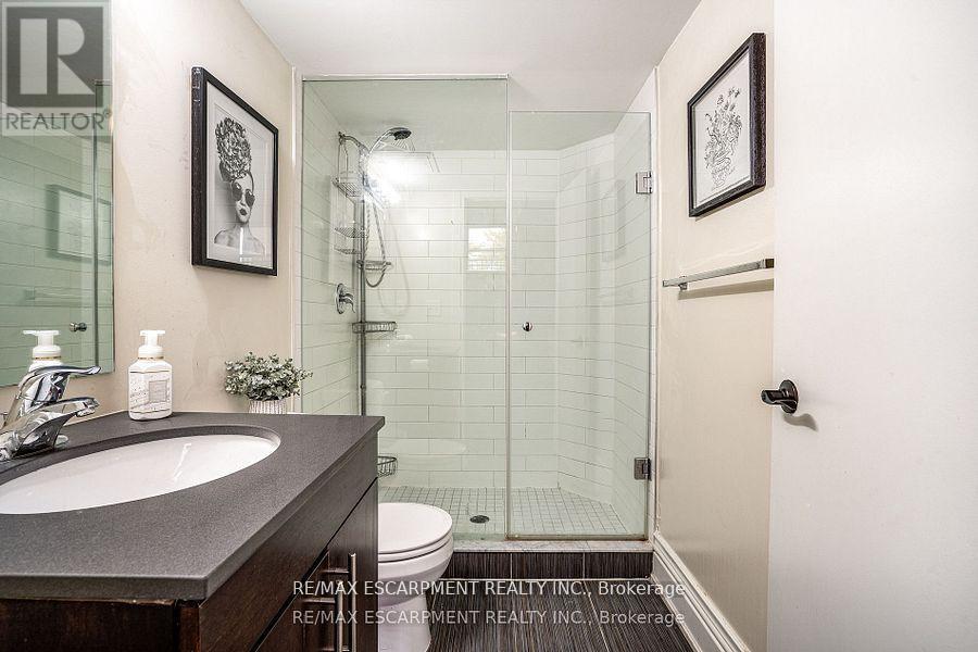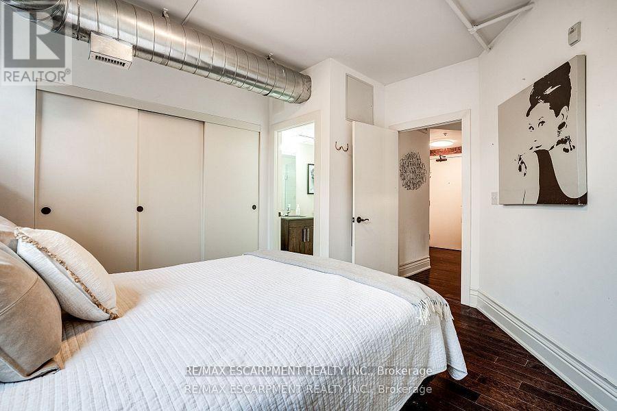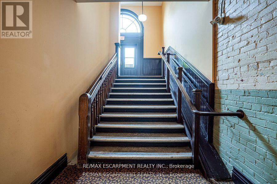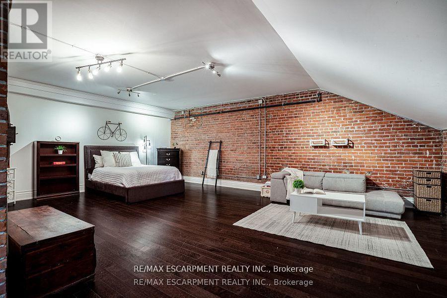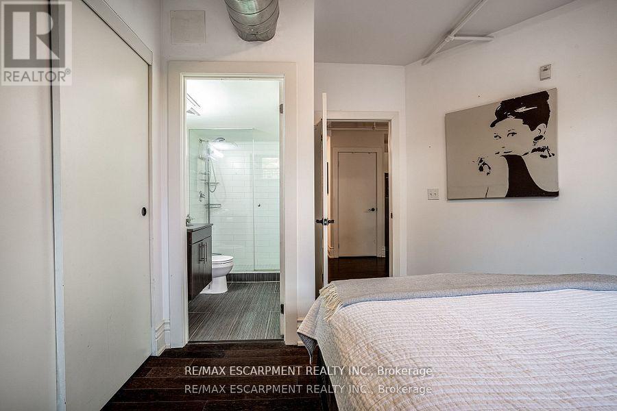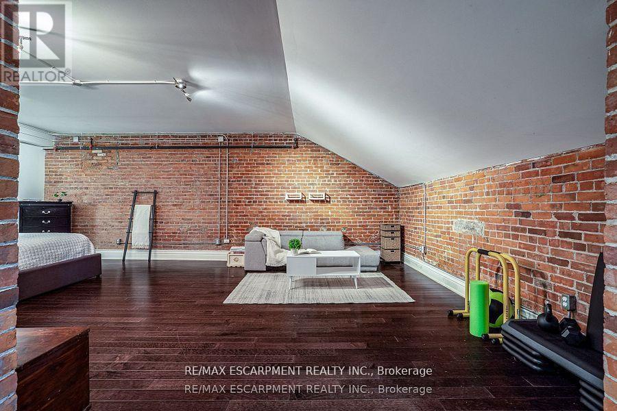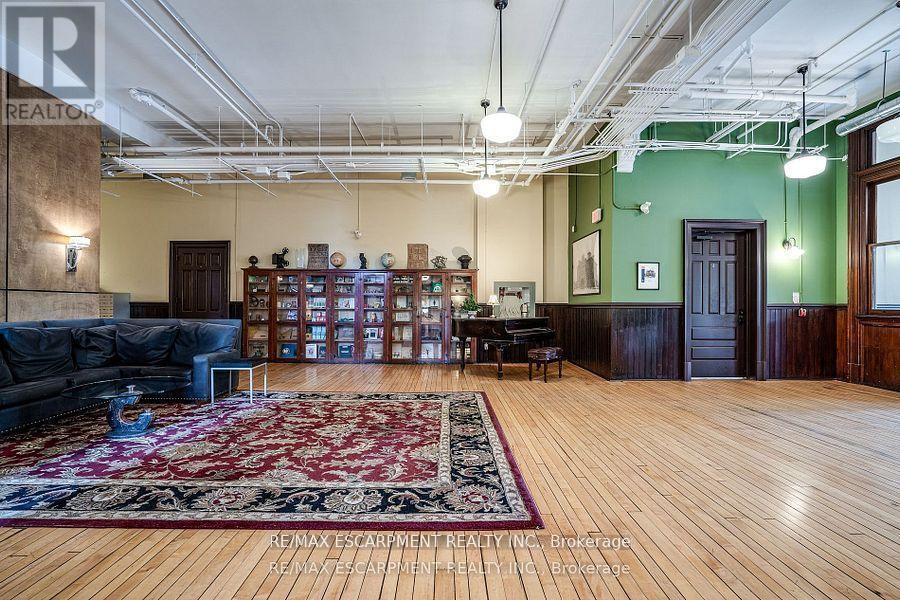 Discover a truly distinctive opportunity at the historic Stinson Lofts, where old-world character and modern comfort converge. This rare main-floor corner unit offers exceptional value for its generous square footage, highlighted by a remarkable 28 x 12 private patio with sweeping views of the community playground and the lush Hamilton escarpment. Inside, soaring ceilings, exposed brick walls, and rich hardwood floors preserve the timeless charm of the 1894 Stinson School, while an airy open-concept design provides a bright and inviting flow. The stylish kitchen features quartz counters with a breakfast bar, stainless steel appliances, and in-suite laundry, seamlessly opening to spacious living and dining areas ideal for entertaining. This unique layout features 2 primary suites, the first with dual closets and a modern three-piece bath. The second private suite has its own entrance off the dining area through french doors, with a large versatile accessway that is perfect for an office or extra storage. Believed to have once been the kindergarten classrooms of the original school, this spacious suite includes built-in shelving and a fall bathroom. It's time to move into this one-of-a-kind residence that offers a rare blend of heritage elegance, modern functionality, and unbeatable value. Includes one exclusive parking spot, P21. (id:4555)