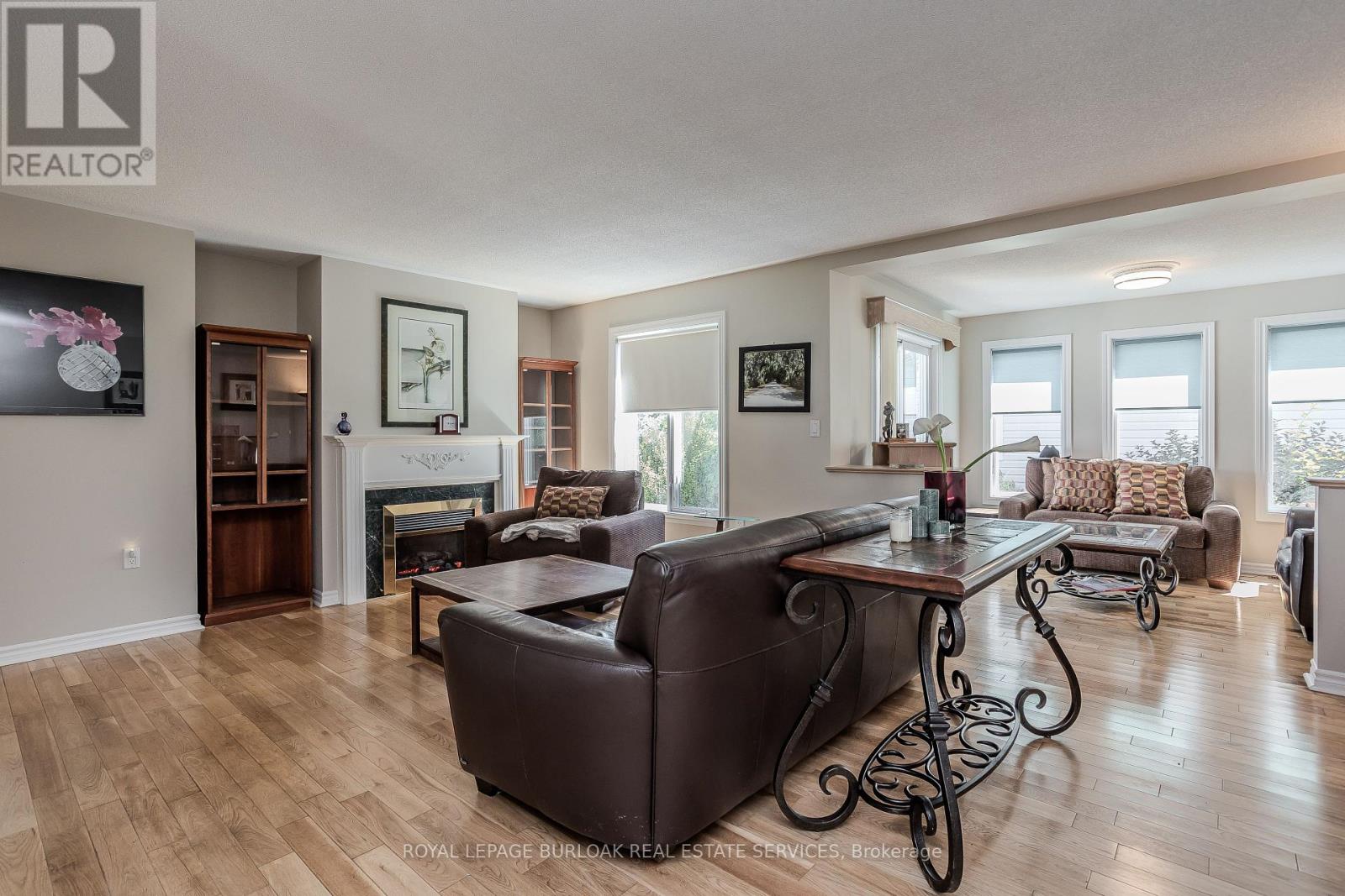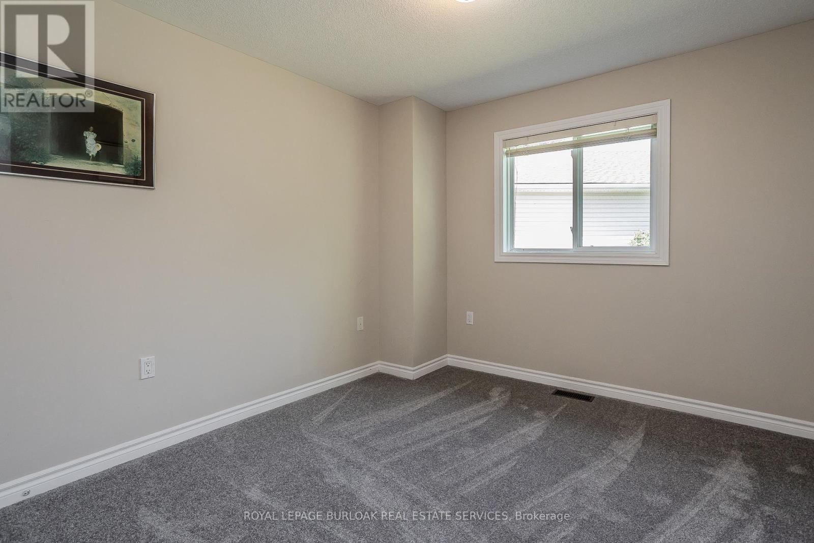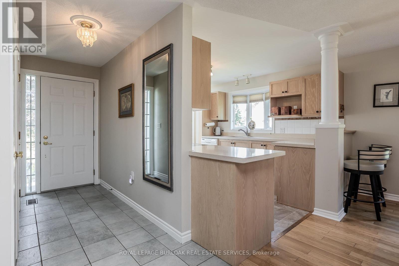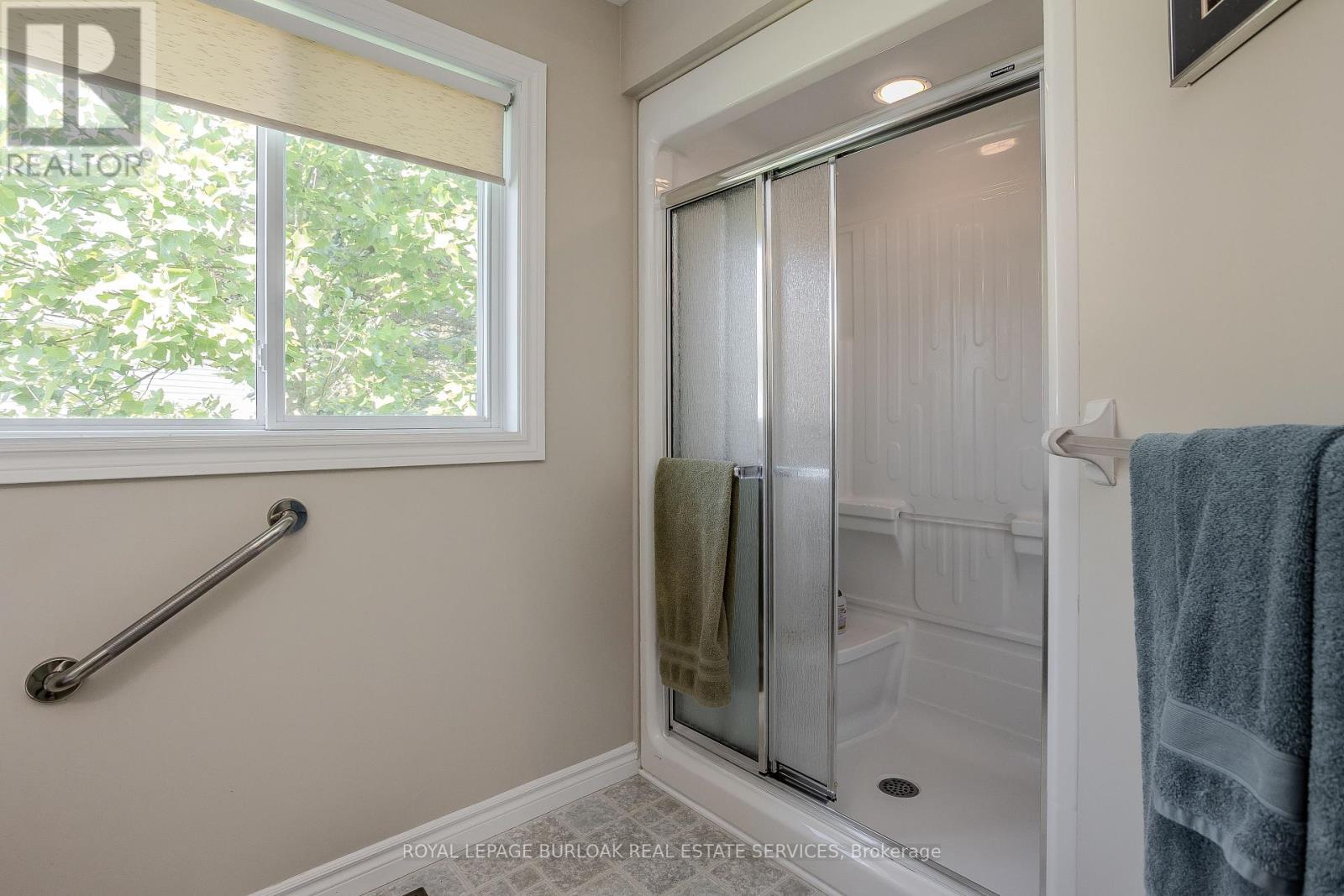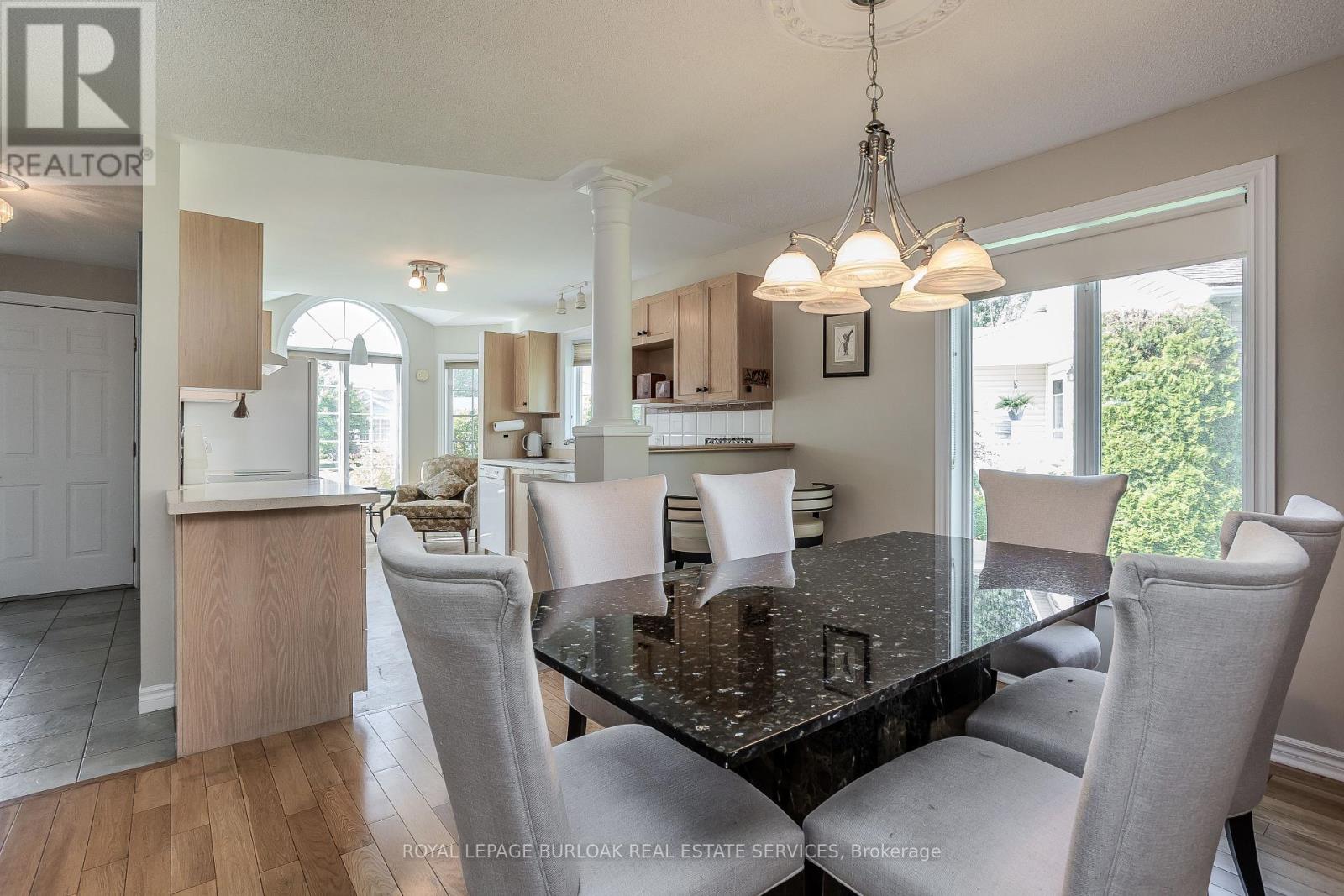 Welcome to this impeccably maintained bungalow nestled in the vibrant Antrim Glen 55+community. Ideally situated on a quiet court with picturesque curb appeal. Featuring 2+1 beds 2baths & a rare double car garage this true ground floor level bungalow is ideal for downsizers. Ideal open concept layout is flooded with natural light from the abundance of windows. The living room, adorned with a cozy fireplace (propane), invites relaxation with a versatile den/sitting area with walkout to the backyard patio. The open concept dining room is adjacent to the eat-in kitchen with ample counter and cabinet space. Main floor primary suite includes a3pc ensuite & walk-in closet. Additional bedroom offers easy access to the 4pc bath with modified tub entry & convenient laundry on the main. Finished lower level boasts a recreation room, bedroom, workshop, and additional storage/utility spaces awaiting your personal touch. Embrace this opportunity for refined living in a supportive community with an inground pool, clubhouse, community events & more. Very reasonable Land Lease of $975 + taxes of $230.80 (estimated). Don't delay on this turnkey gem! (id:4555)