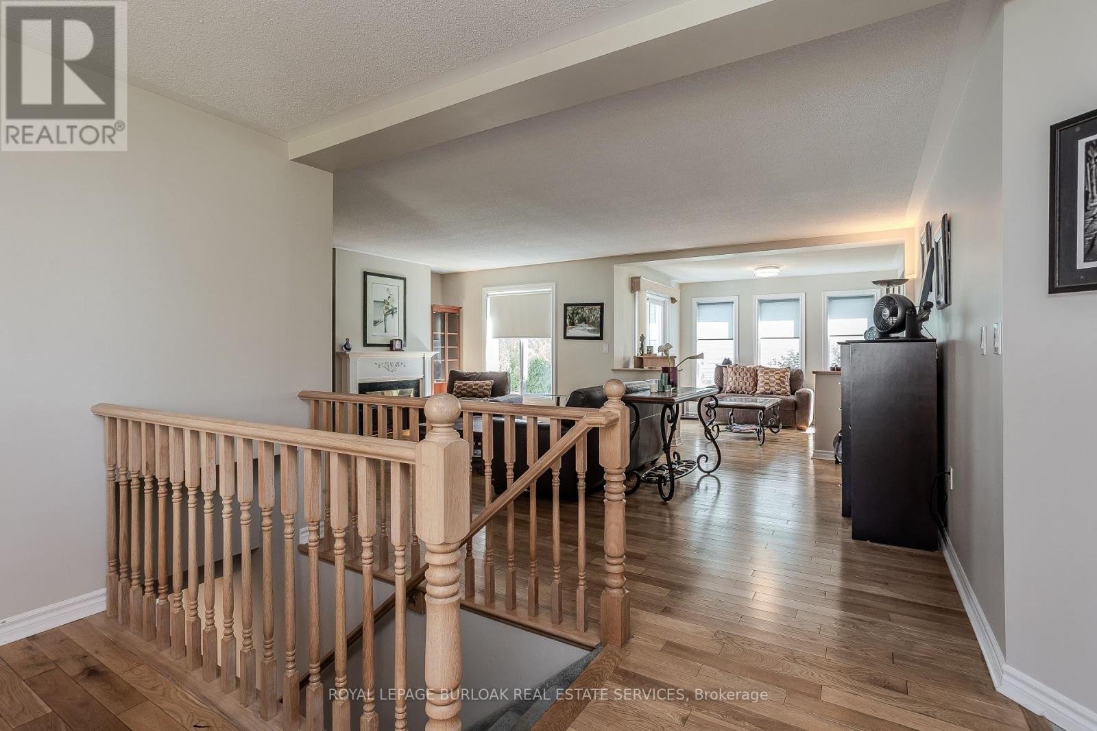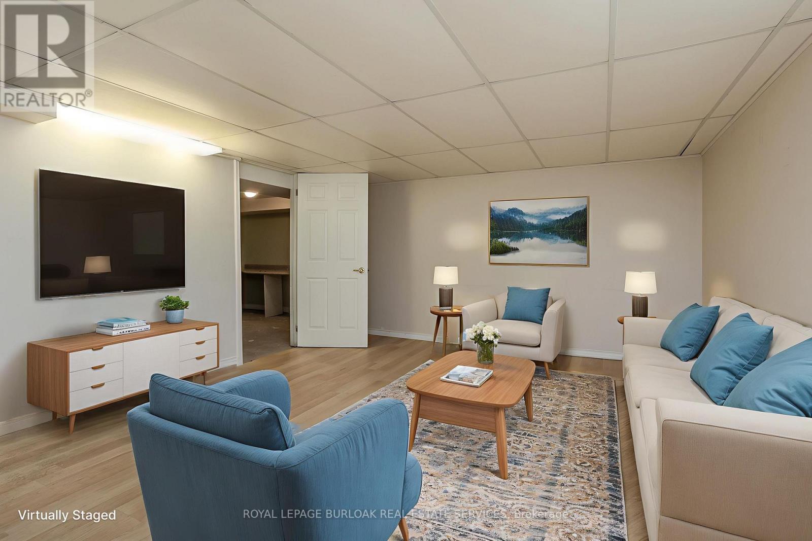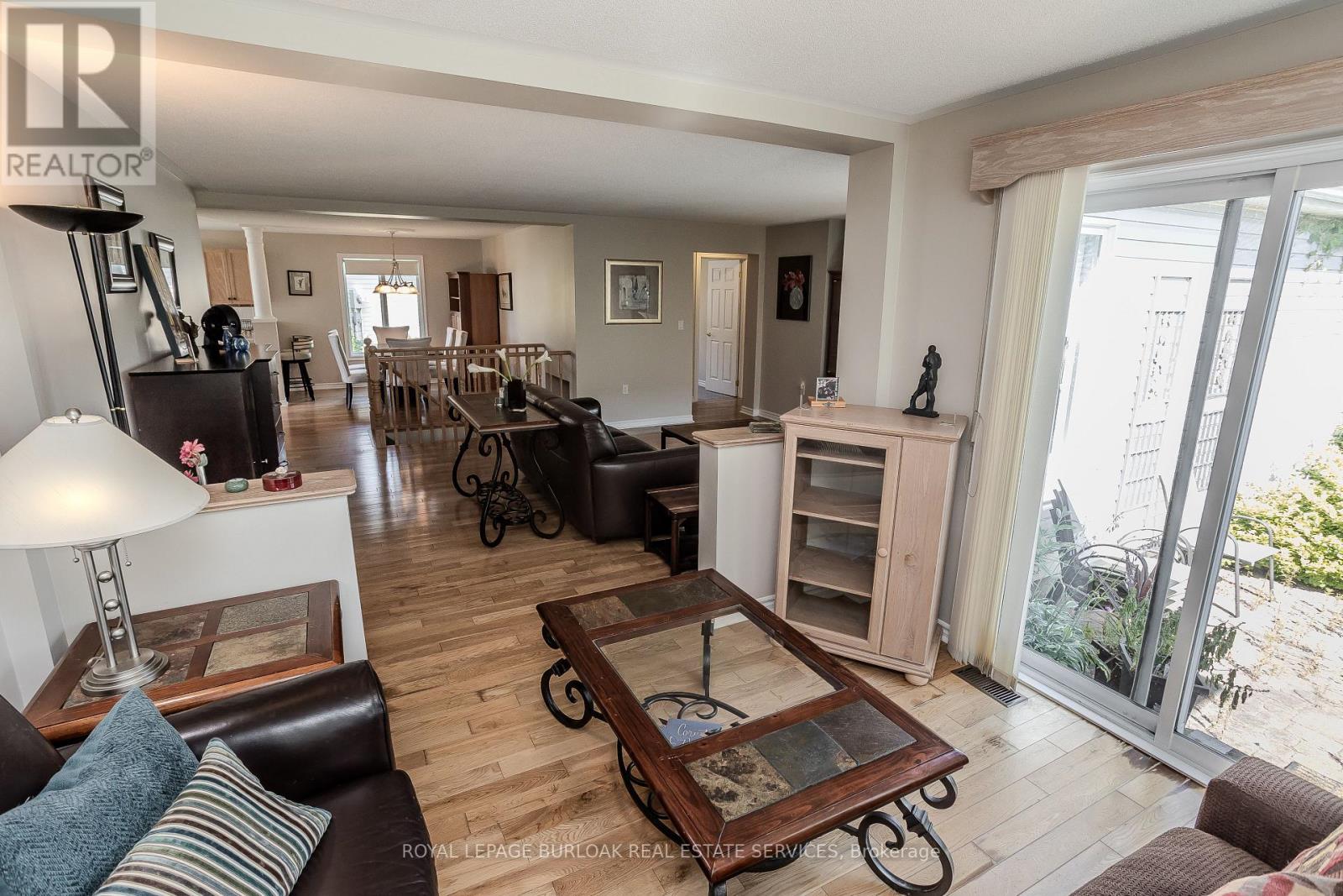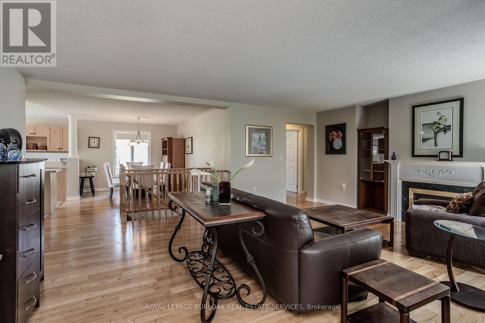 Welcome to this impeccably maintained bungalow nestled in the vibrant Antrim Glen 55+community. Ideally situated on a quiet court with picturesque curb appeal. Featuring 2+1 beds 2baths & a rare double car garage this true ground floor level bungalow is ideal for downsizers. Ideal open concept layout is flooded with natural light from the abundance of windows. The living room, adorned with a cozy fireplace (propane), invites relaxation with a versatile den/sitting area with walkout to the backyard patio. The open concept dining room is adjacent to the eat-in kitchen with ample counter and cabinet space. Main floor primary suite includes a3pc ensuite & walk-in closet. Additional bedroom offers easy access to the 4pc bath with modified tub entry & convenient laundry on the main. Finished lower level boasts a recreation room, bedroom, workshop, and additional storage/utility spaces awaiting your personal touch. Embrace this opportunity for refined living in a supportive community with an inground pool, clubhouse, community events & more. Very reasonable Land Lease of $975 + taxes of $230.80 (estimated). Don't delay on this turnkey gem! (id:4555)