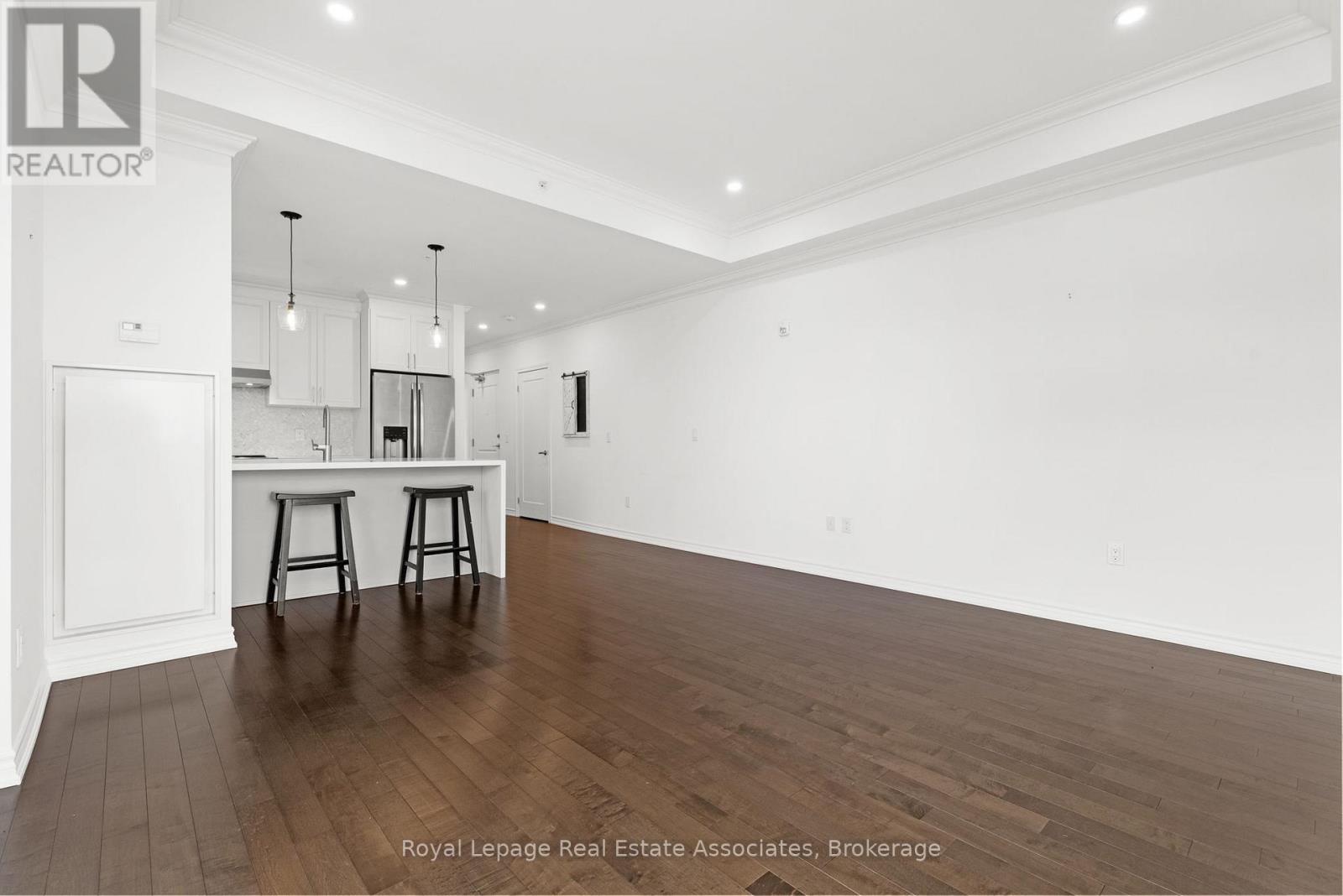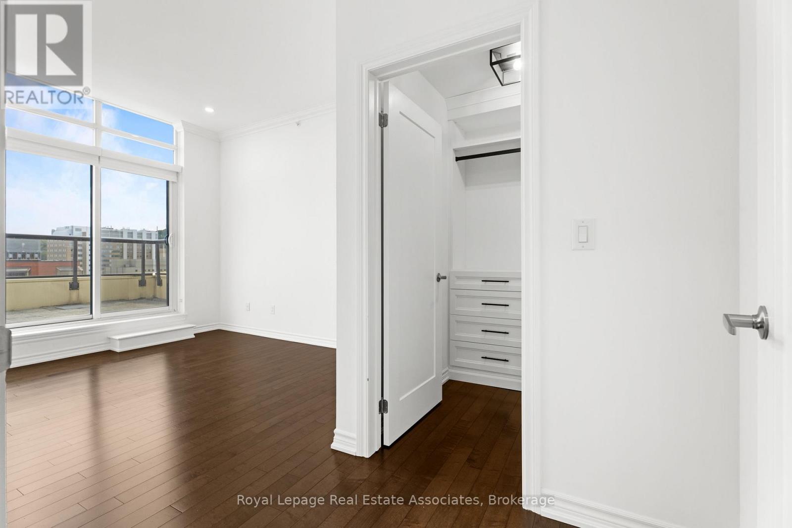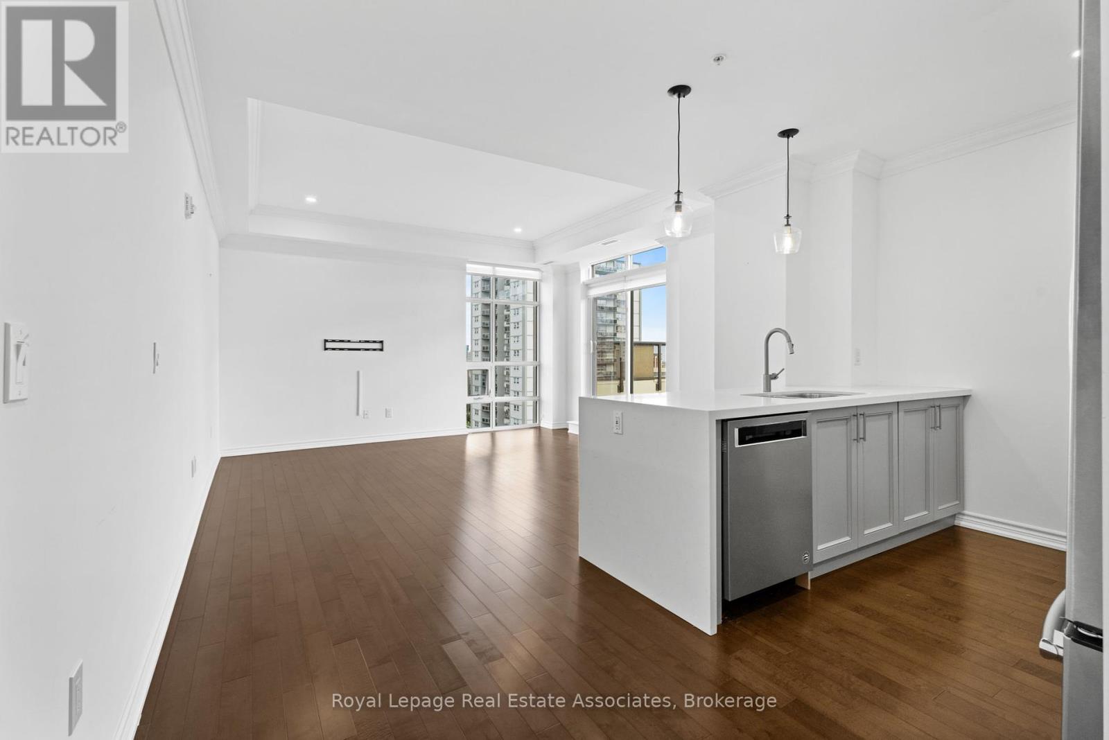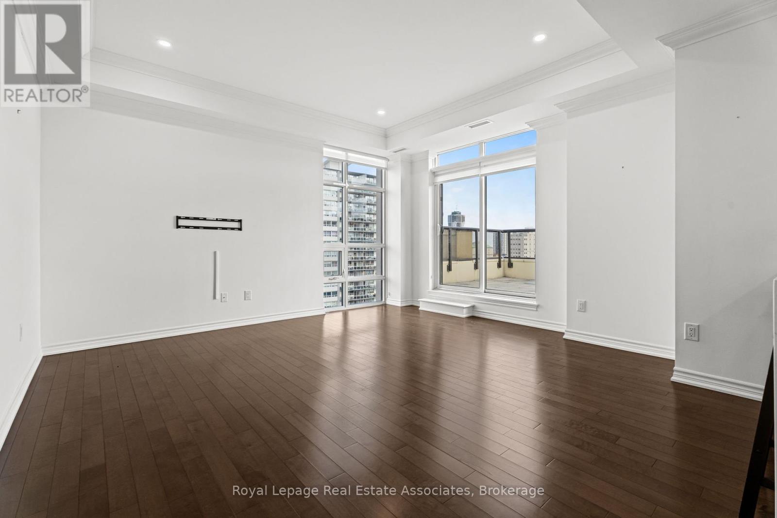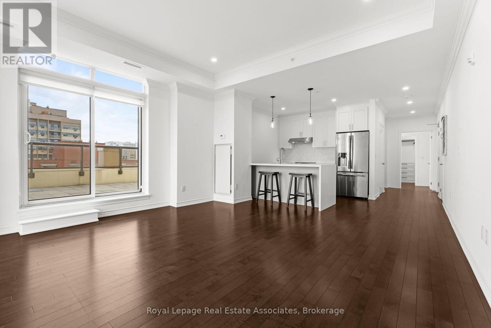 Discover upscale urban luxury in this exceptional penthouse at City Square residences. Flooded with natural light from floor-to-ceiling windows and warmed by maple hardwood floors, the open-concept kitchen features stainless steel appliances and in-suite laundry. The primary suite offers a custom walk-in closet, while your private 450 sq ft terrace accessible from the living area and bedroom boasts panoramic city skyline views, perfect for entertaining. Enjoy geothermal heating and cooling for year-round comfort. In the heart of vibrant Durand, walk to shops, restaurants, parks, hospitals, and GO Transit. Amenities include two gyms, media room, hospitality space, and bike storageplus two prime parking spots included in the lease. Tenant pays hydro & internet. (id:4555)