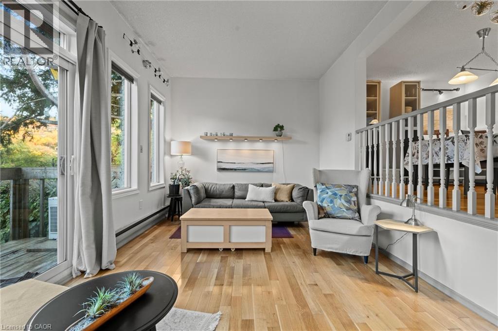 Beautiful end unit townhouse located in the highly desirable Ainslie Wood West Hamilton area. This is one that has to be seen to be appreciated. Nestled among mature trees, this home is one of the few that offers a walk-out from the living room to a private backyard with stunning escarpment views, and breathtaking sunrises and sunsets. The entertaining area offers a bright light filled living room with sliding patio door with transom window, and a spacious dining area just off the kitchen. There is also a main floor bedroom/den that’s perfect as a kids’ playroom, additional bedroom/guest room, or home office—flexible space to suit your family’s needs. The upper level offers a 4-piece bathroom with an updated vanity & 3 spacious bedrooms (primary with oversized closet and all with custom closet doors). Hardwood floors on the upper levels. Finished basement complete with a convenient powder room—ideal for extra living space, a play area, or a family rec room. Equipped with an efficient Mitsubishi ductless heat pump split unit system for both heating and air conditioning, ensuring year-round comfort. Parking for two vehicles with both a garage and driveway space. Just minutes from Tiffany Falls, scenic trails, parks, restaurants, everyday amenities, public transit, Highway 403, Lincoln M. Alexander Pkwy, and McMaster University/Hospital. Book your personal tour today and discover all this home has to offer (id:4555)
